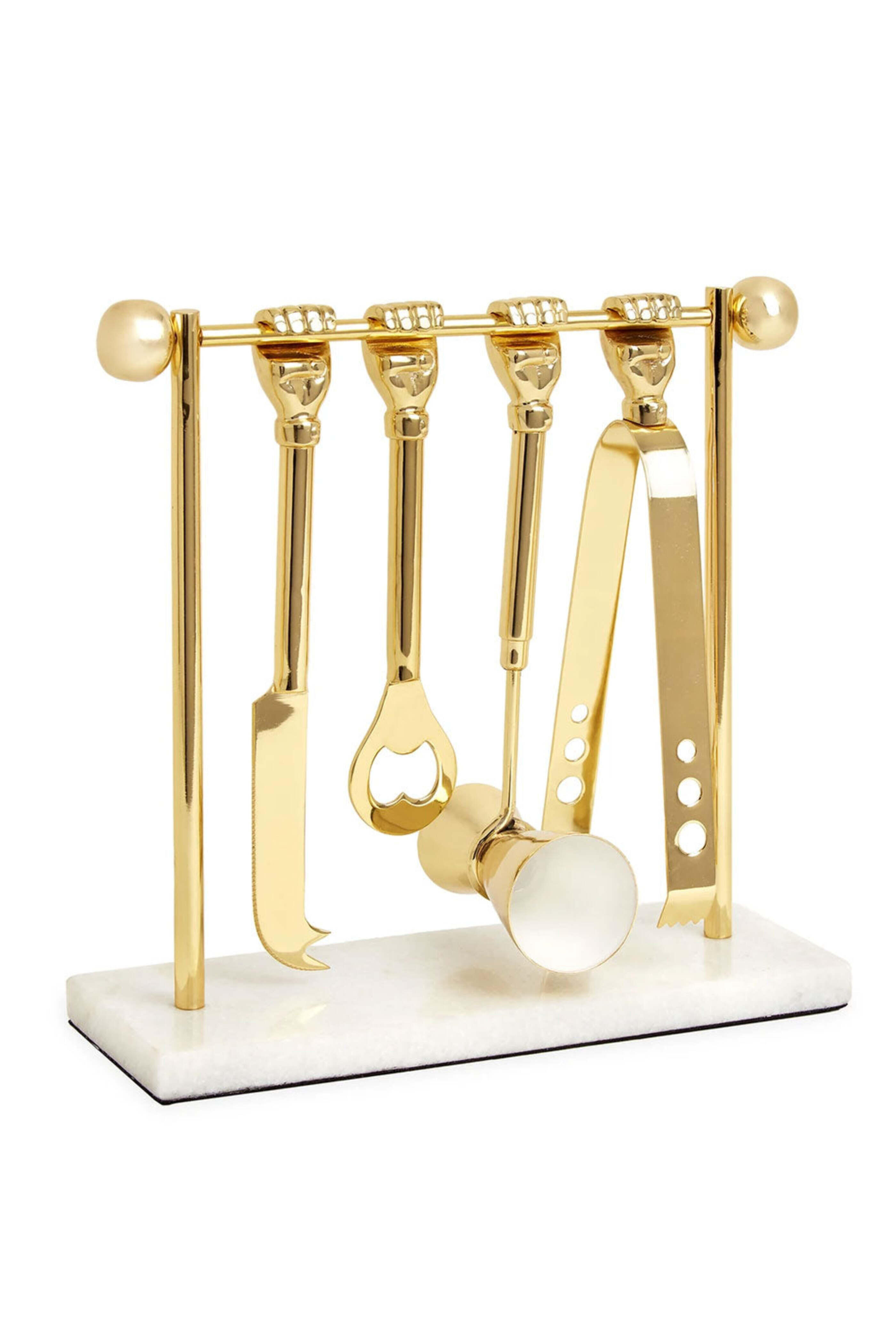 Jonathan Adler Barbell Barware Set. Overall: 9.25" W, 3.75" D, 9.5" H. Tools: Durable stainless steel construction with brass-plated finish and food safe lacquer coating. Solid brass handles.. Base: solid marble with solid brass frame. Includes ice tongs, bottle opener, double jigger, and knife. Gift box included. Hand wash only.