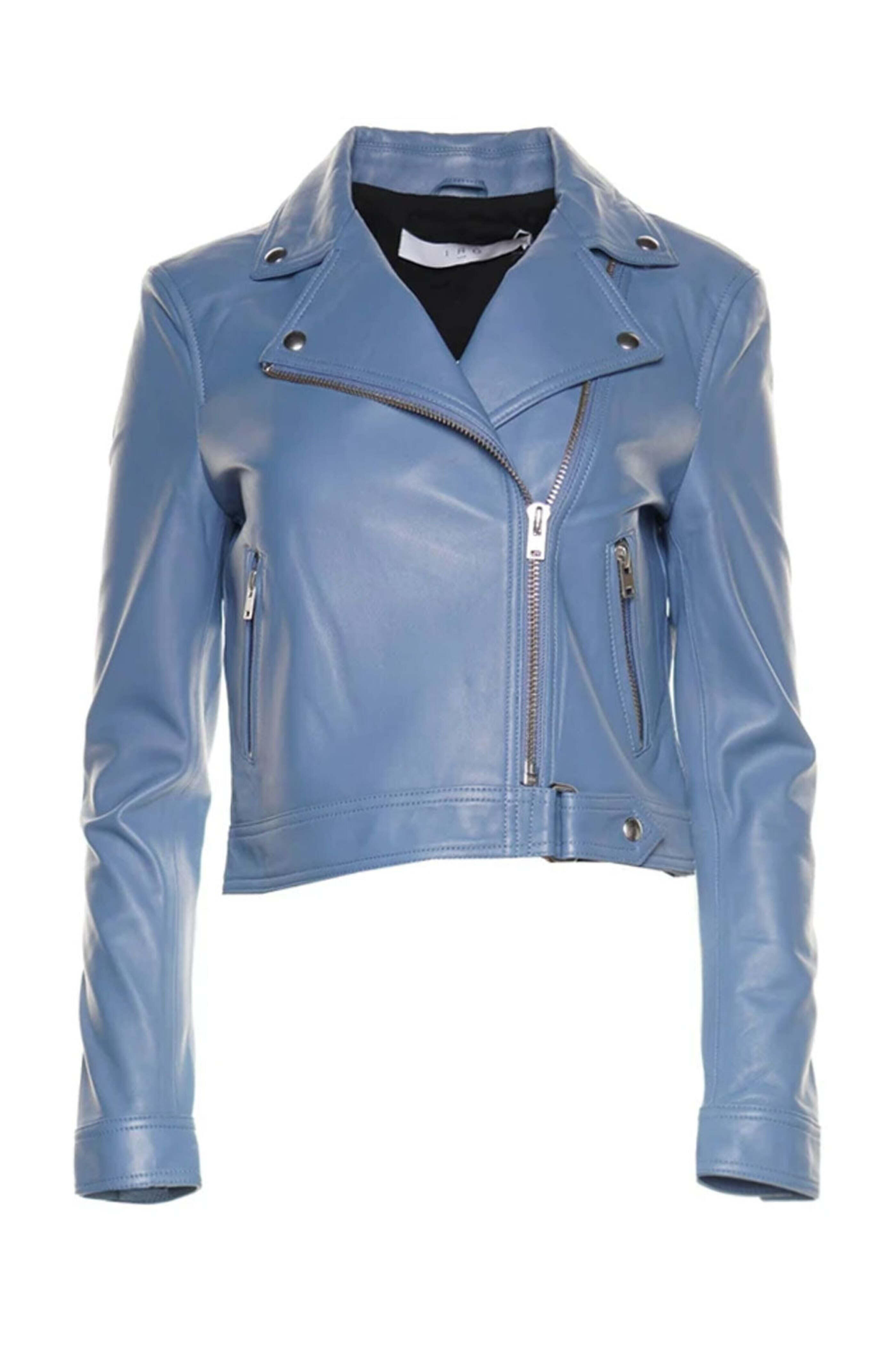 IRO Light Blue Leather Kolmar Jacket. Notch collar. Long sleeves; snap button cuffs. Off center zip front closure. Snap button tab closure. Side zip pockets. Moto jacket silhouette. Lined. 100% leather.