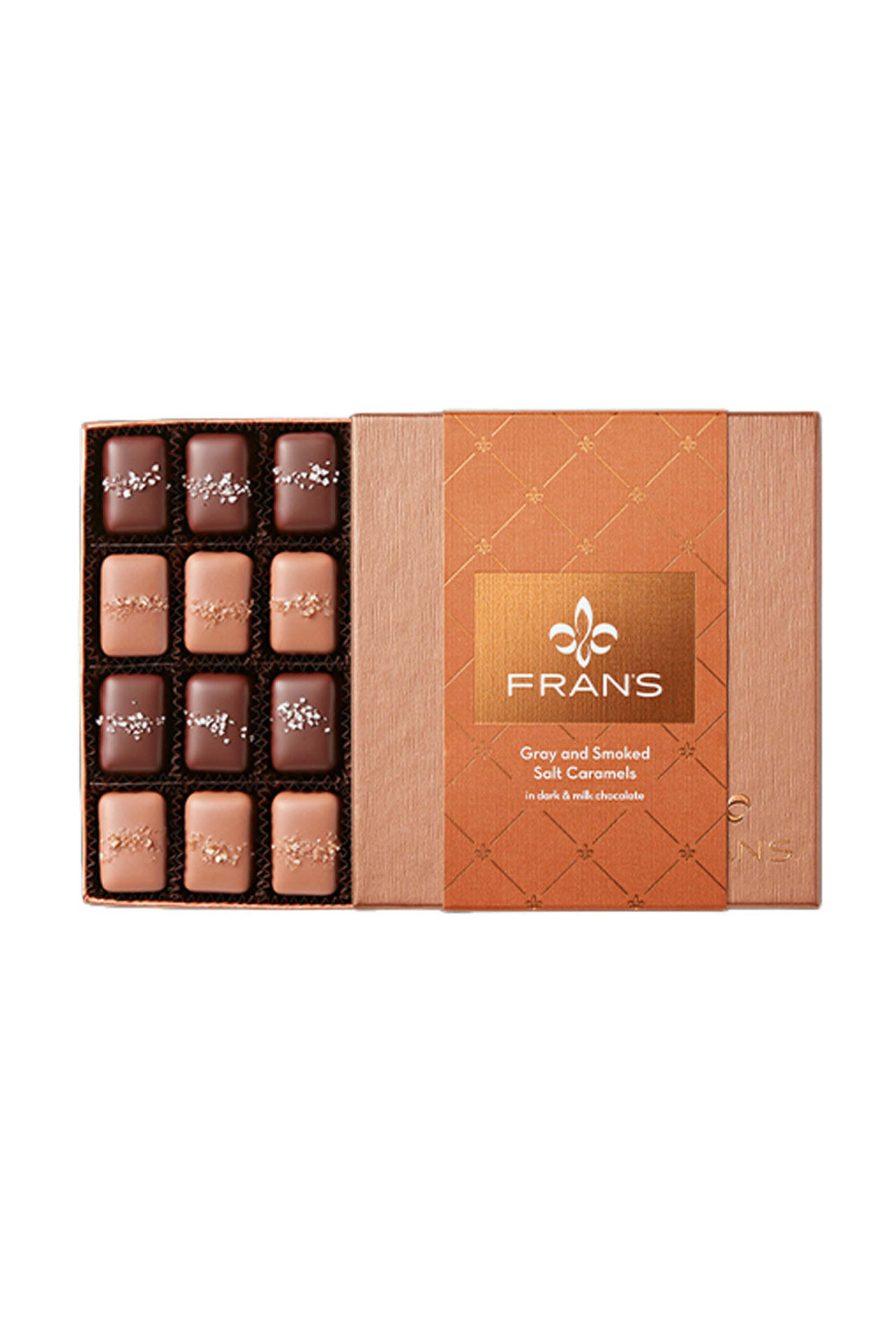 - Frans Chocolate 12 Piece Gray and Smoked Salt Caramels in Dark and Milk Chocolate