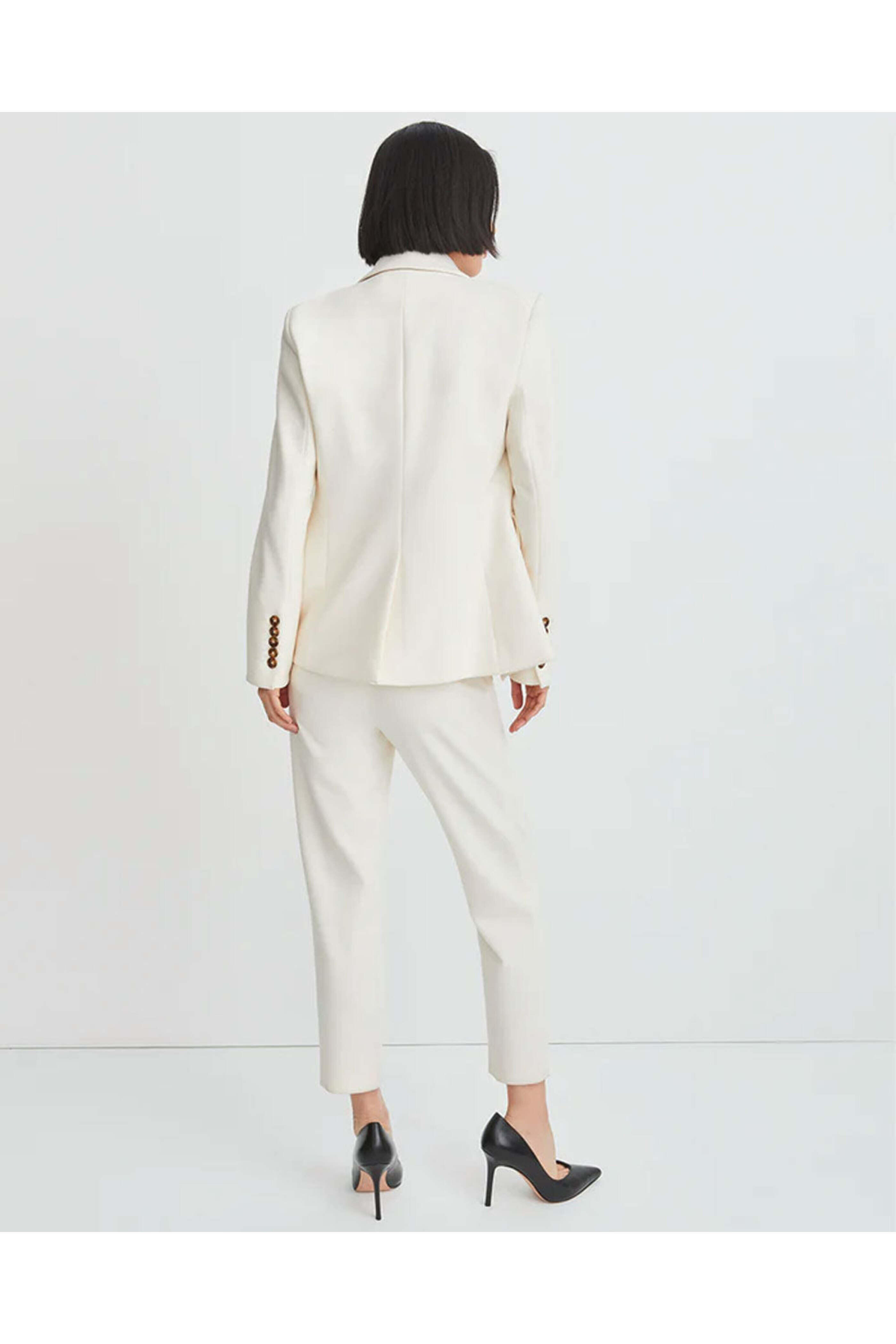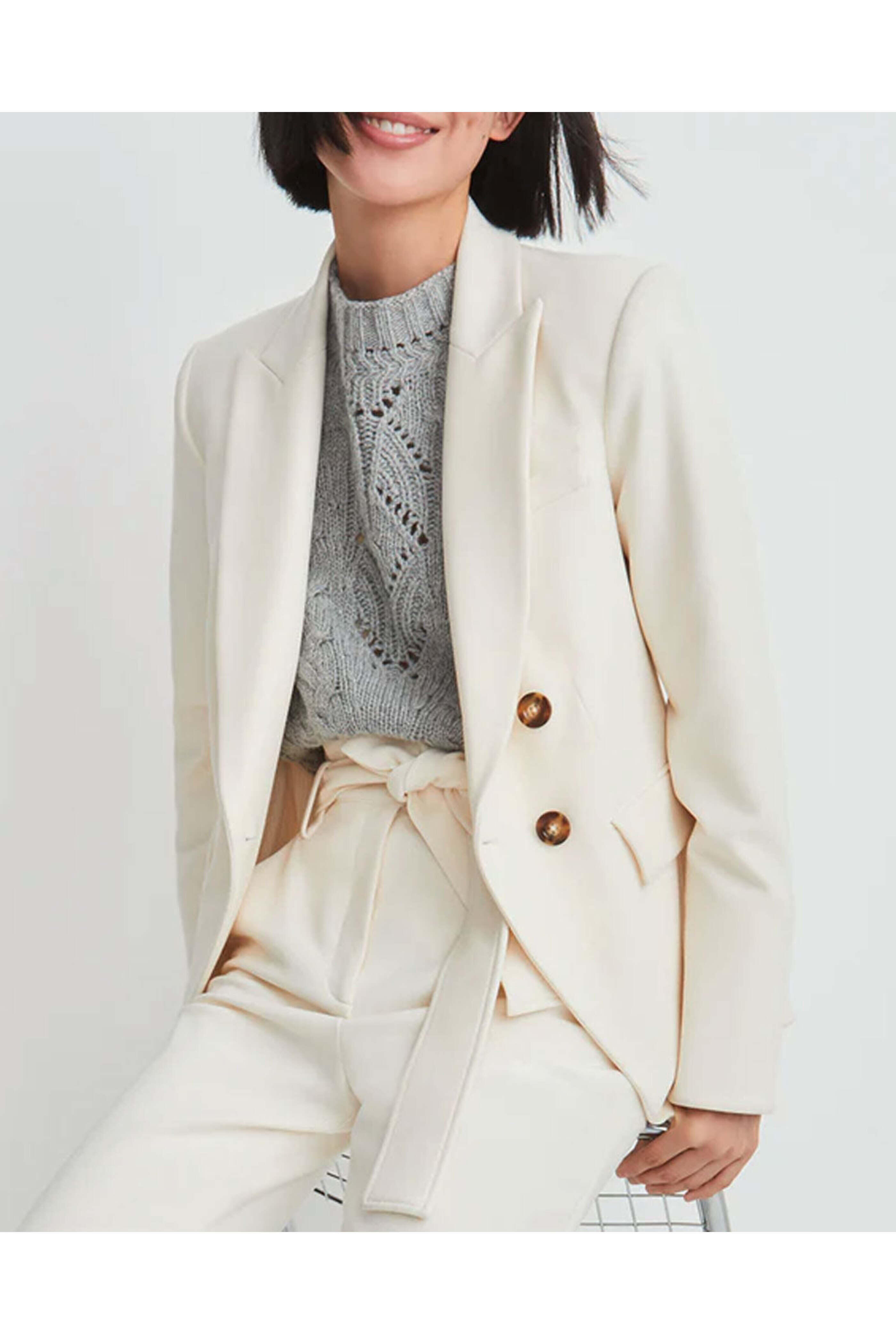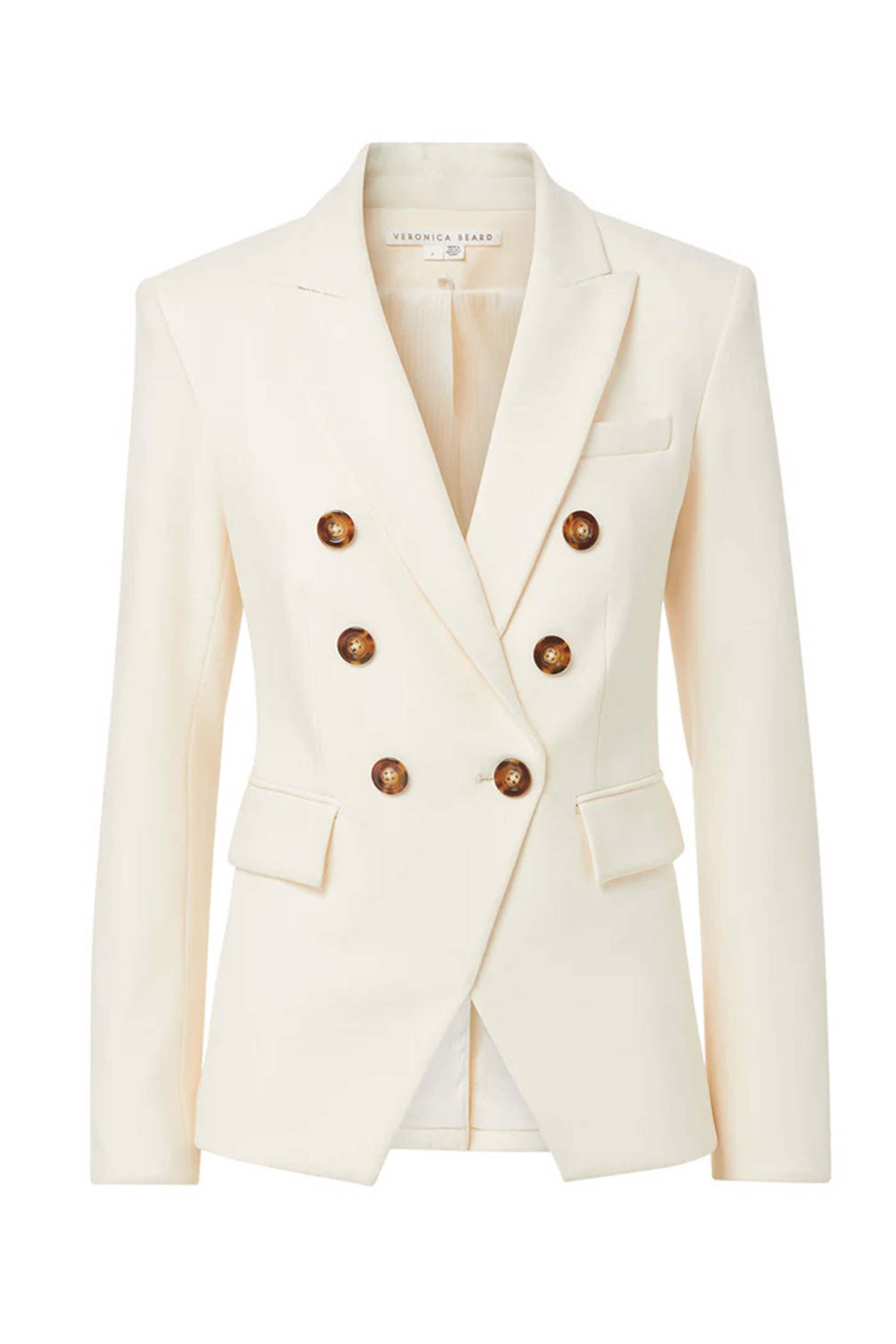 Veronica Beard Ecru Miller Dickey Jacket. Peaked lapels. Shoulder pads. Long sleeves; button cuffs. Single chest welt pocket. Side flap pockets. Tailored fit. Lined. VB Dickey Compatible. 63% Polyester, 27% Viscose, 7% Cotton, 3% Elastane.