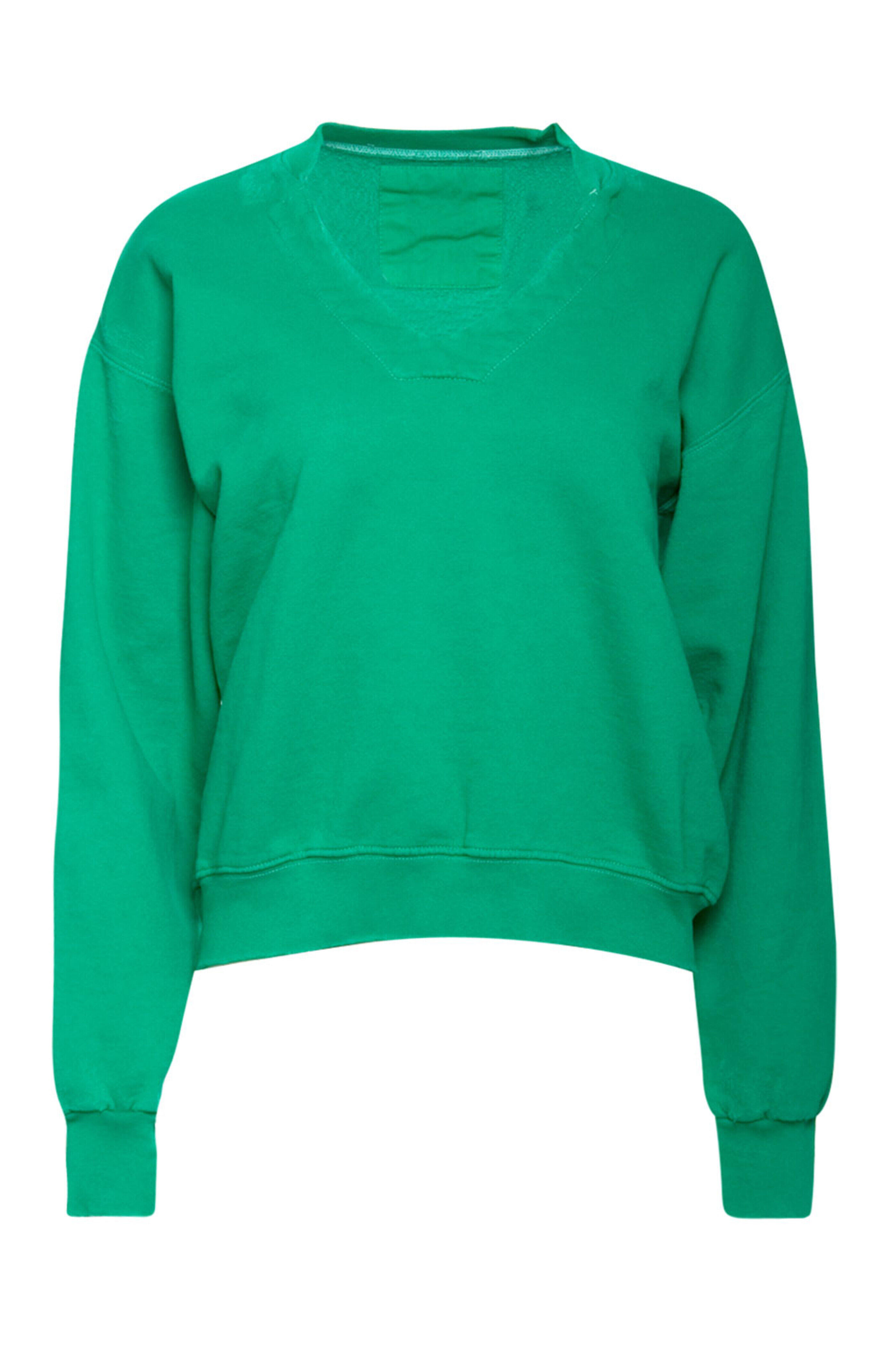 Rachel Comey Kelly Green Covey Sweatshirt. V neck. Drop shoulders. Long sleeves. Relaxed fit. Cropped length. Made in the USA. 90% Cotton, 10% Polyester.