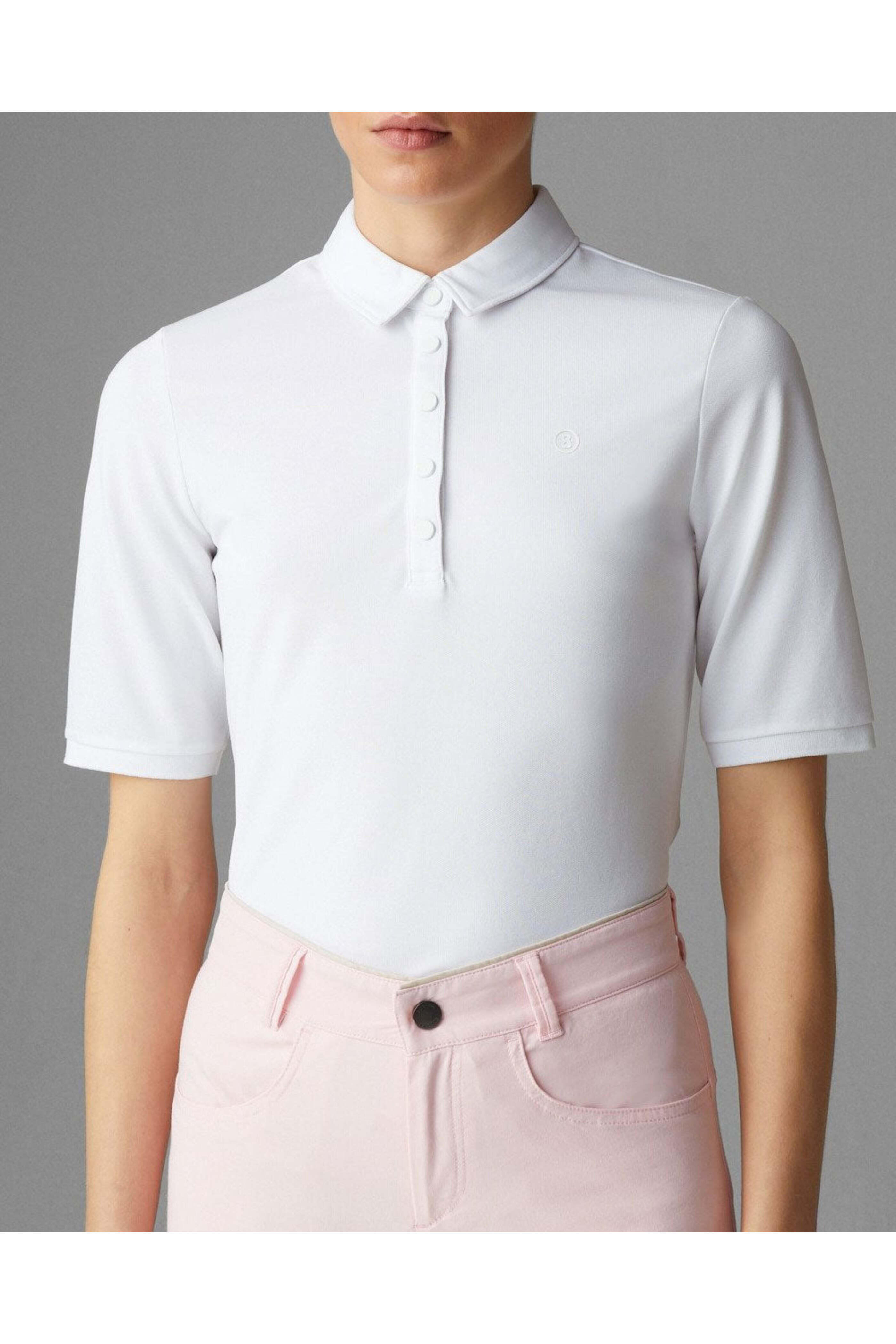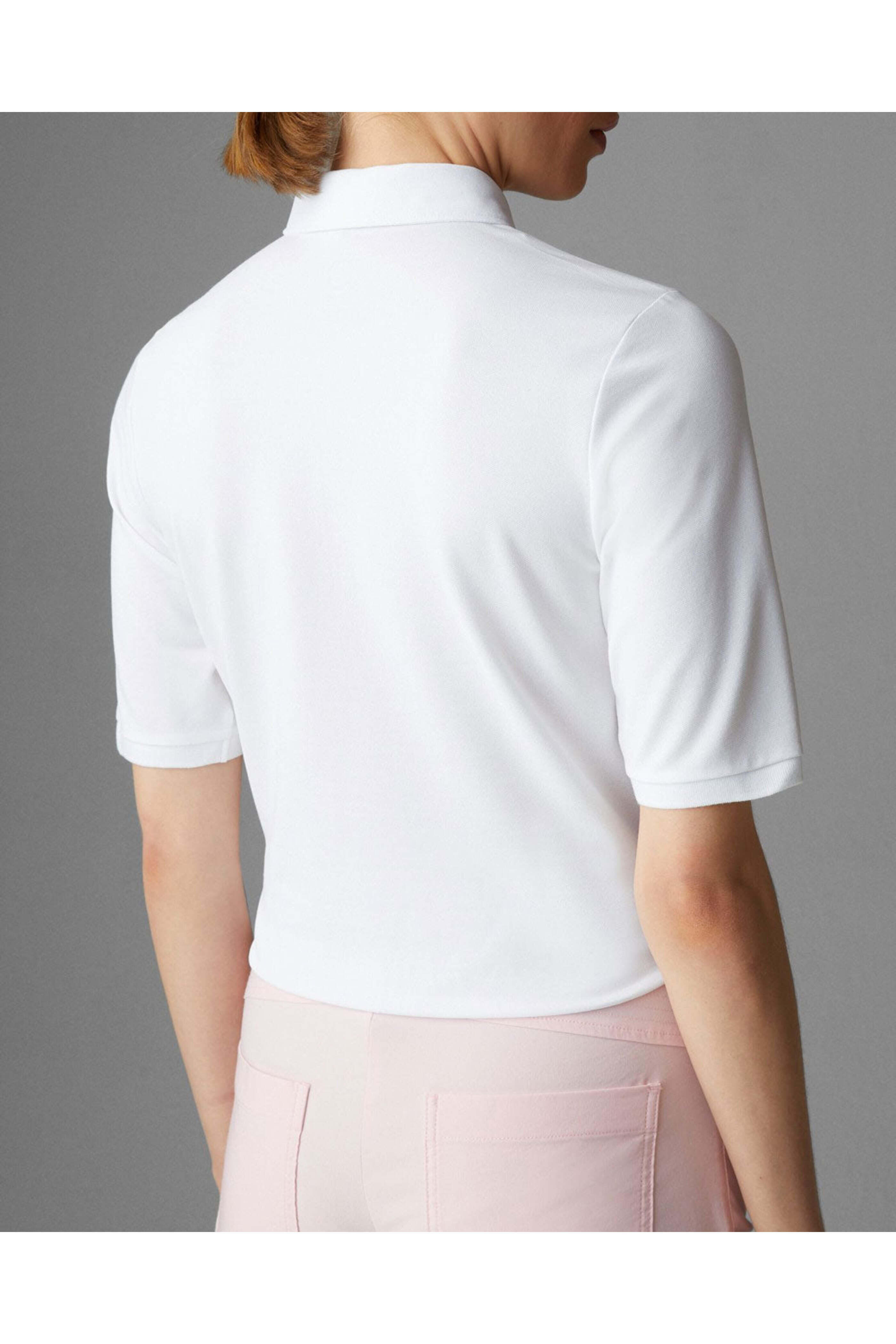 Bogner White Tammy Polo. Polo collar. Short sleeves. Quarter button placket. Slim silhouette. Straight hem. 51% cotton, 45% polyester, 4% elastane.