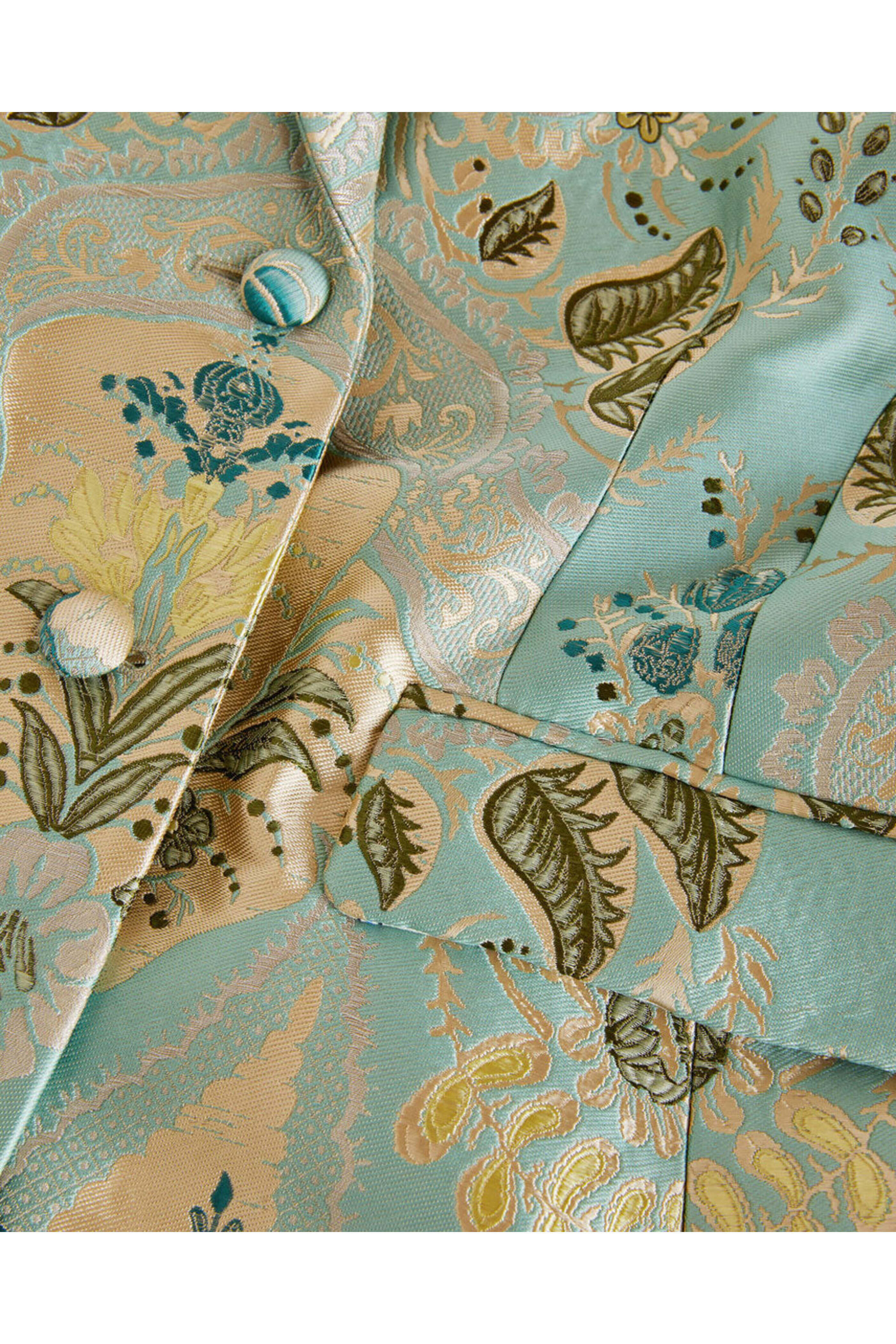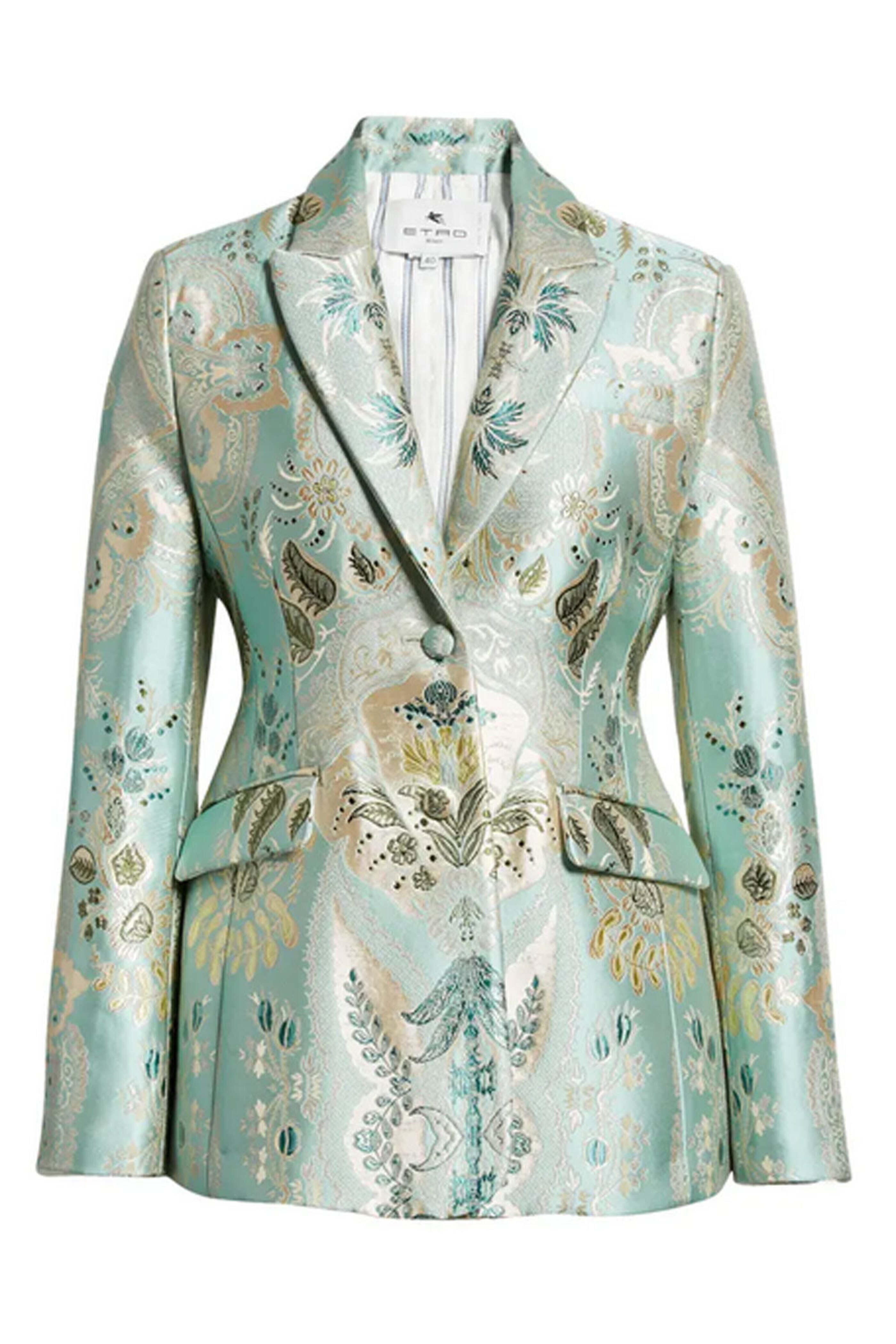 Etro Blue Paisley Giacca Dreams Jacket. Peak lapel. Long sleeves; self-cover button cuffs. Button front closure; self-cover buttons. Single chest welt pocket. Hip flap pockets. Tailored fit. Back hem vent. Made in Italy. 57% acetate, 27% polyester, 11% viscose, 5% metallic fiber outer, 52% viscose, 48% acetate lining.