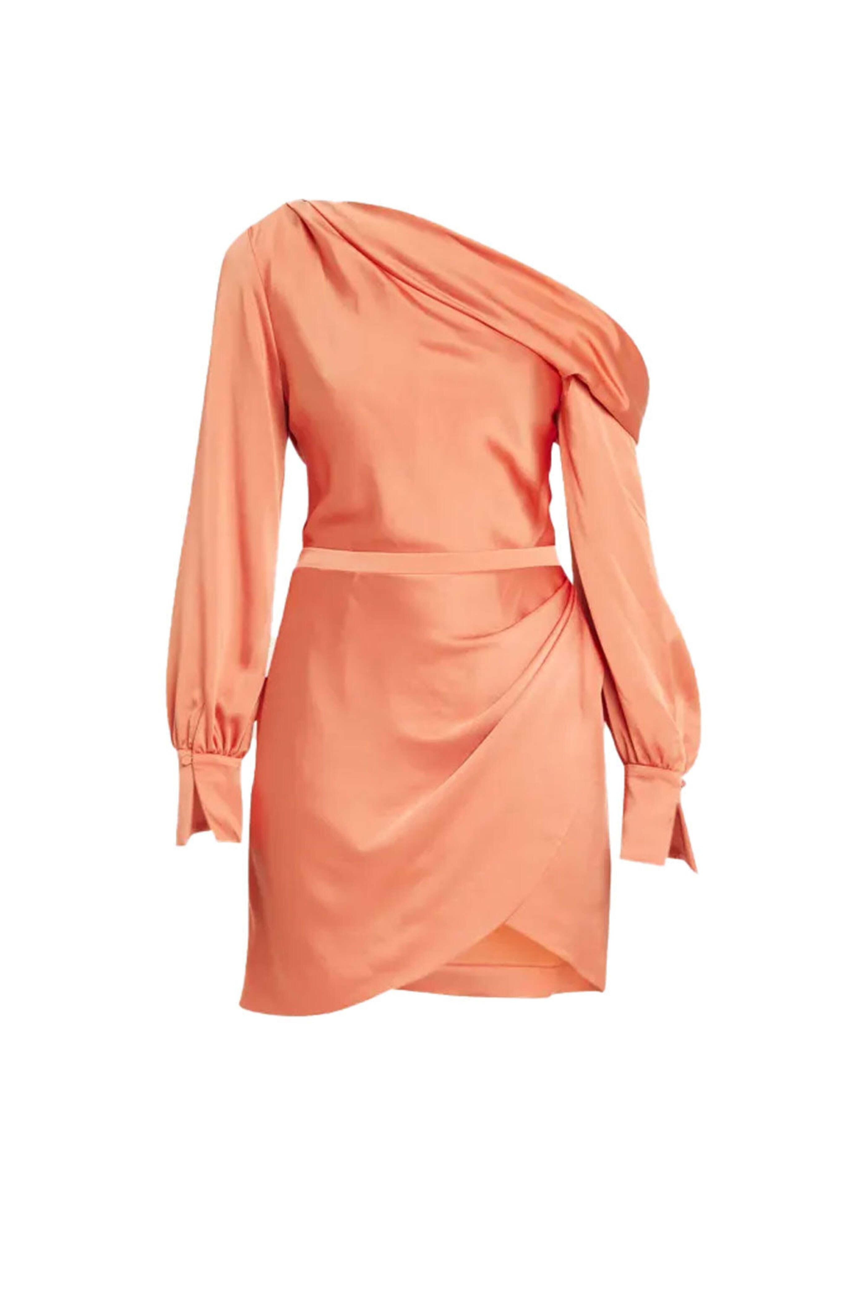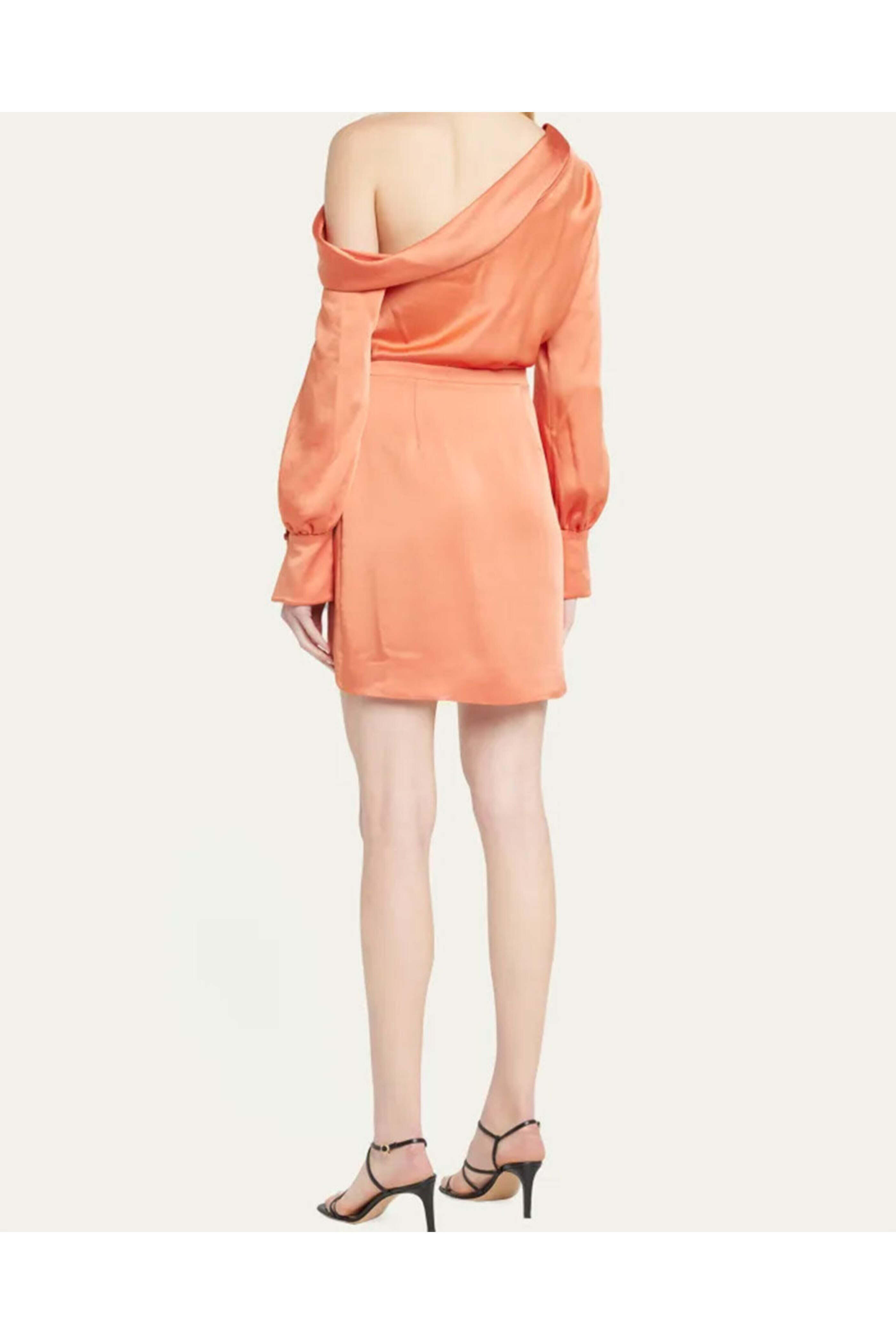 SIMKHAI Coral Cameron Classic Woven Dress. One-shoulder neckline. Long puff sleeves; slit cuffs. Cinched waist. A-line silhouette. Concealed side zipper. Mini. Acetate.
