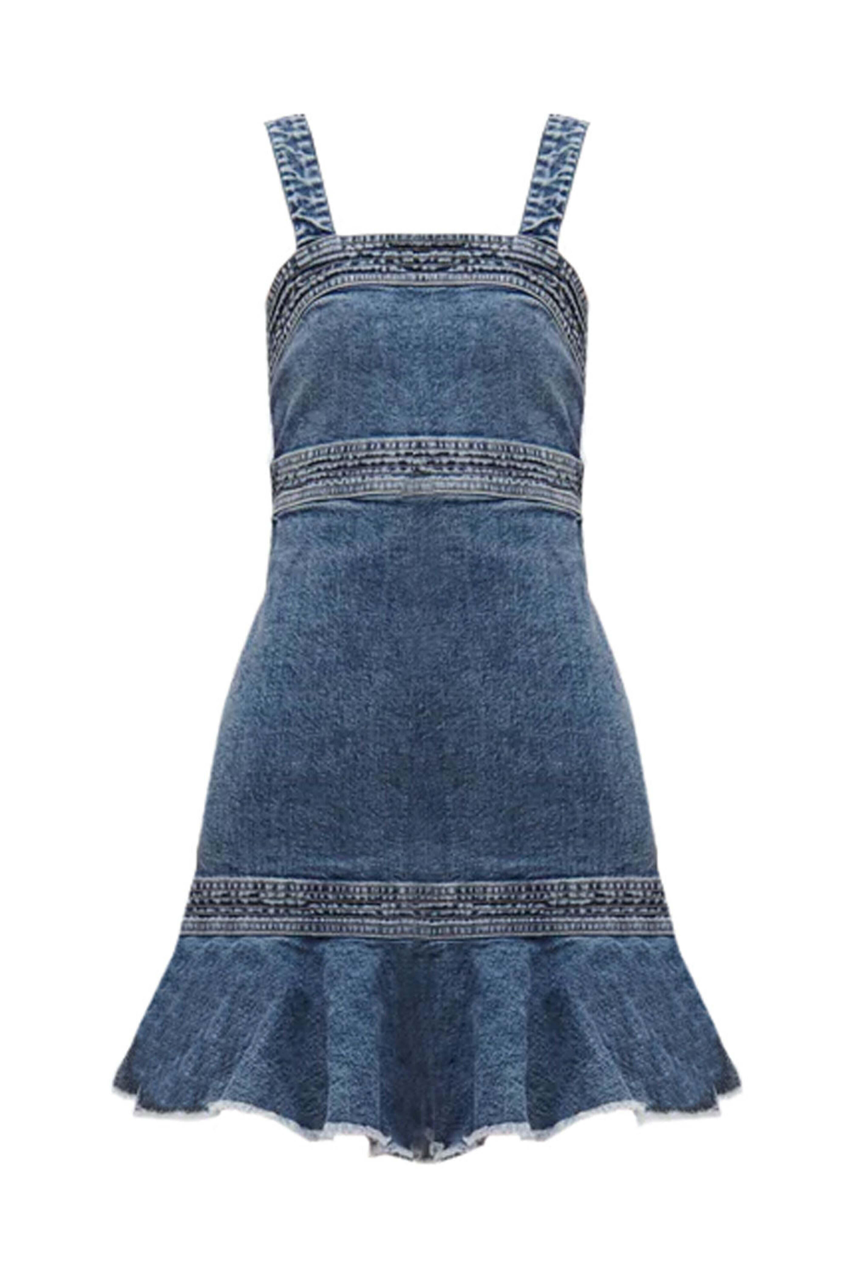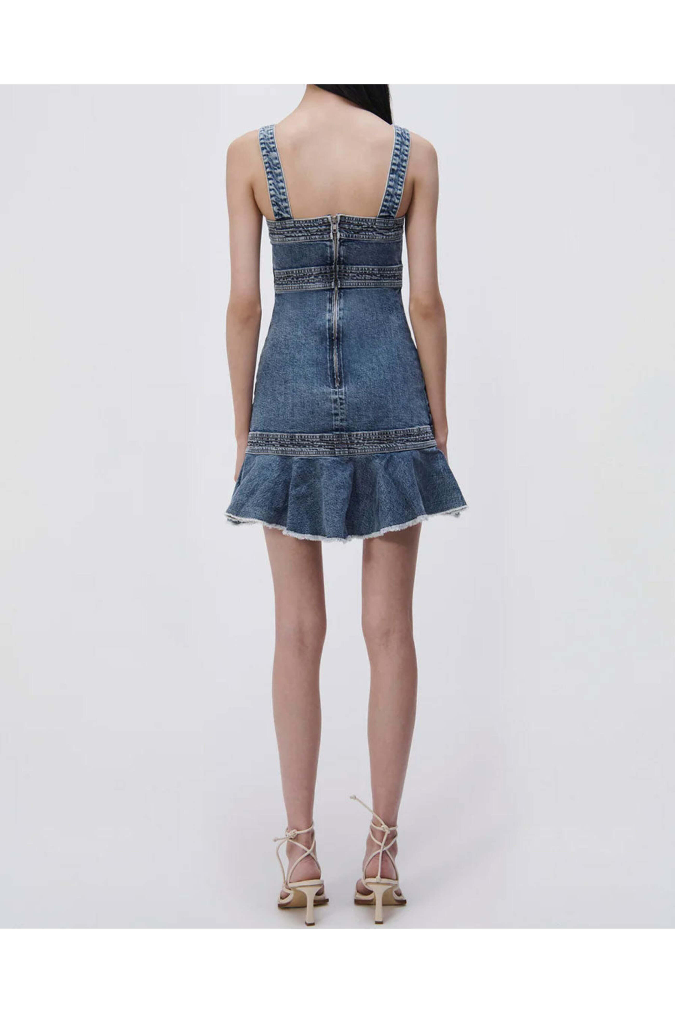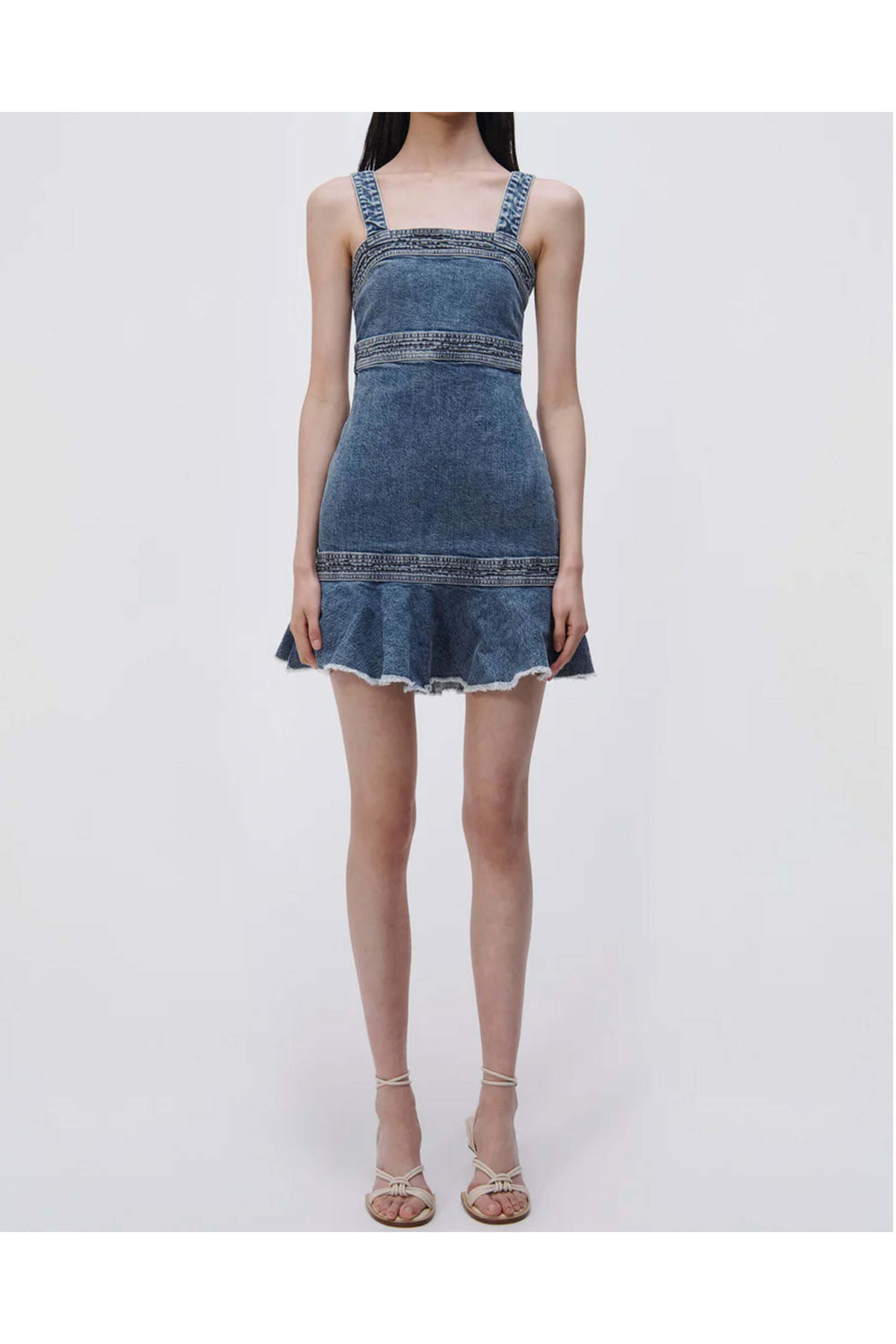 SIMKHAI Dania Clara Denim Mini Dress. Square neck. Square back. Sleeveless; thick shoulder straps. Back zip closure. Slim throughout. Flounce hem. Mini length. Denim fabrication. Lined. 100% cotton outer and lining.