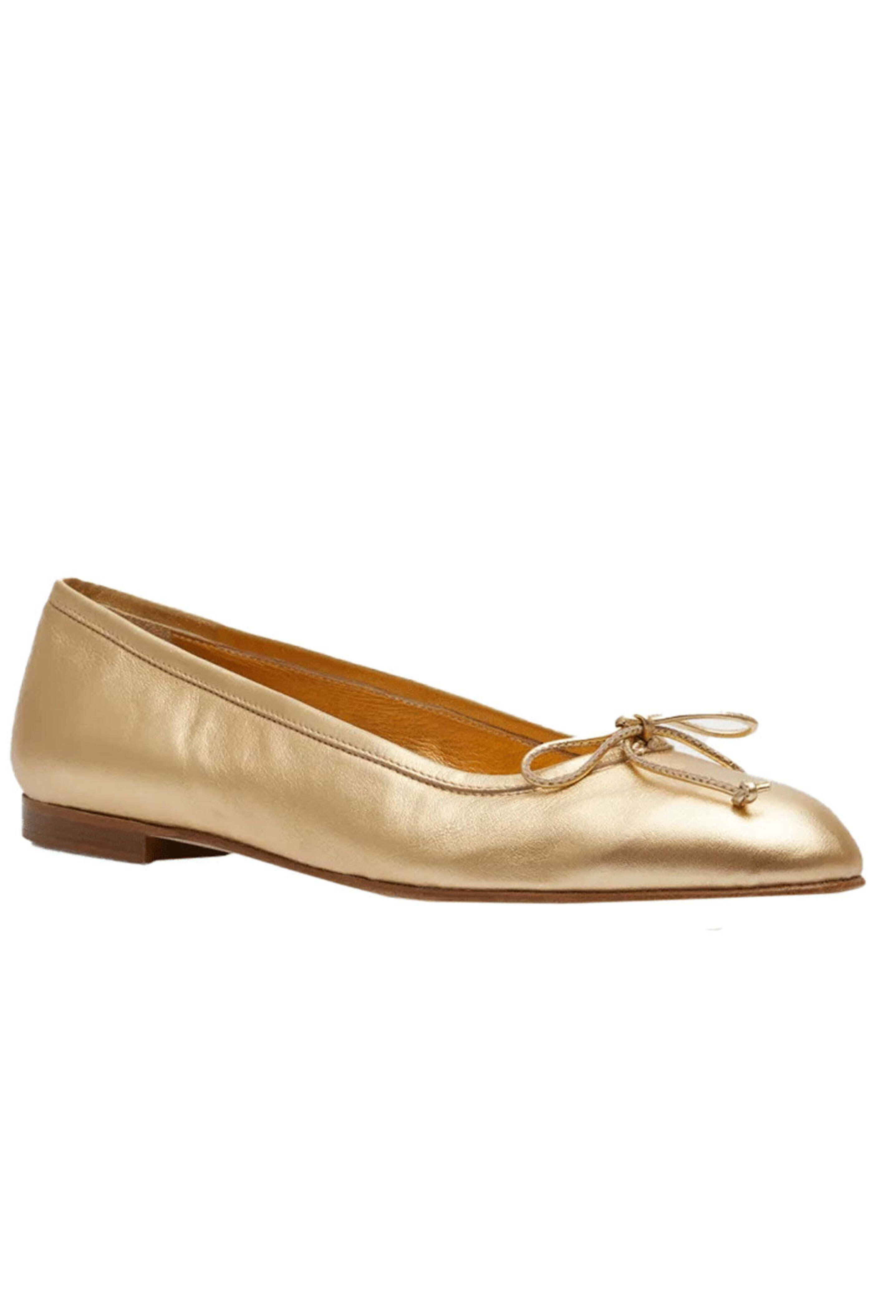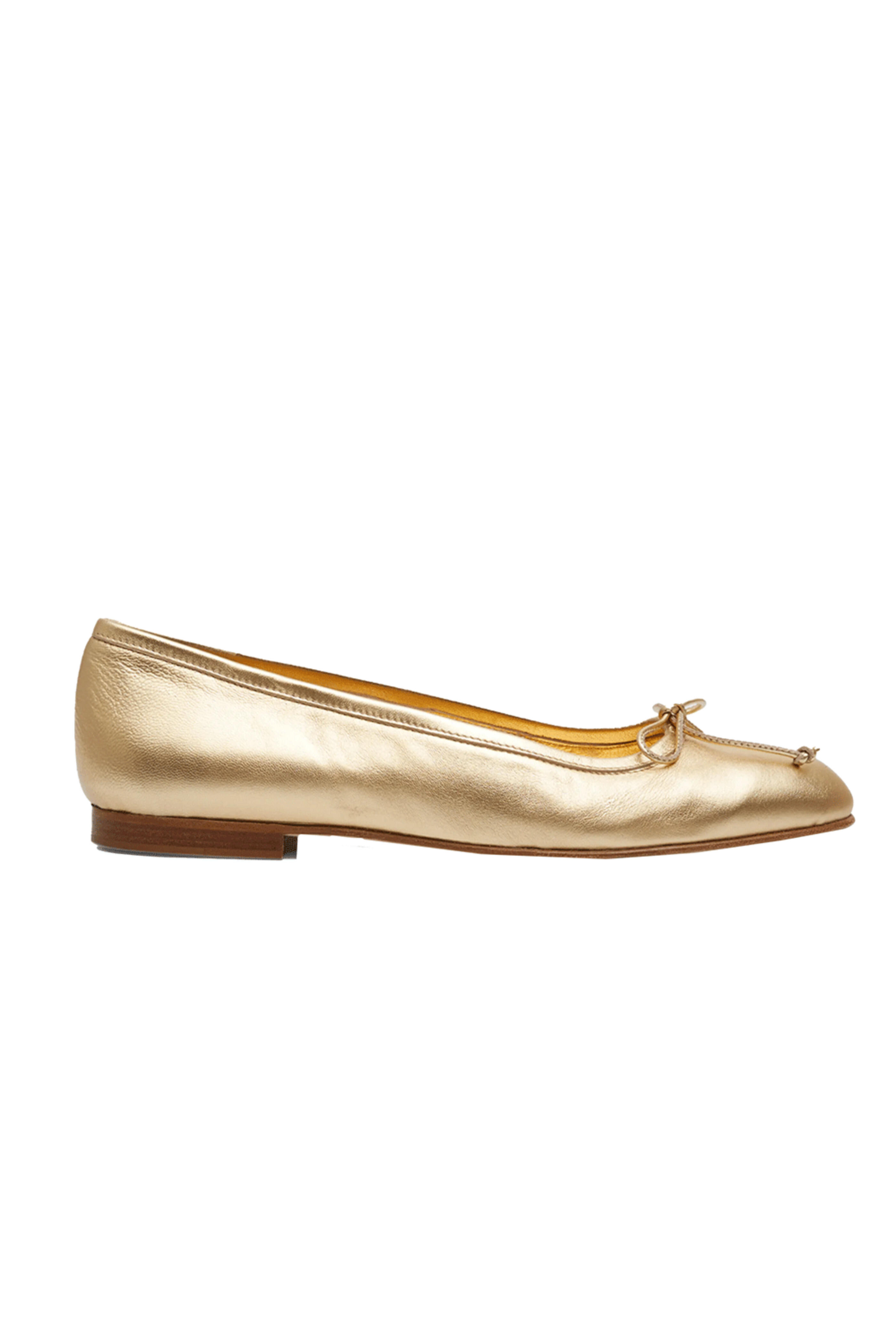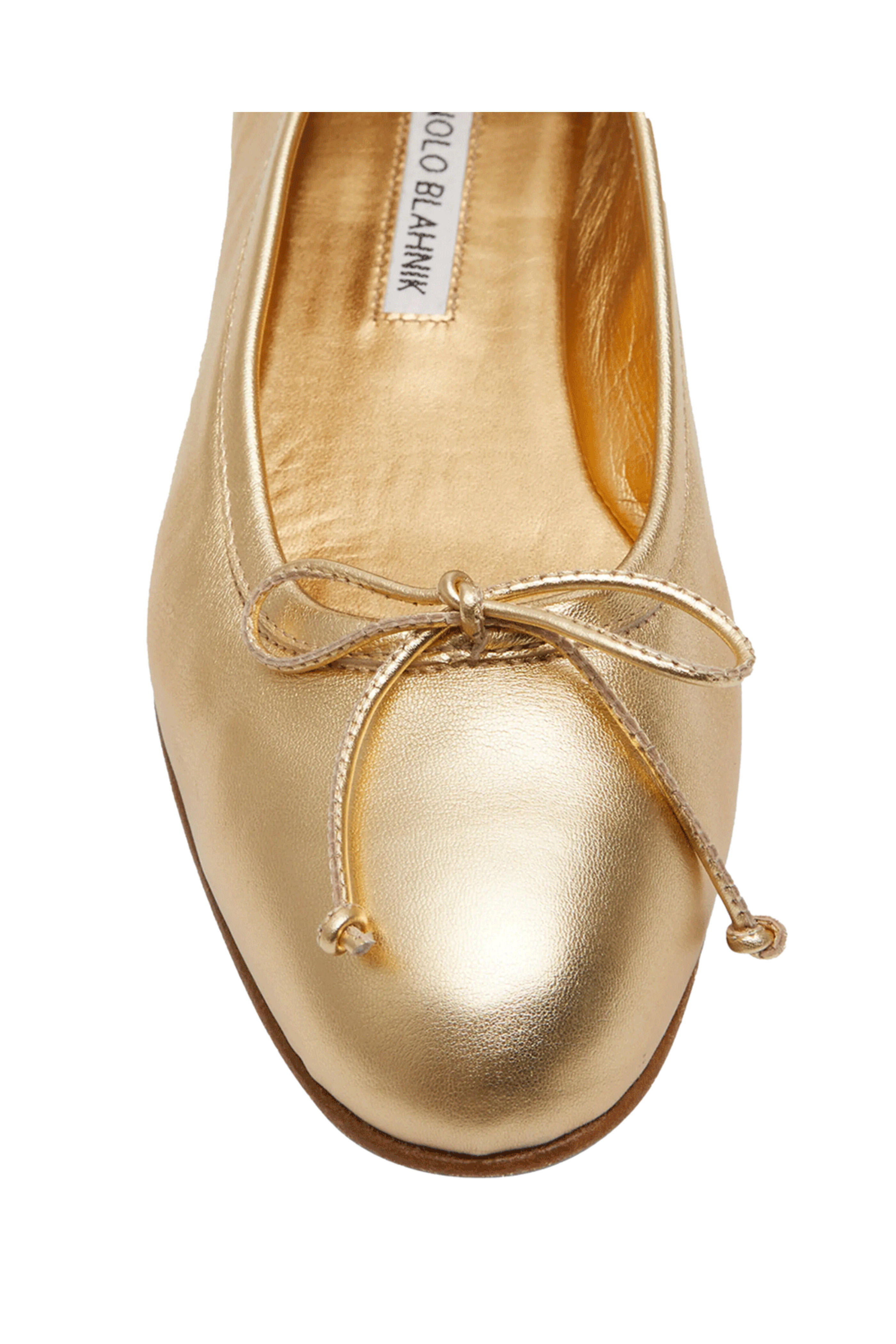 Manolo Blahnik Veralli Flat in Gold. Round toe. Slip on. Bow detail on toe. Leather upper, lining, and sole. Made in Italy.