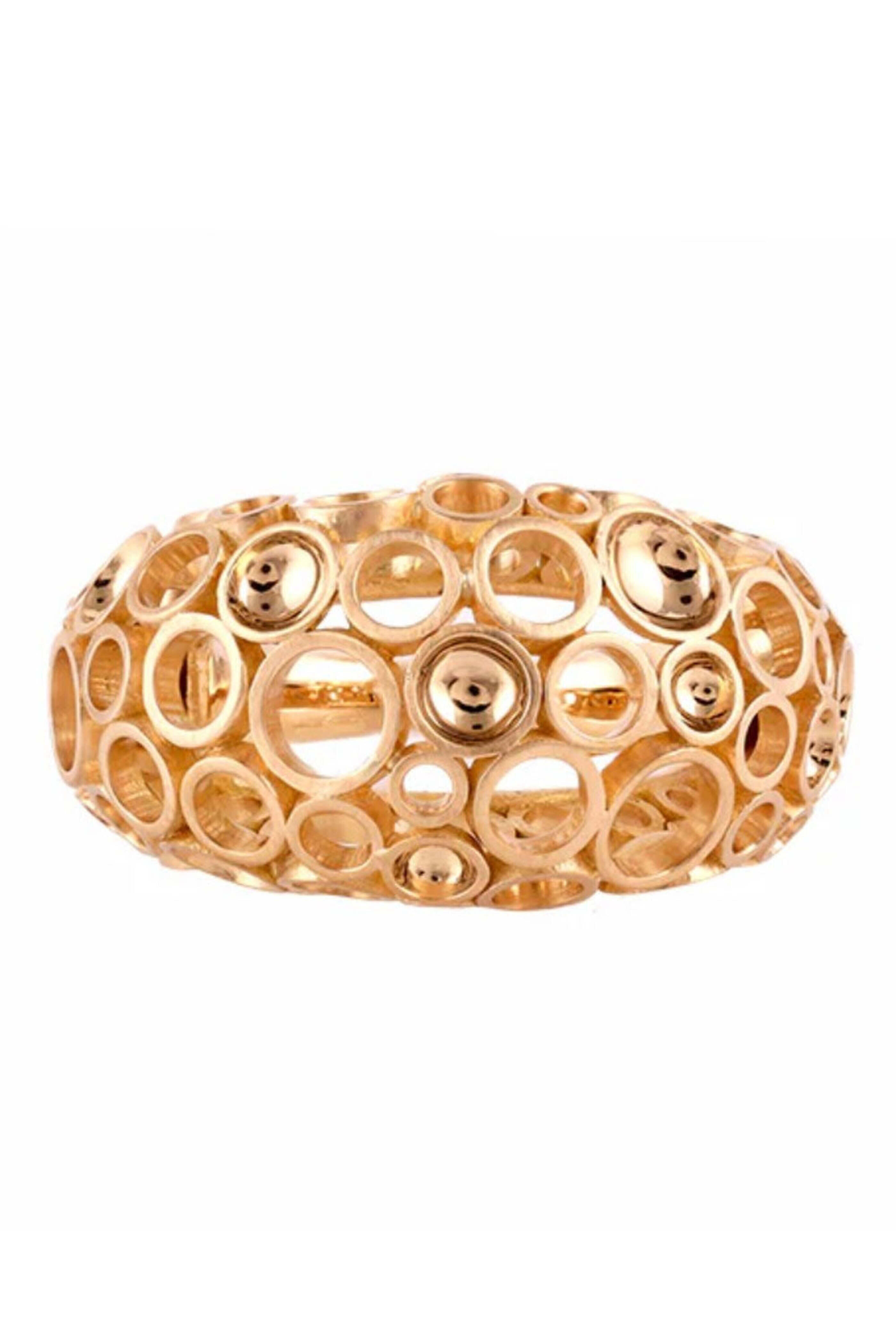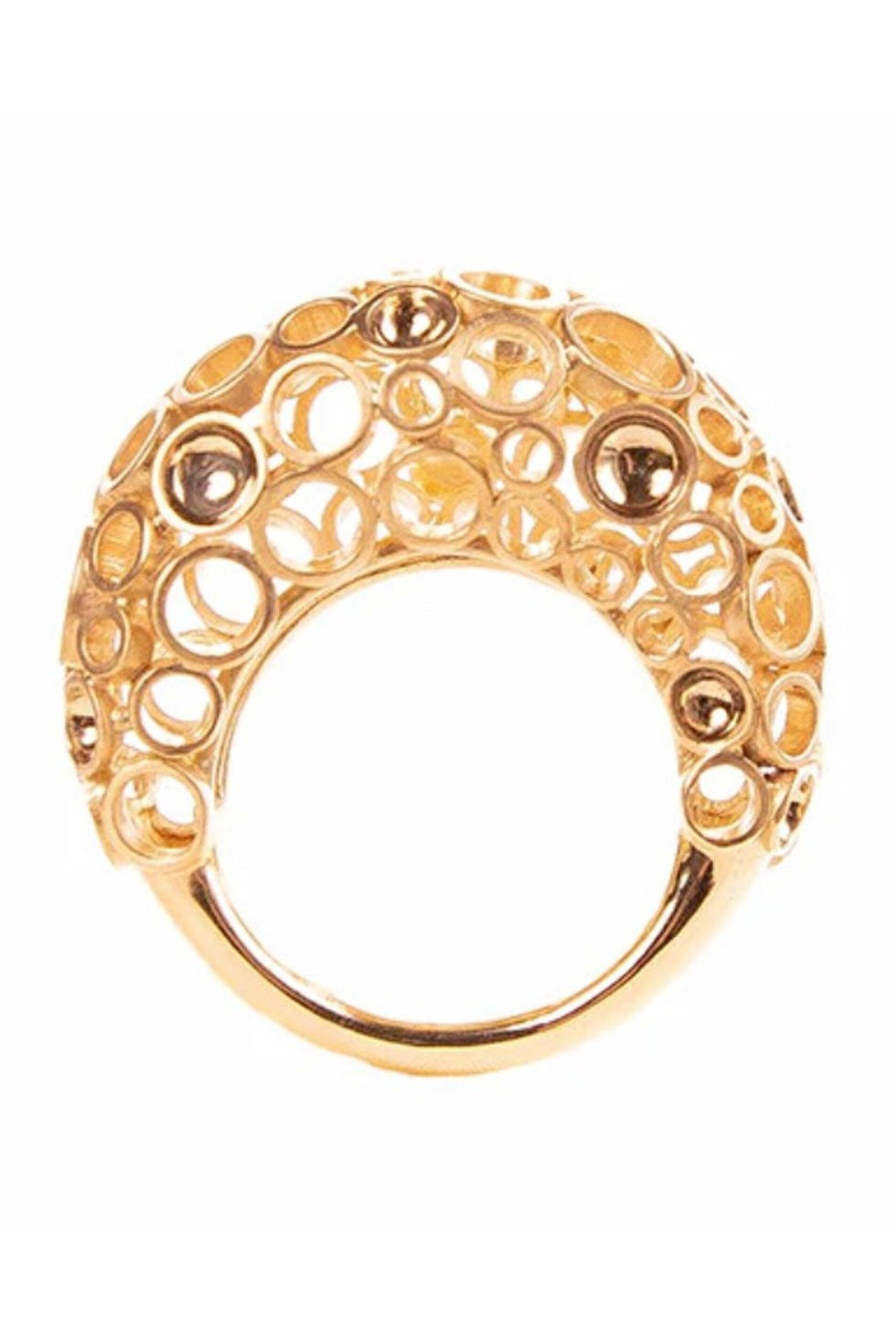 Van Gelder Maxi Jail Celestial Bombé Ring. 18k yellow gold. Mirror-like finish. Brushed gold finish. Concave roundels. Concave base design. Dome design. Call for ring size. Handmade and designed in India.