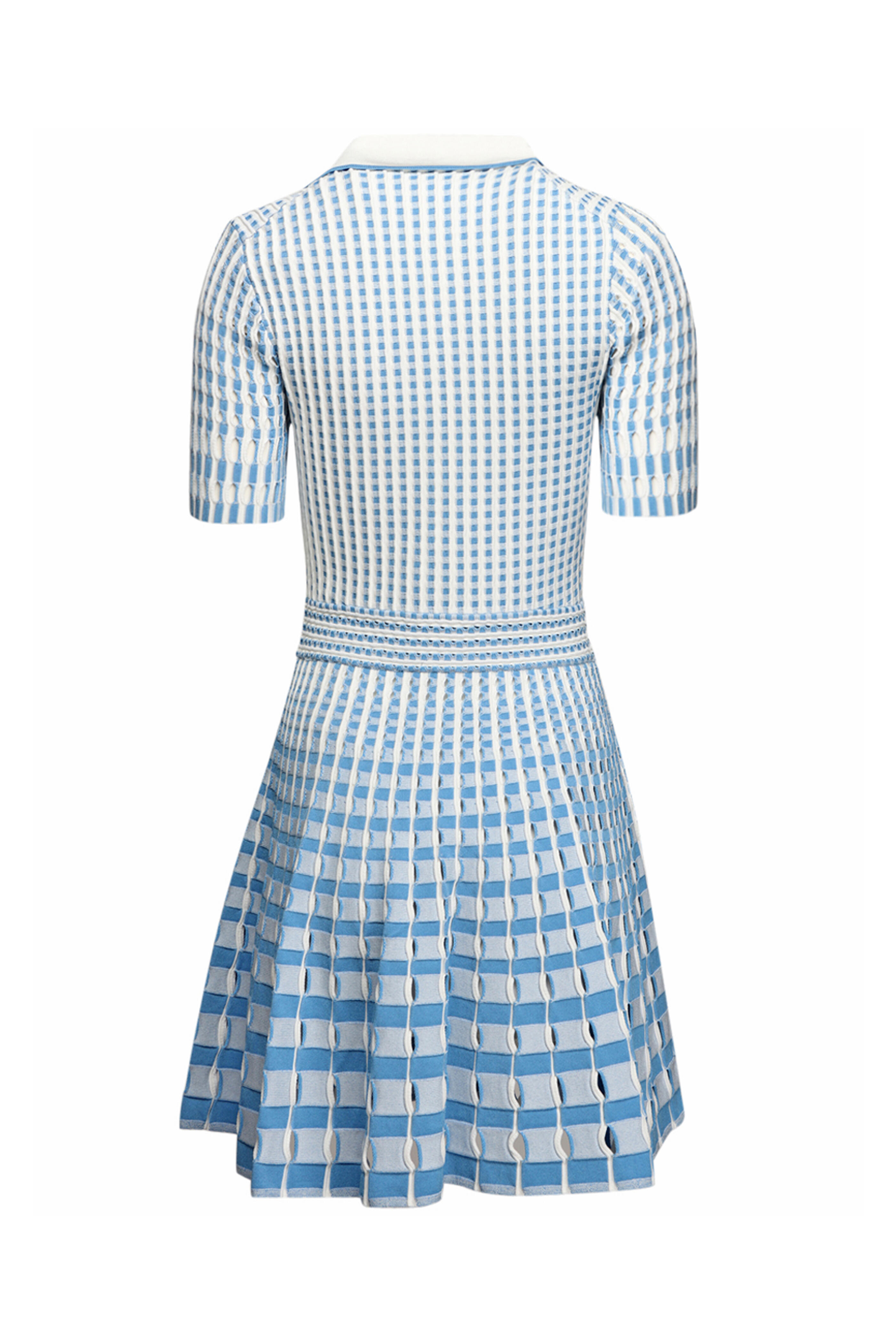 Polo collar. V neck. Short sleeves. Banded waist. Aline skirt. Mini length. Pleated throughout; cutouts at skirt. 83% rayon, 17% polyester outer, 100% rayon lining.