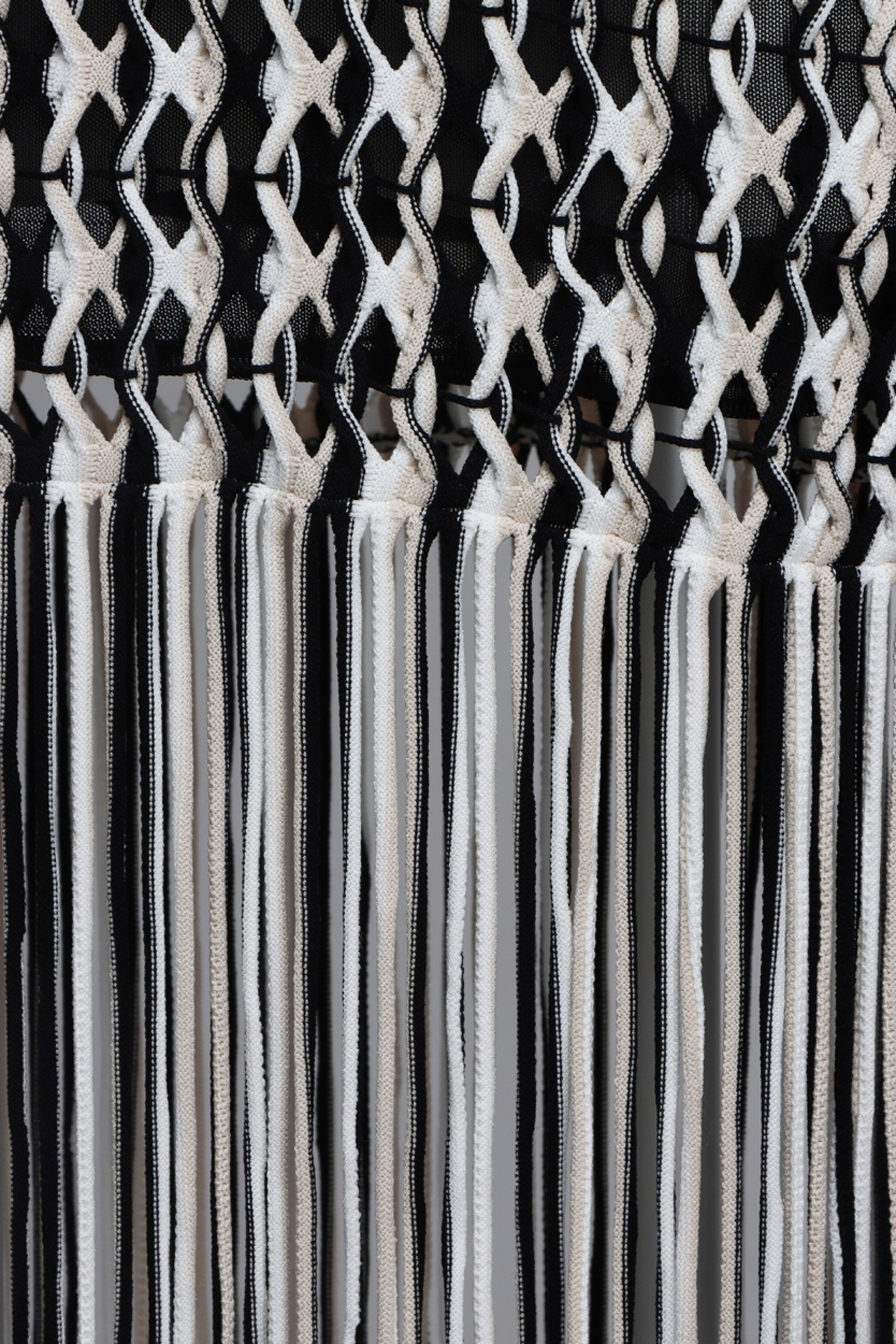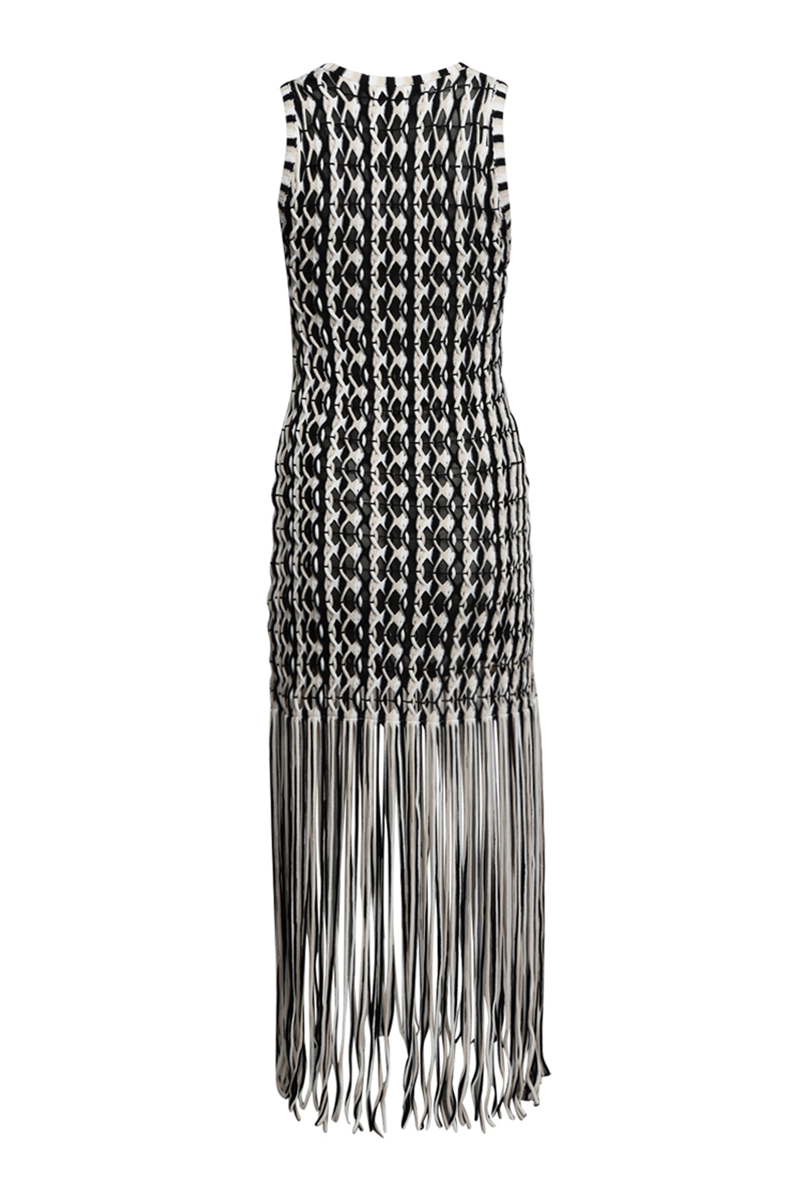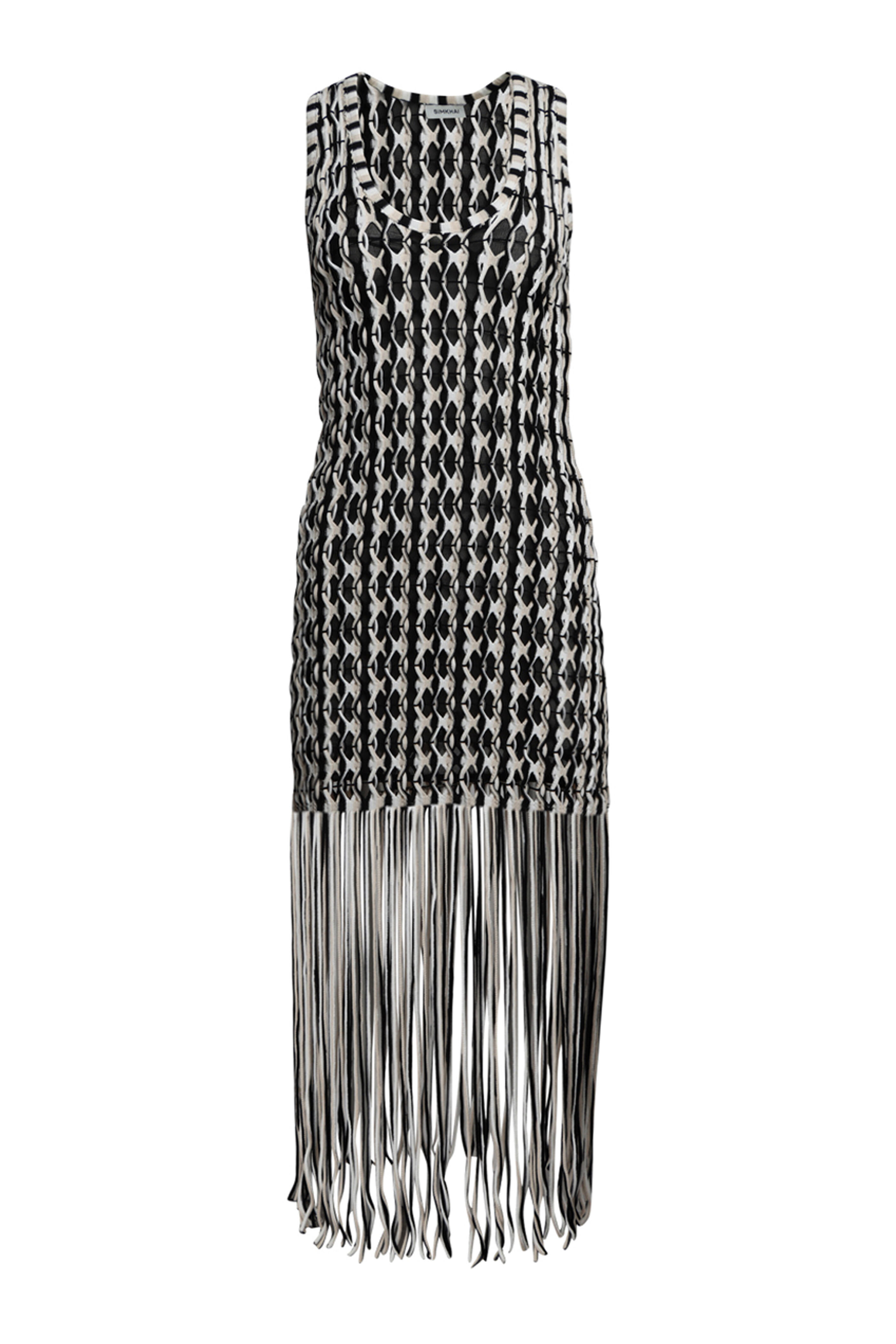 Scoop neck. Sleeveless. Slim silhouette. Mini length. Fringe hem detail; midi length. Knit fabrication. 83% rayon, 17% polyester outer, 100% rayon lining.