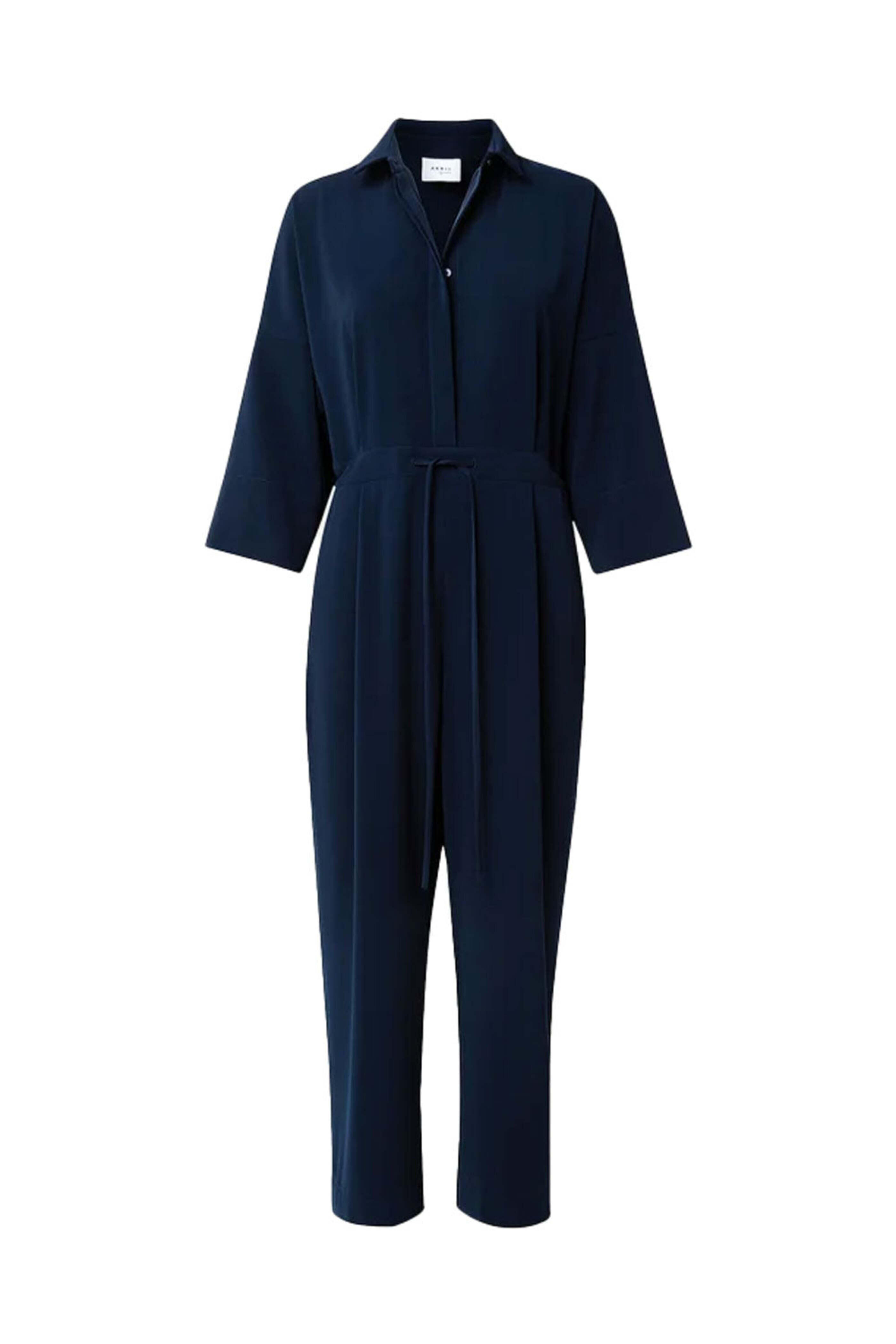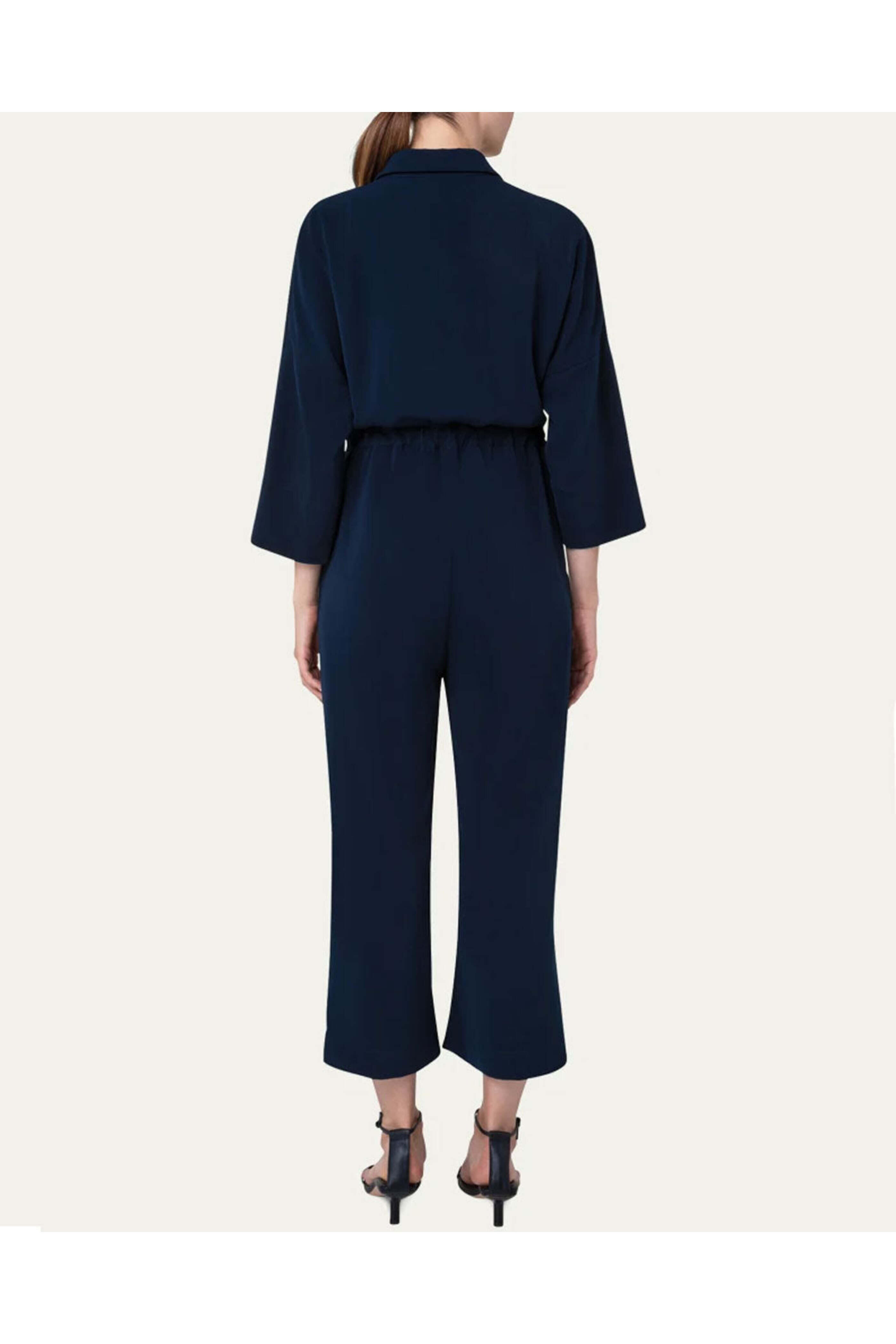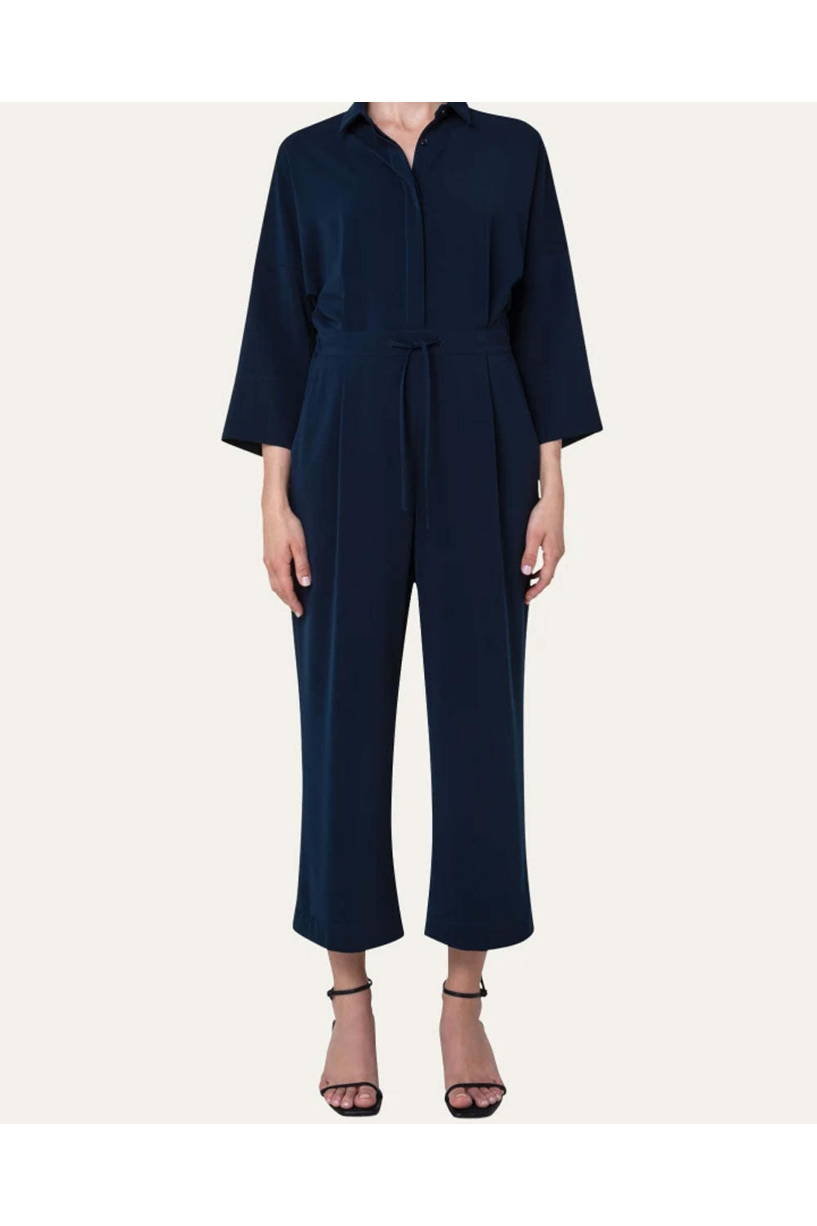 Akris Punto Navy Kent Collar Jumpsuit. Collar. Drop shoulders. ¾ lengths leeves. Concealed quarter button placket. Drawstring waist. Side slip pockets. Pleated detail at front. Wide through leg. Cropped length. 100% polyester.