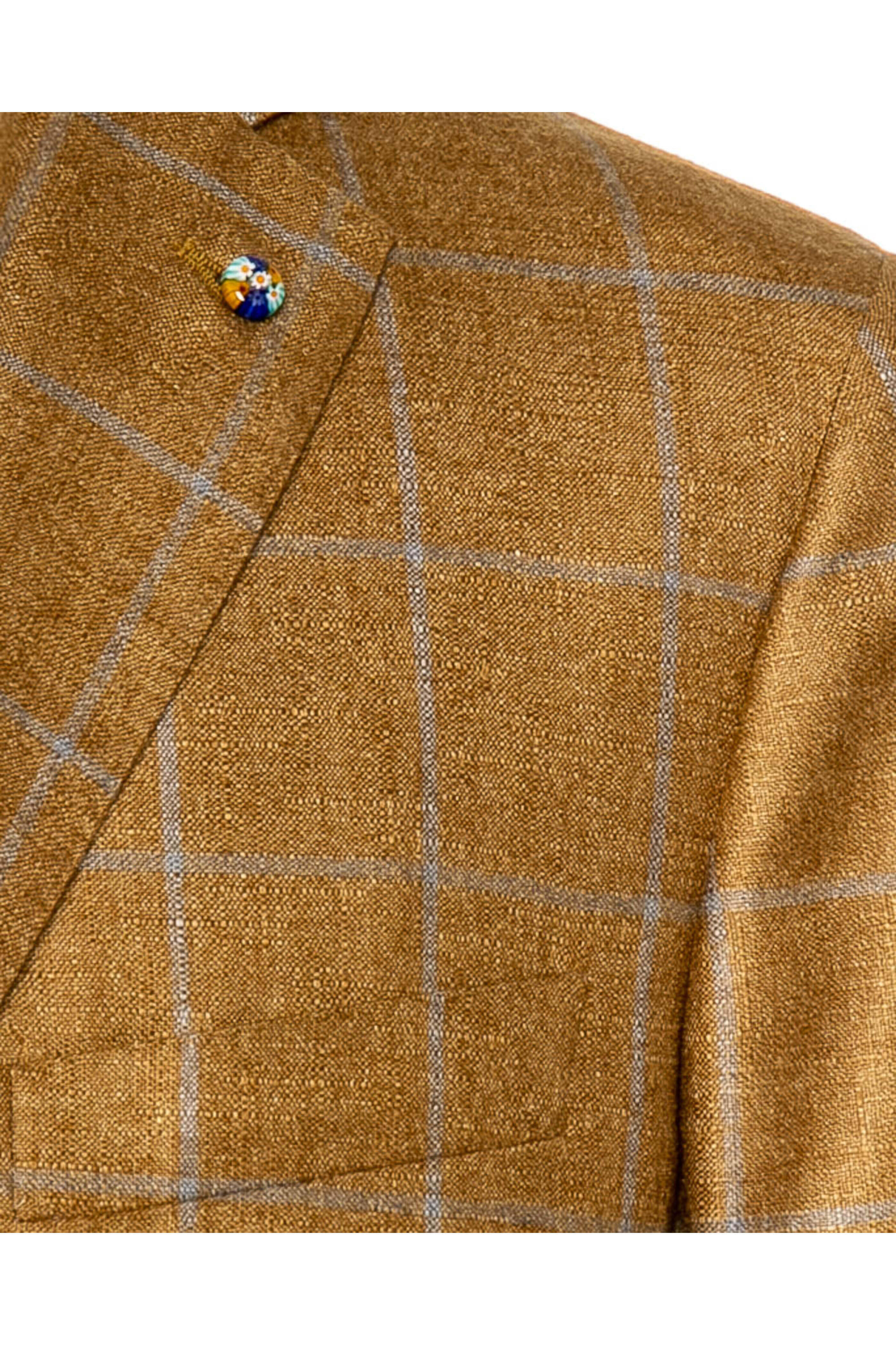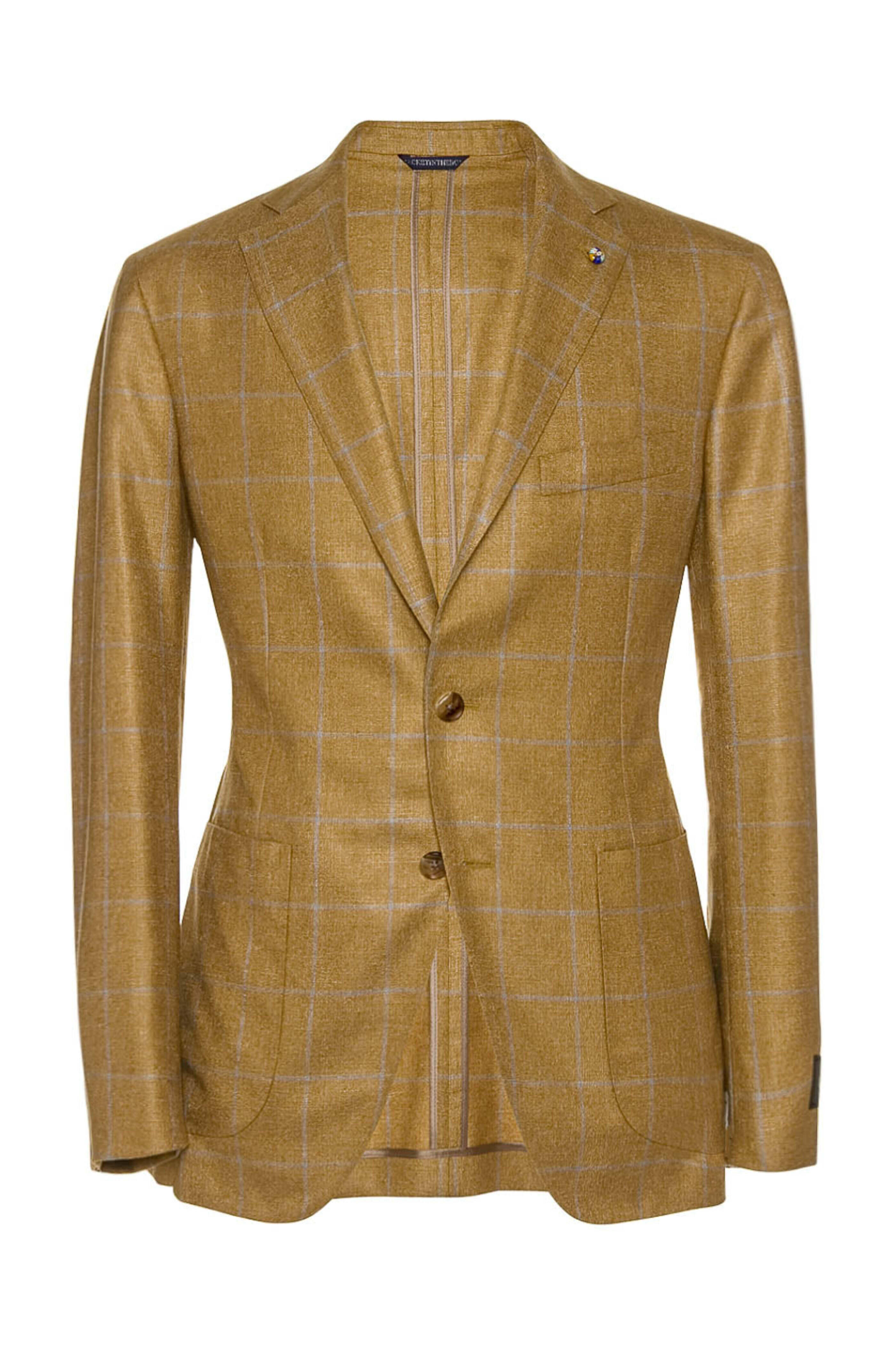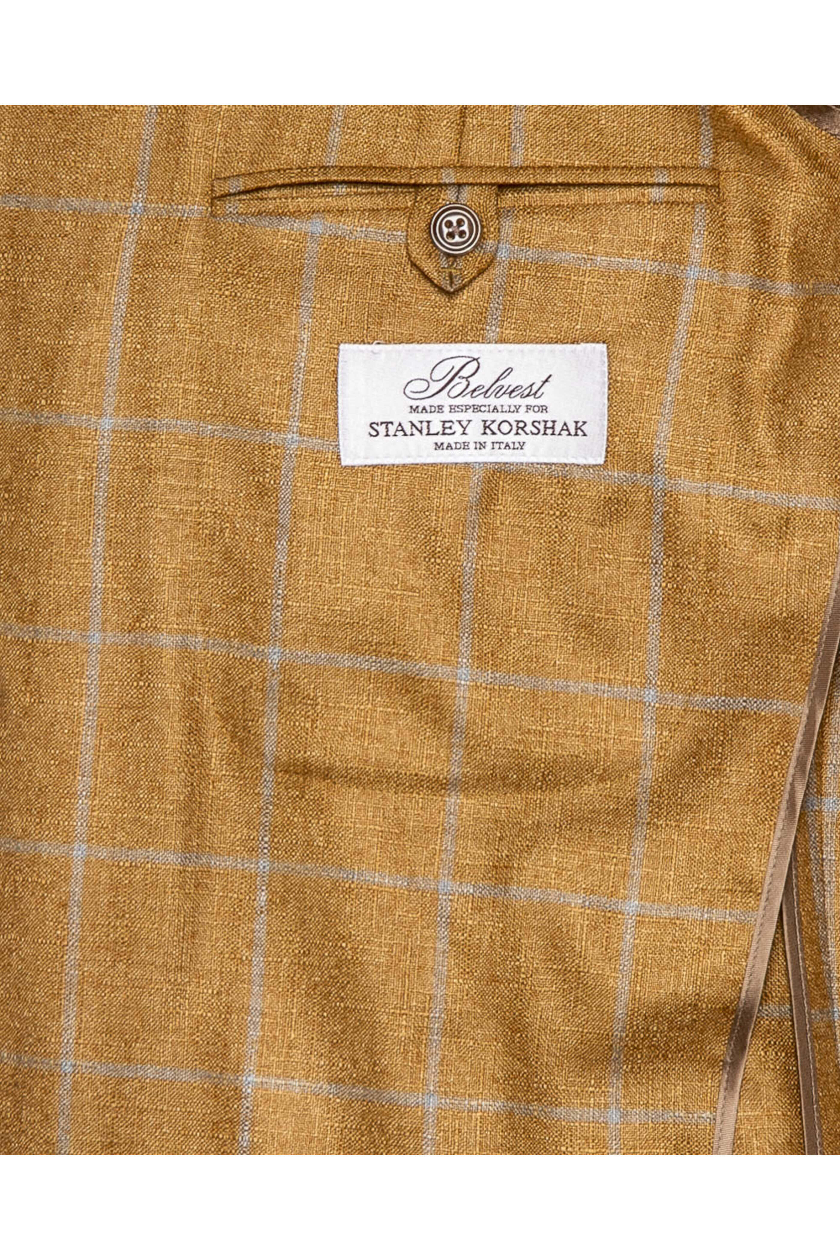 Belvest Gold with Grey Windowpane Sportcoat. Two button jacket. Notch lapel. Pick stitch detailing. Front left chest pocket. Patch waist pockets. Unlined. Double back vents. Drop: 7. Made in Italy. 52% silk, 48% cashmere.
