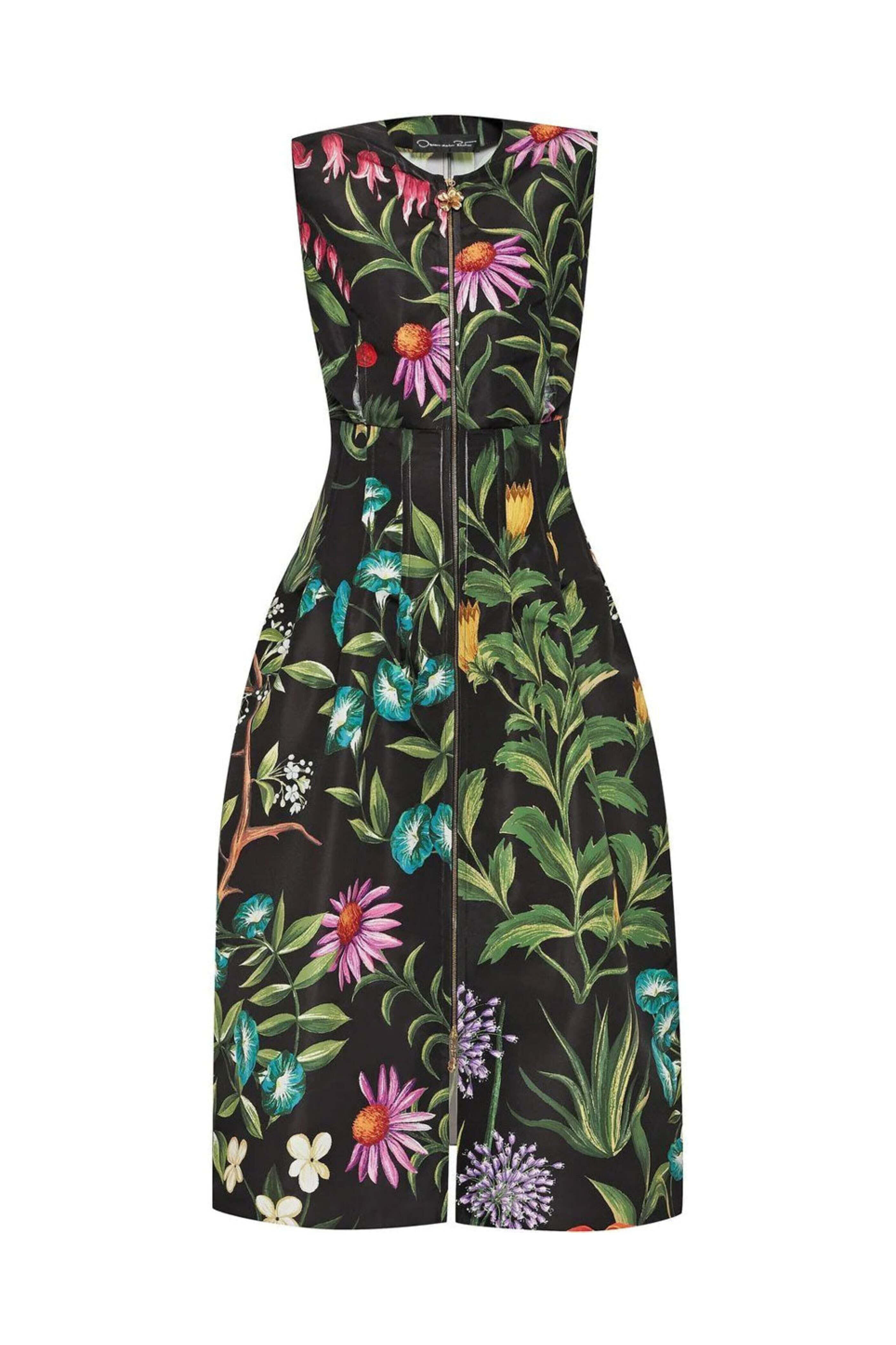 Oscar de la Renta Black Floral Tapestry Sleeveless Faille Dress. Round neck. Sleeveless. Front zip closure; floral zipper detail. Side slip pockets. Slim through waist. Pintuck pleated waist. Flared skirt. Midi length. Made in Italy. 100% polyester.