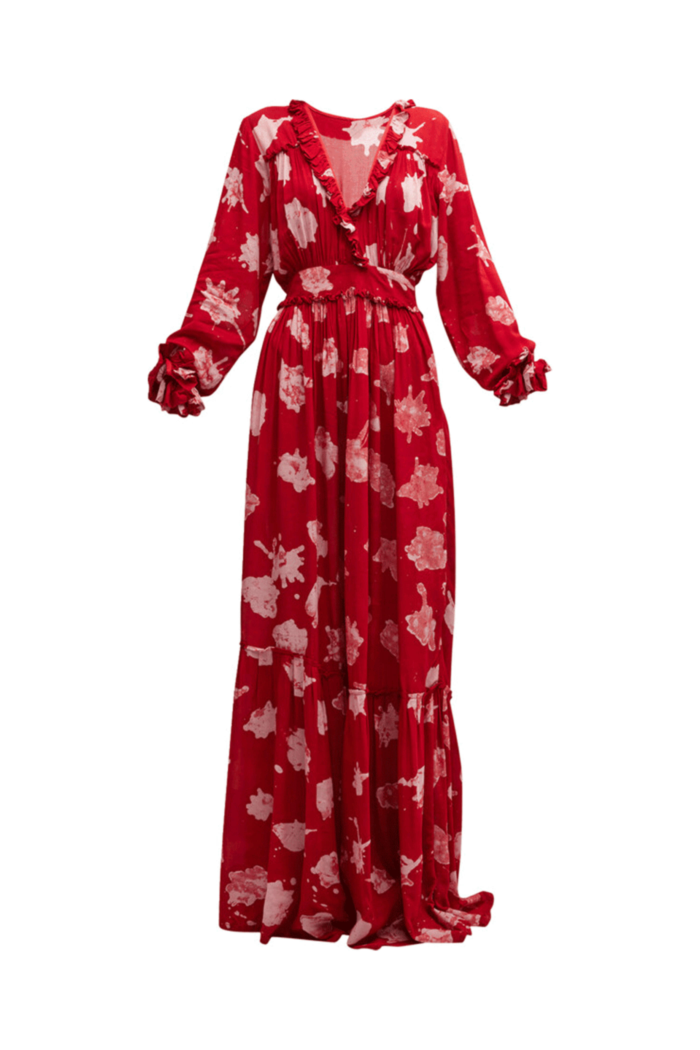 Busayo Red Pink Ini Dress . Plunging V-neck . Long sleeves . Ruffled cuffs . Button cuffs . Back zip closure . Imported . 100% cotton . Machine wash .