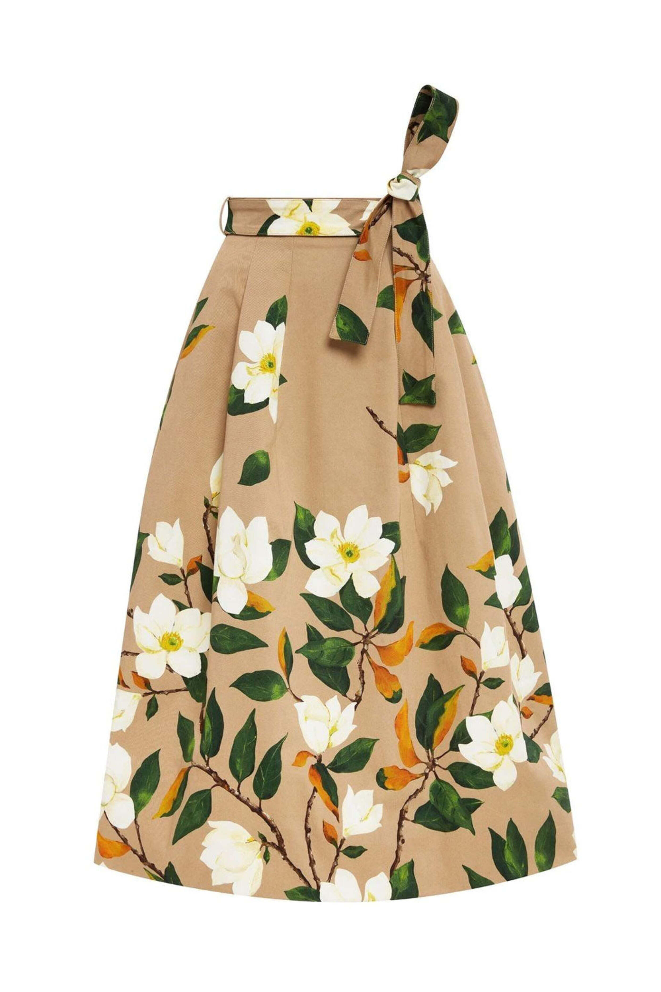 Oscar de la Renta Khaki Floral Magnolia Degrade Skirt. High rise. Concealed back zip closure. Self-tie at waist. Side slip pockets. Flare skirt. Midi length. Made in Italy. 97% cotton, 3% spandex.