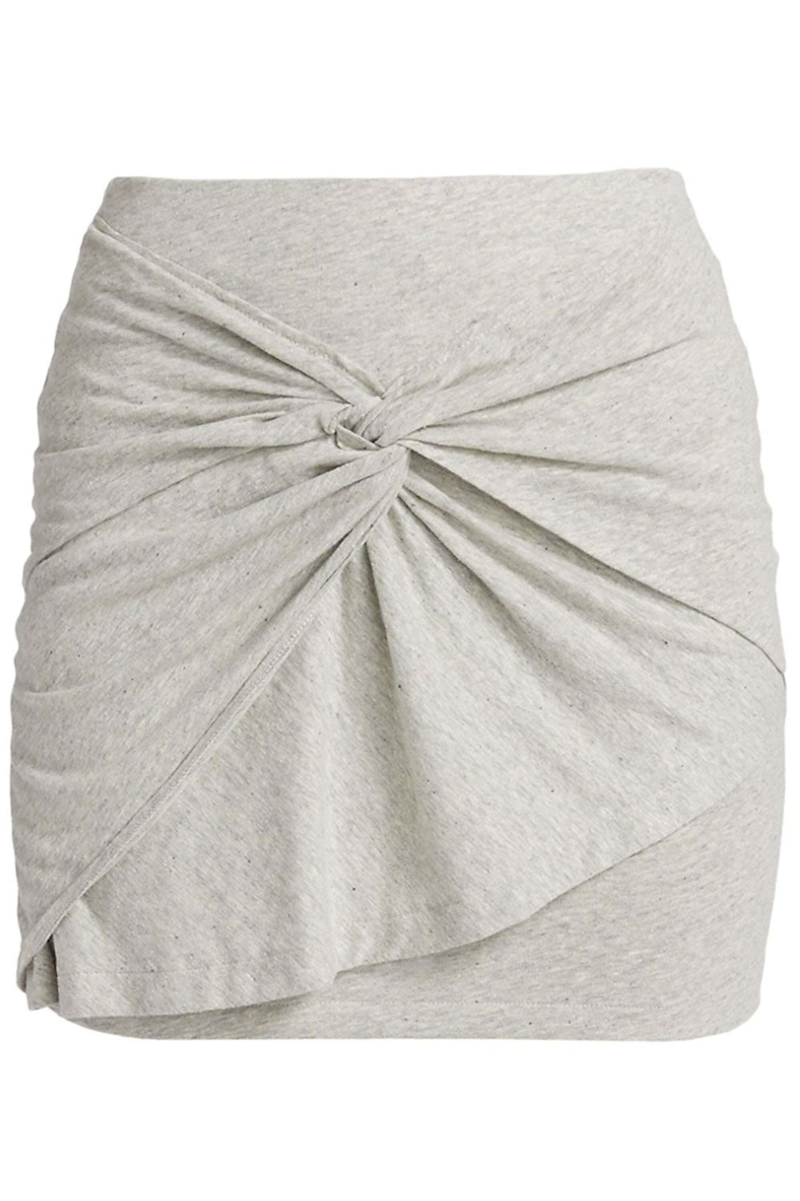 IRO Heather Grey Toraba Mini Skirt. Flat waistband. Knot detail at front. Slim silhouette. Mini length. 60% organic cotton, 40% cotton.