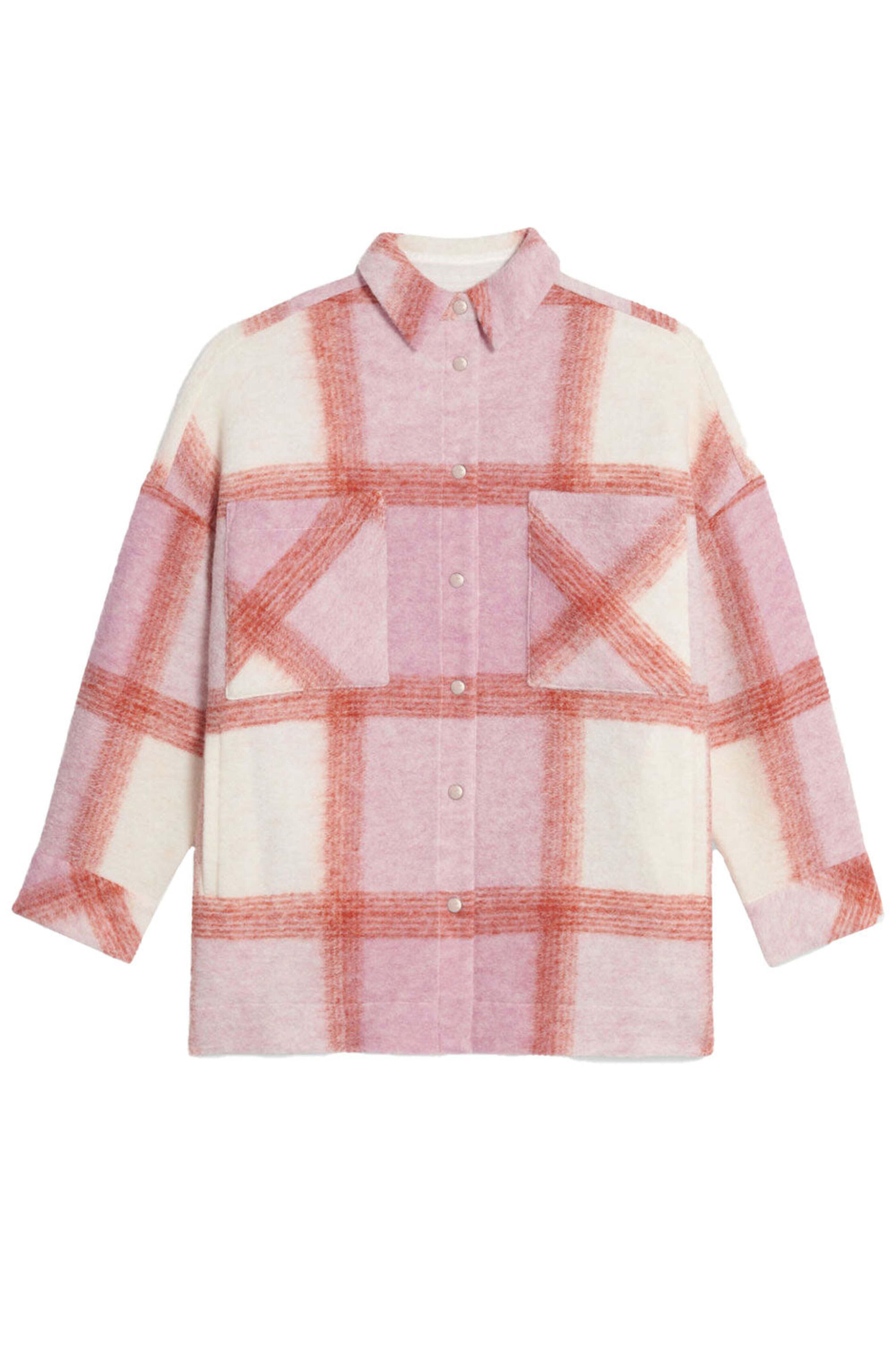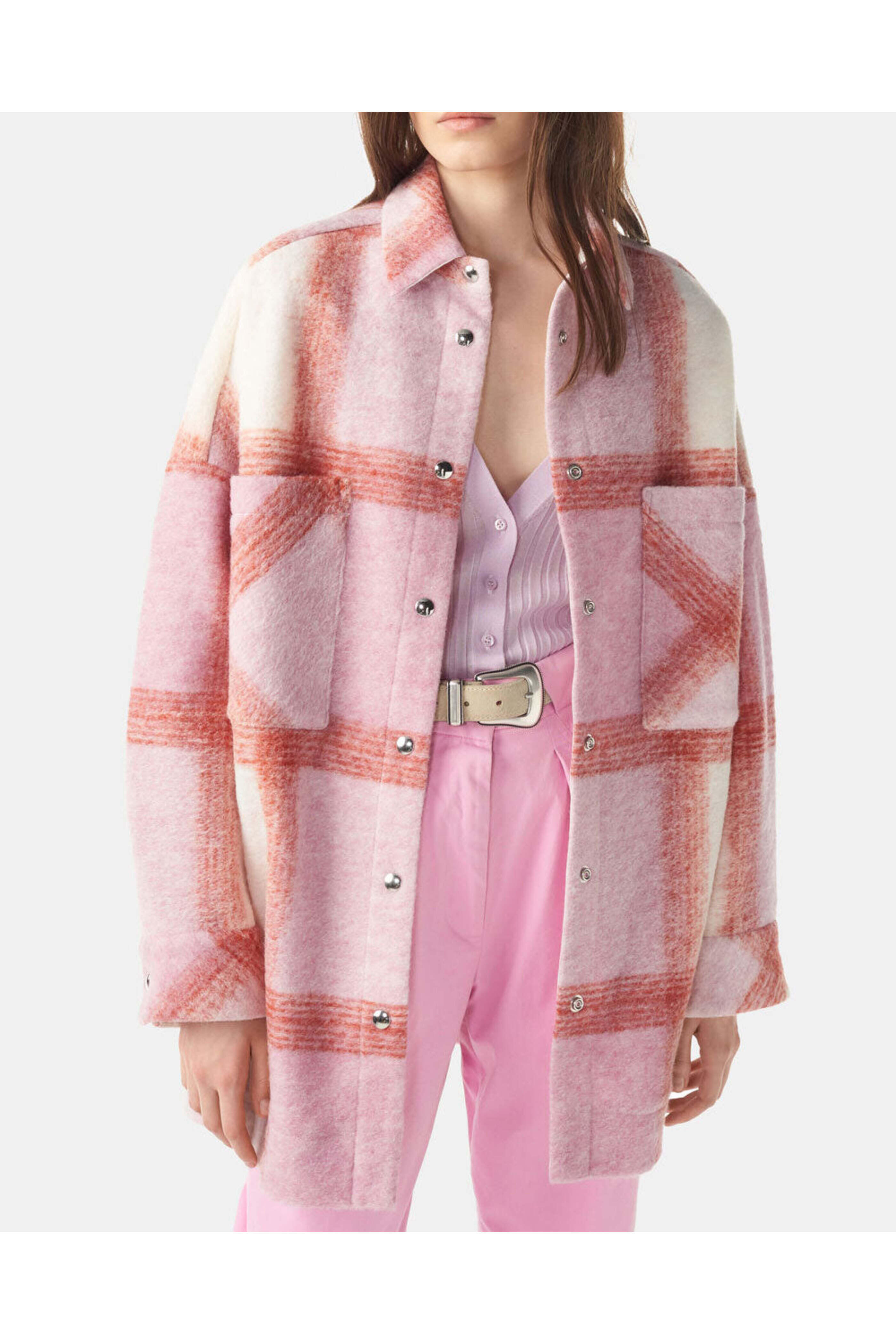 IRO Light Pink Lemina Shirt Jacket. Collar. Long Sleeve; button cuff. Snap button closure. Front chest pockets. Side seam pockets. Oversized fit. Lined. 60% wool, 35% polyester, other fibers outer, 51% cotton, 49% viscose lining.