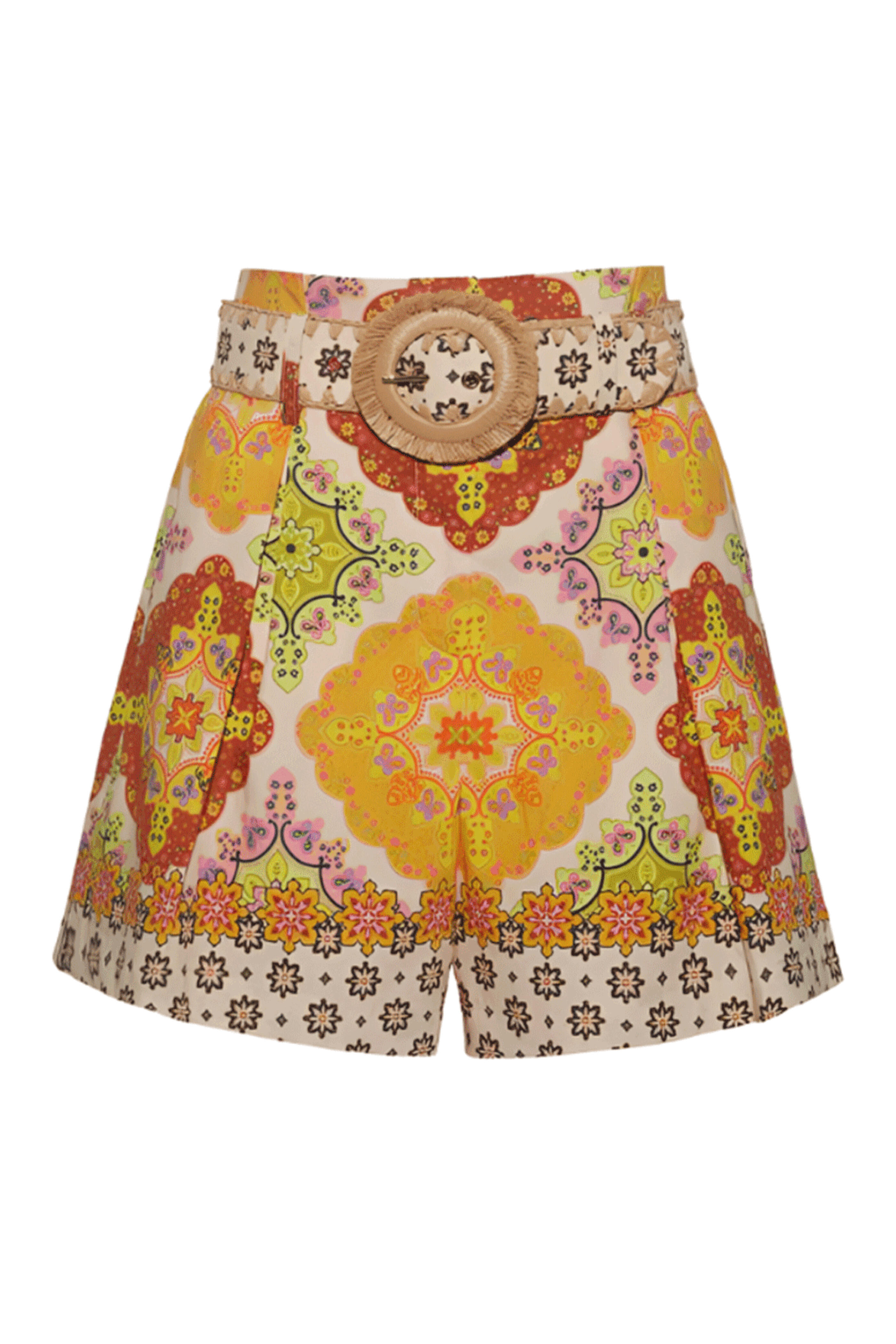 Cara Cara Mandala Turtledove Palmer Short. High rise. Hook and eye closure. Zip fly. Belt loops. Buckle belt. Side slip pockets. Wide through leg. Mid thigh length. 100% cotton.