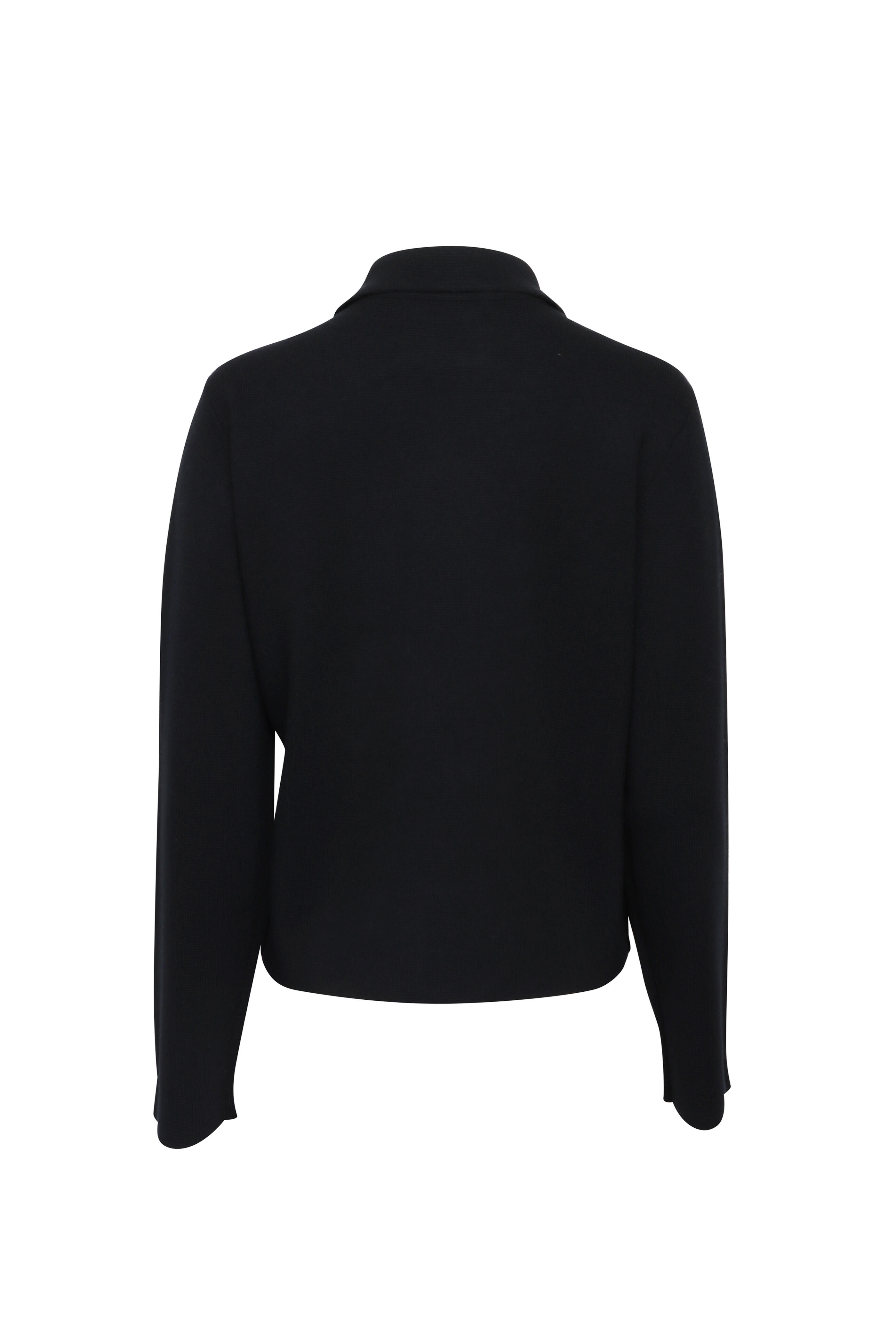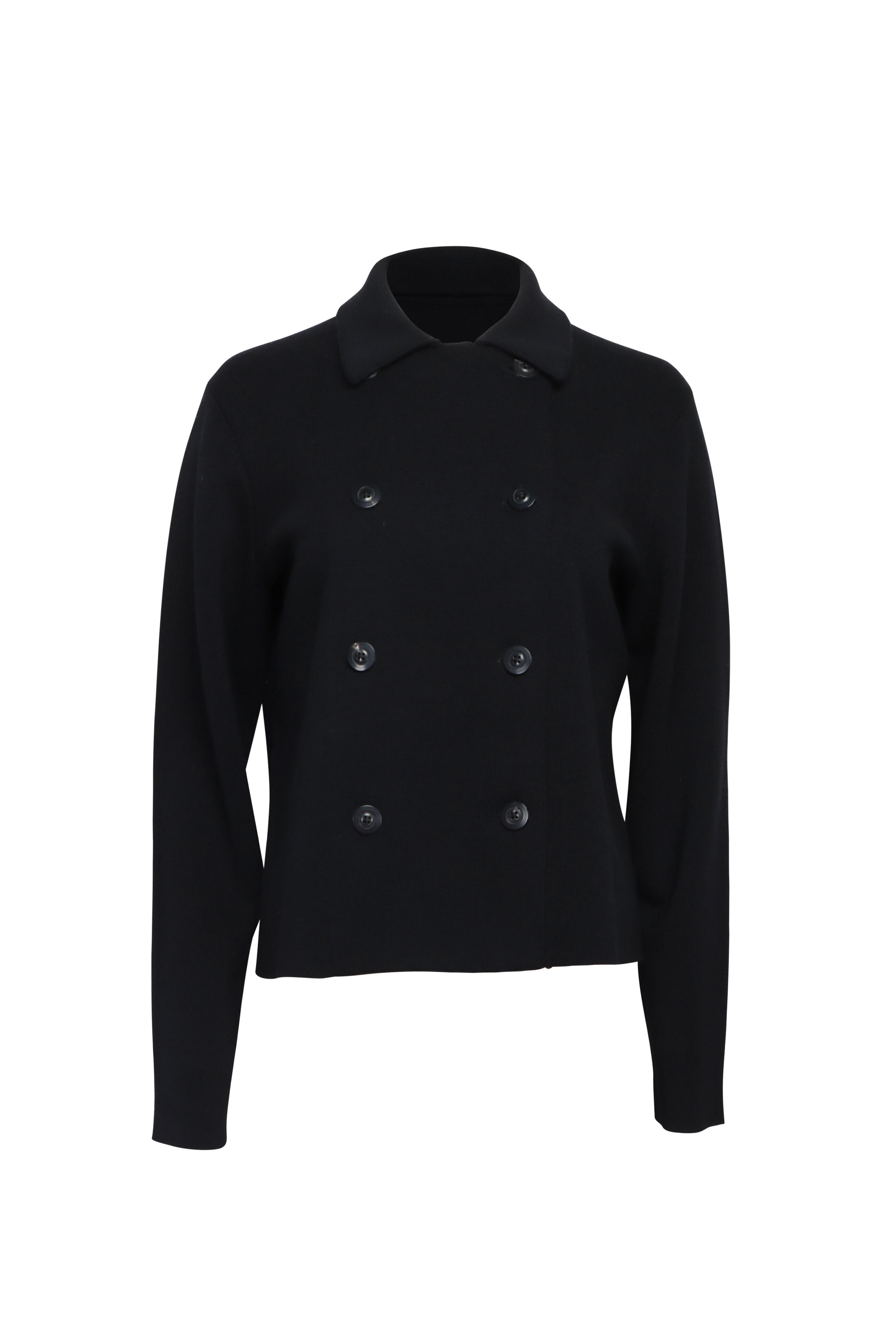 Collar. Long sleeves. Double breasted front button closure. Boxy fit. Knit fabrication. Imported. Cropped length. 100% merino wool. Machine washable.
