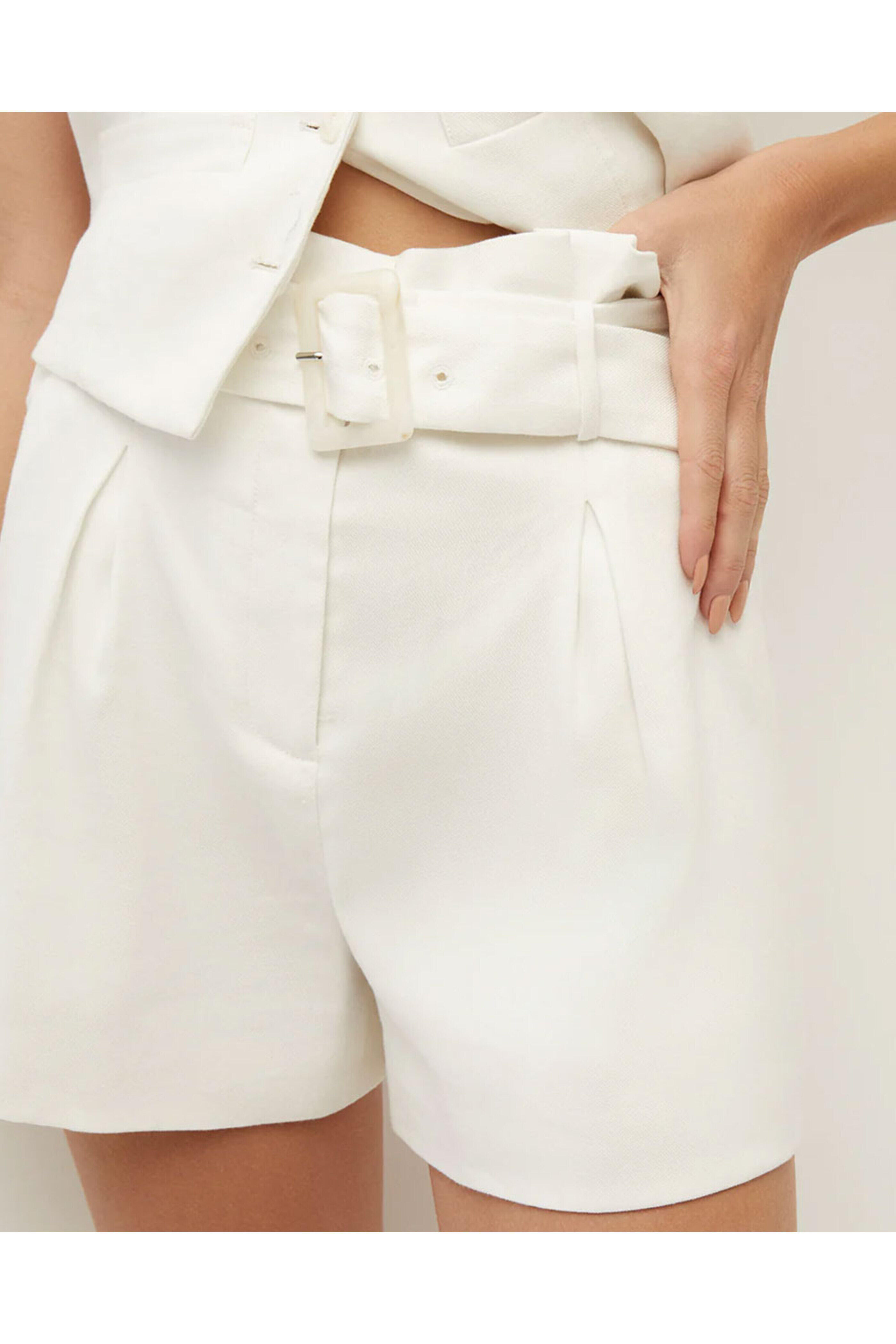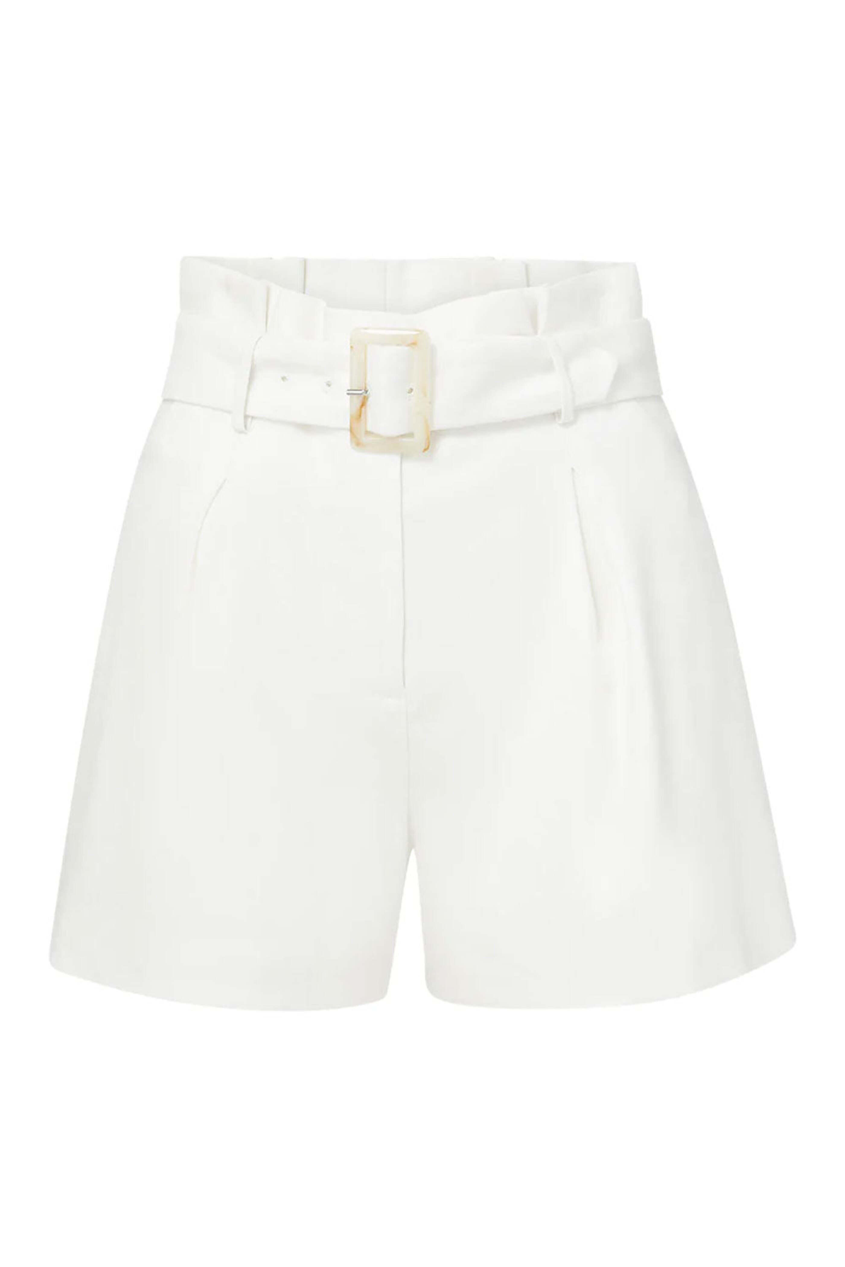 Veronica Beard White Ashford Short. Zip fly. Hook and bar closure. Belt loops. Side slant pockets. Paper bag waist. Tailored front pleats. Removable belt. Imported. 53% linen/29% polyester/16% viscose/2% elastane.