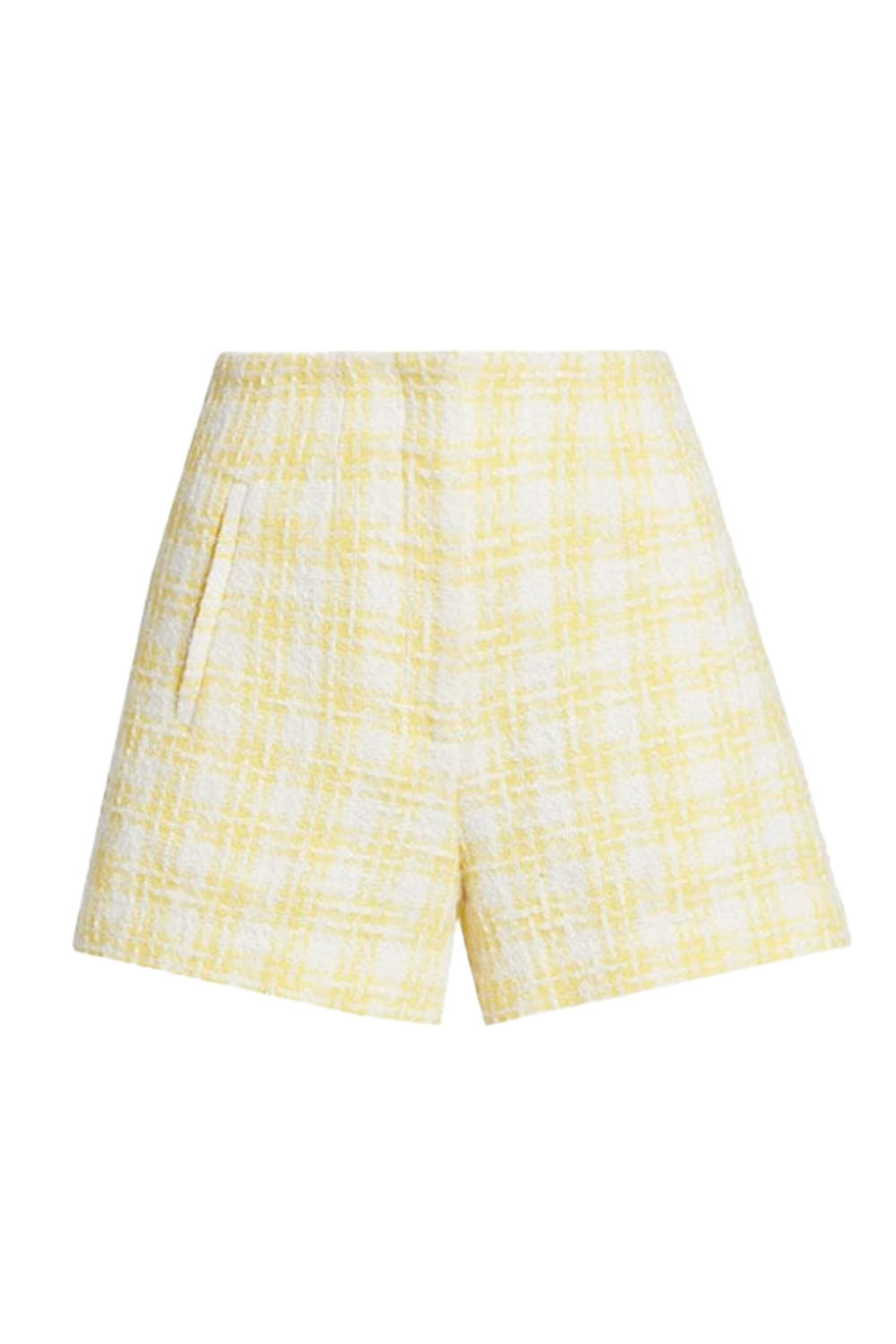 Veronica Beard Yellow and White Jazmin Short . Mid rise . Zip fly . Hook-and-bar closure . Front welt pockets . Slim fit . 65% cotton 29% polyester 6% nylon .