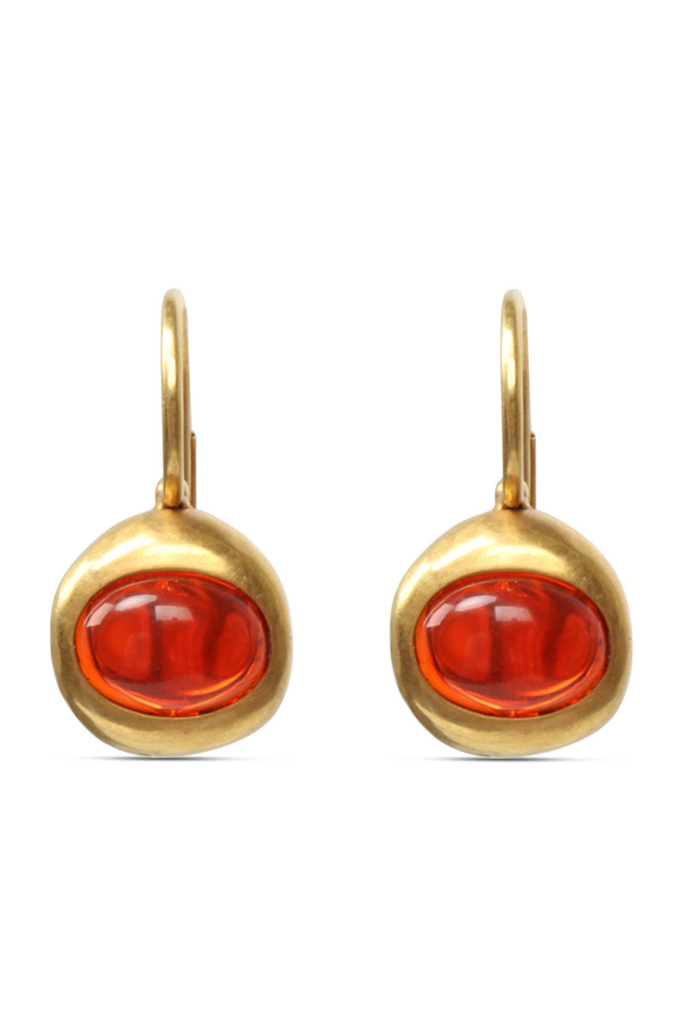 22k gold. Cabochon. Fire opal. Oval. Gold bezel. French backs.