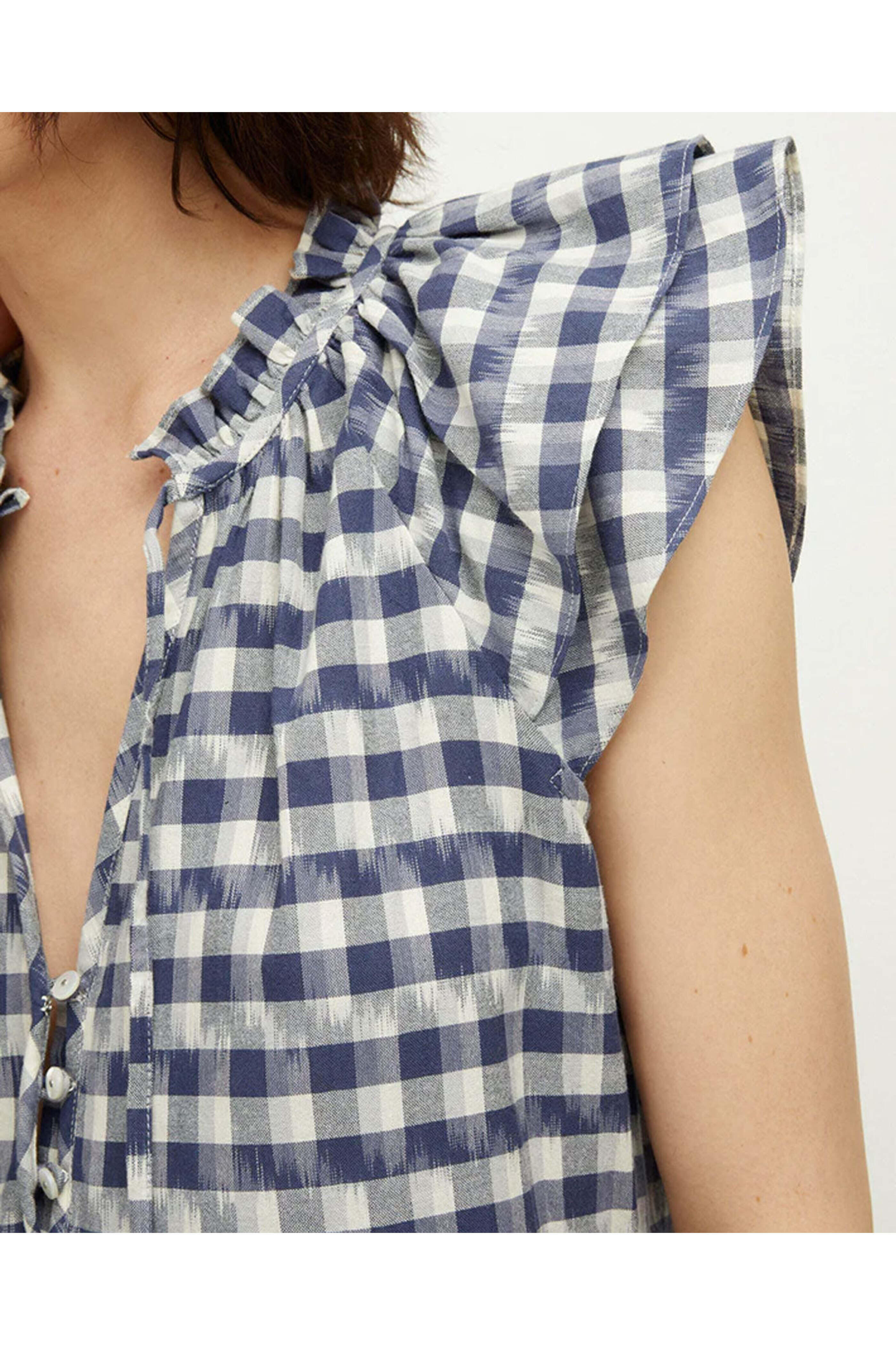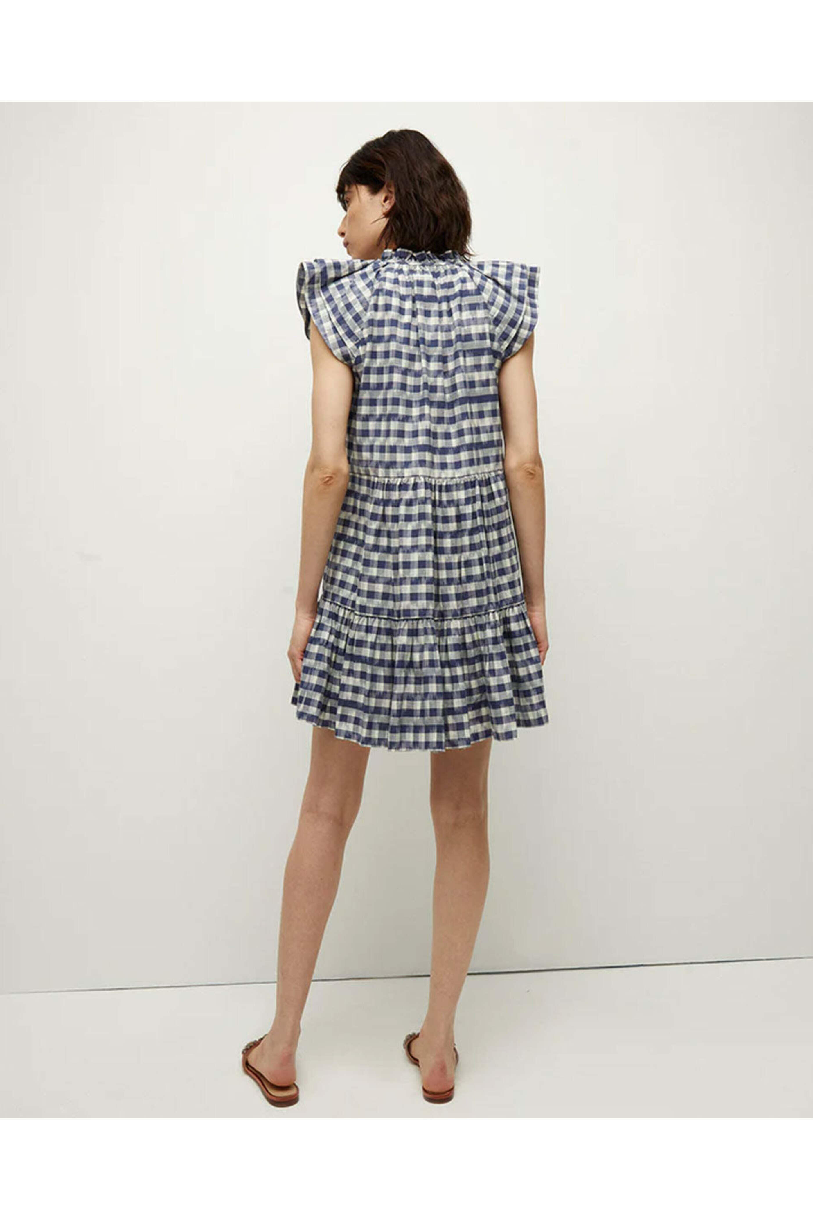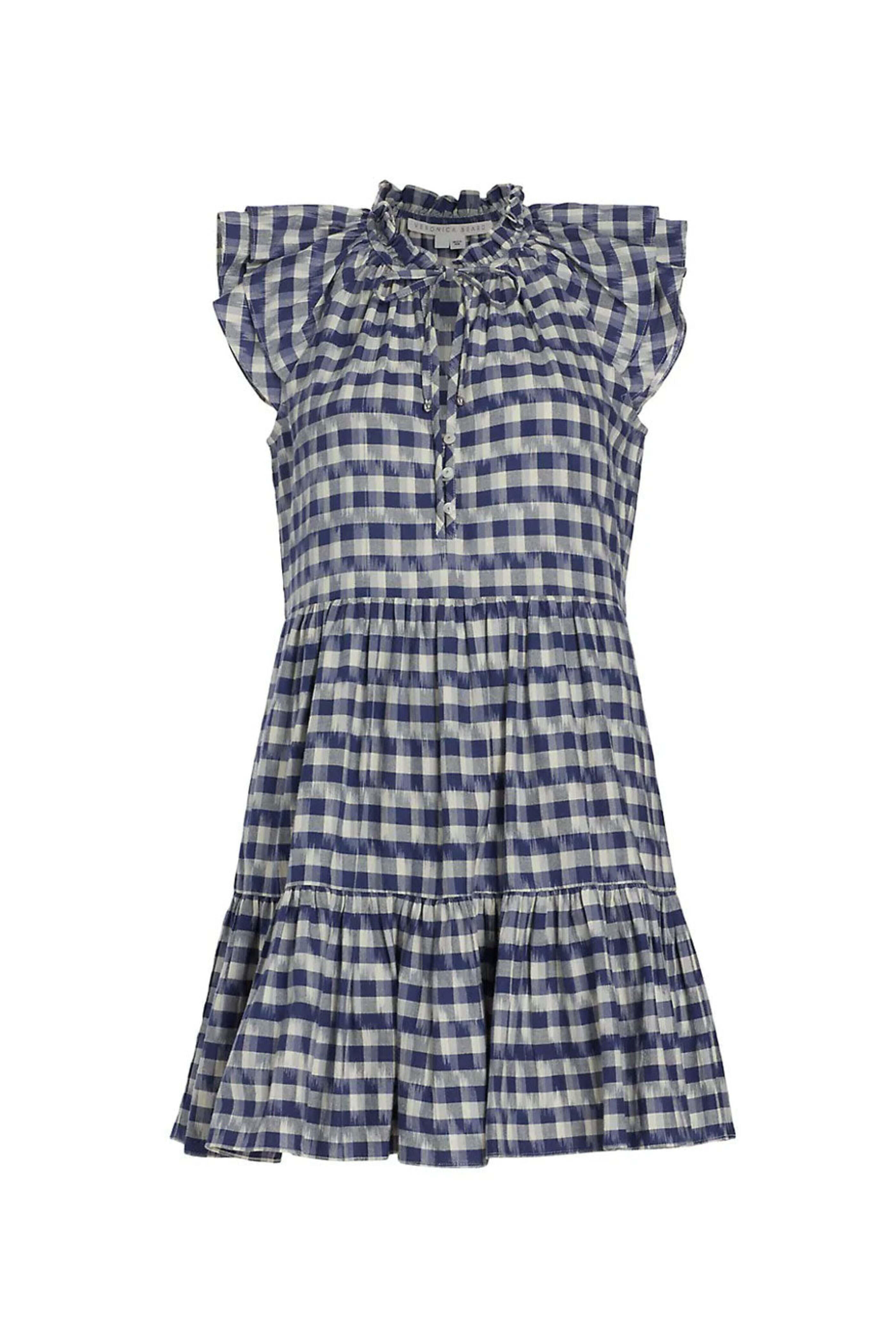 Veronica Beard Blue Multi Zee Ikat-Print Dress. Ruffle stand collar. Plunging v neckline. Flutter sleeves. Self-tie closure. Three-button placket. Relaxed fit. 100% cotton.