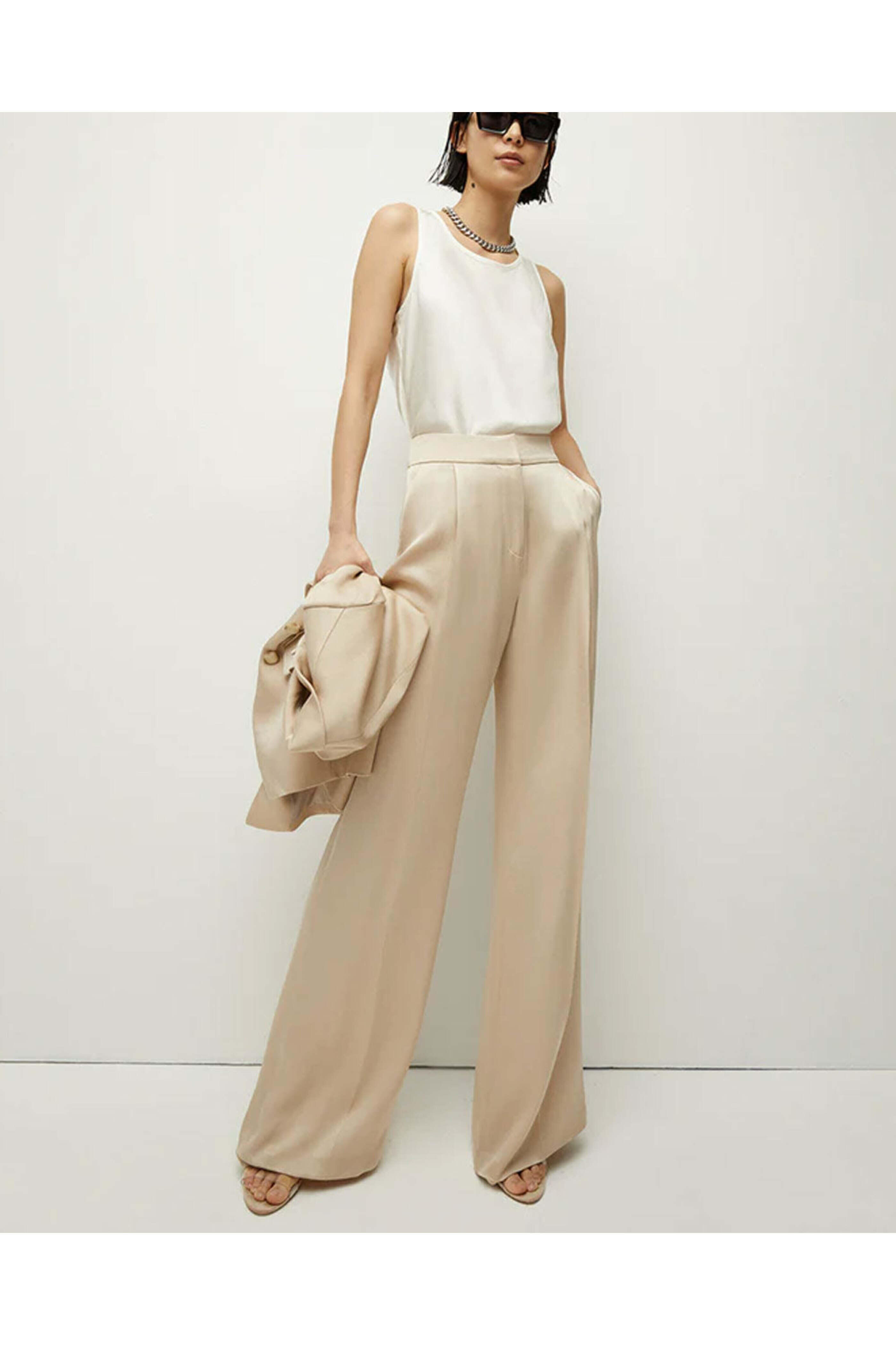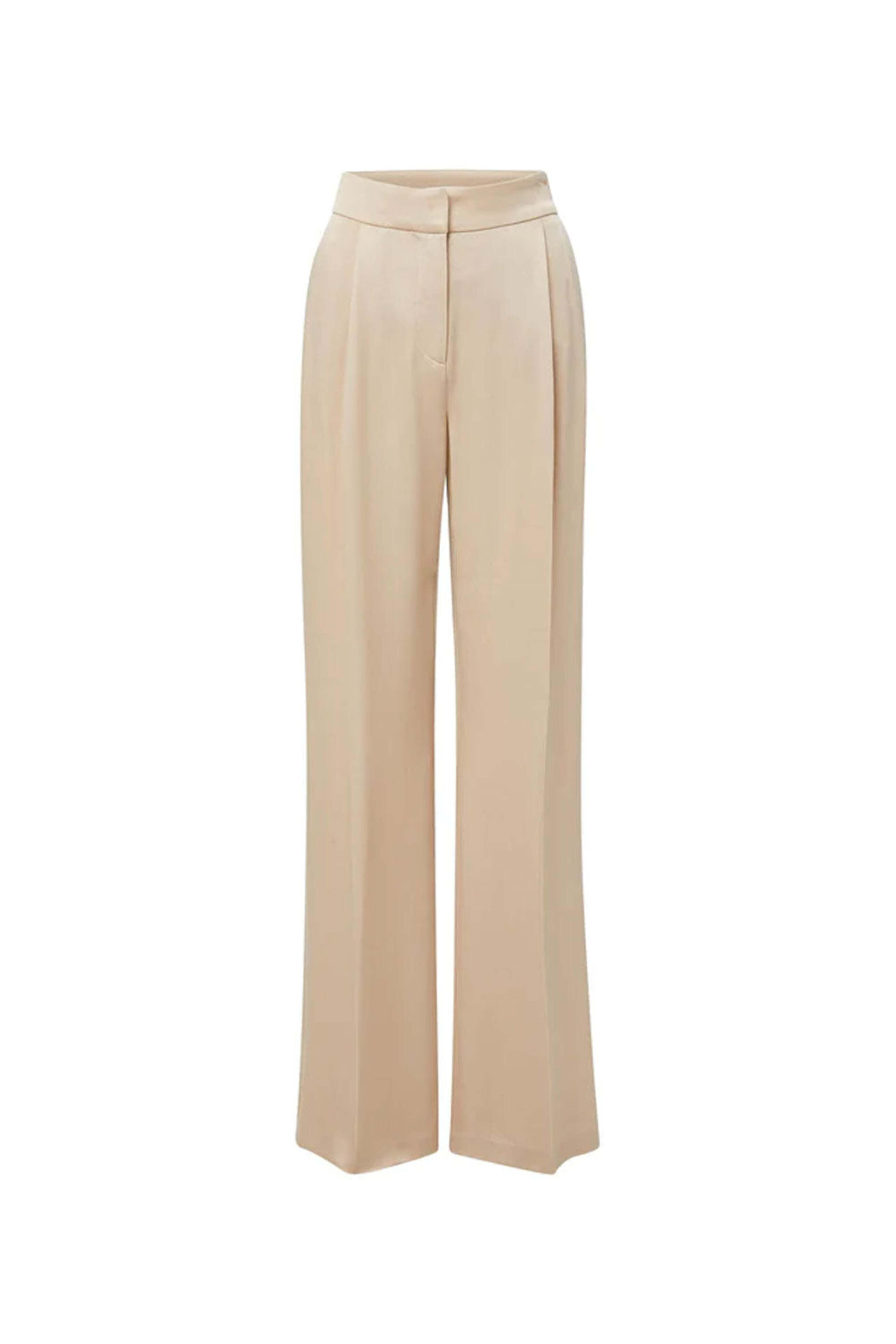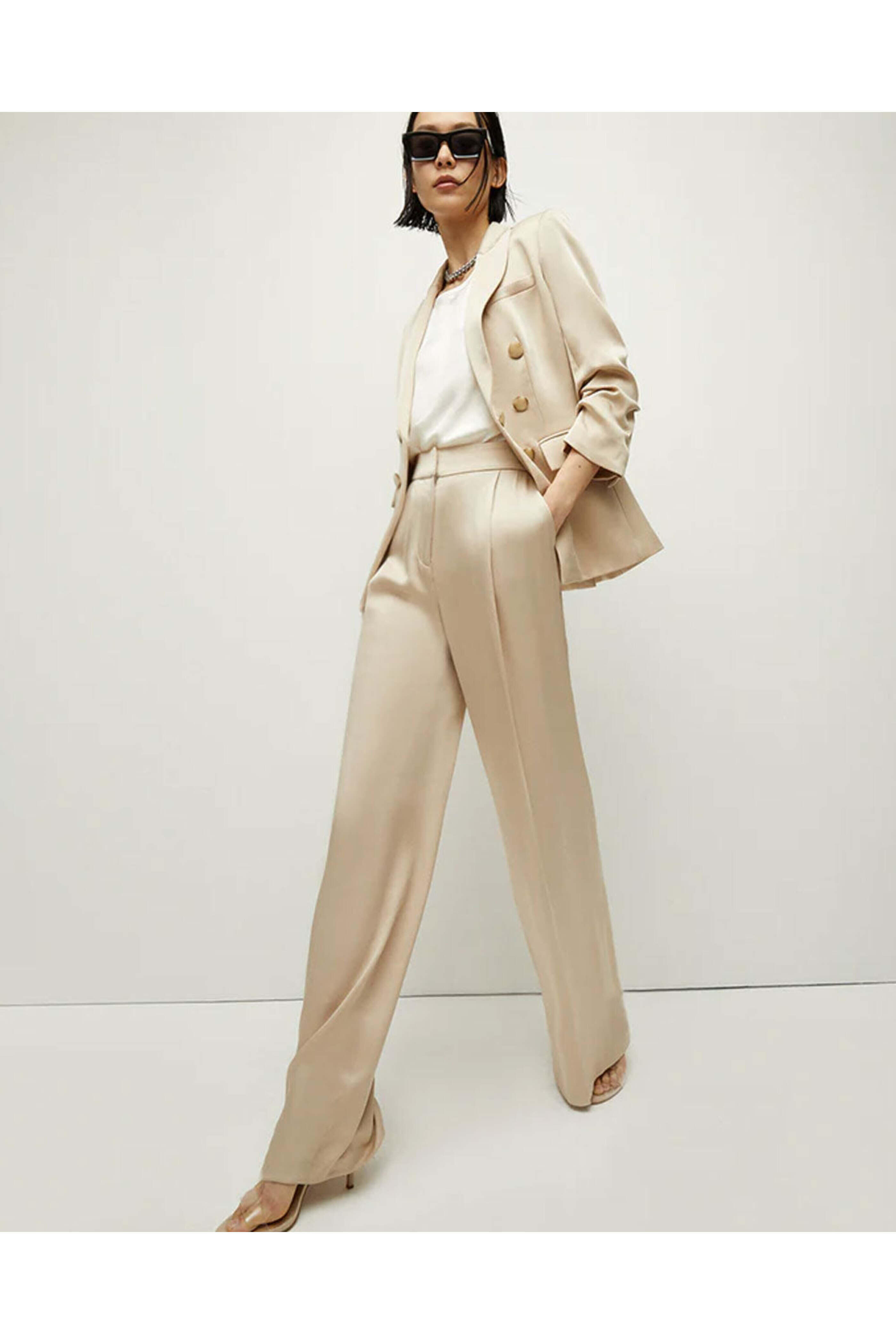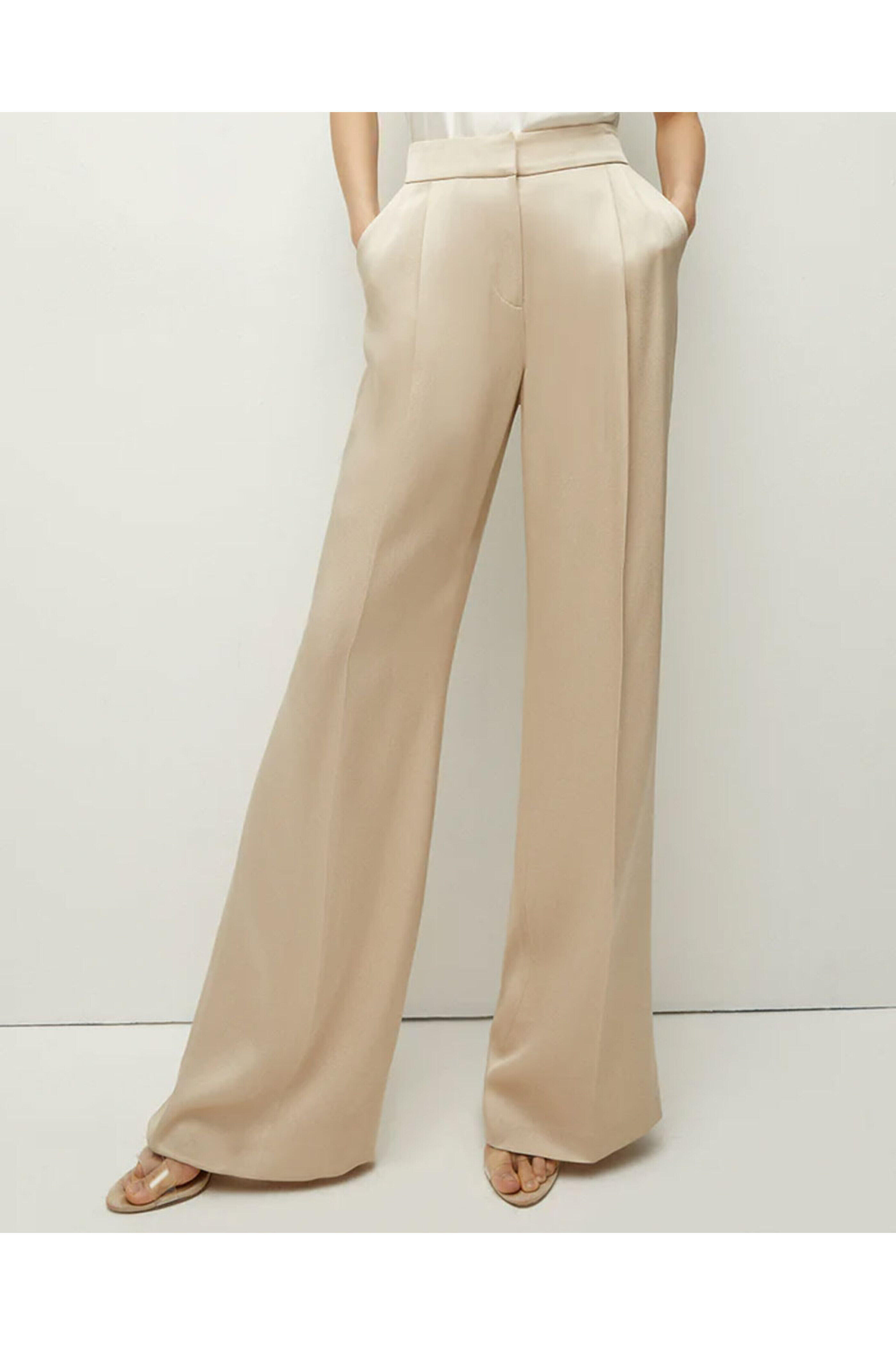 Veronica Beard Sand Robinne Pant. Pleated high waist. Hook and eye closures at waist; zip fly. Slant hook pockets and back welt pockets. Made in USA. Lined | 100% Polyester. 72% Acetate, 28% Polyester.