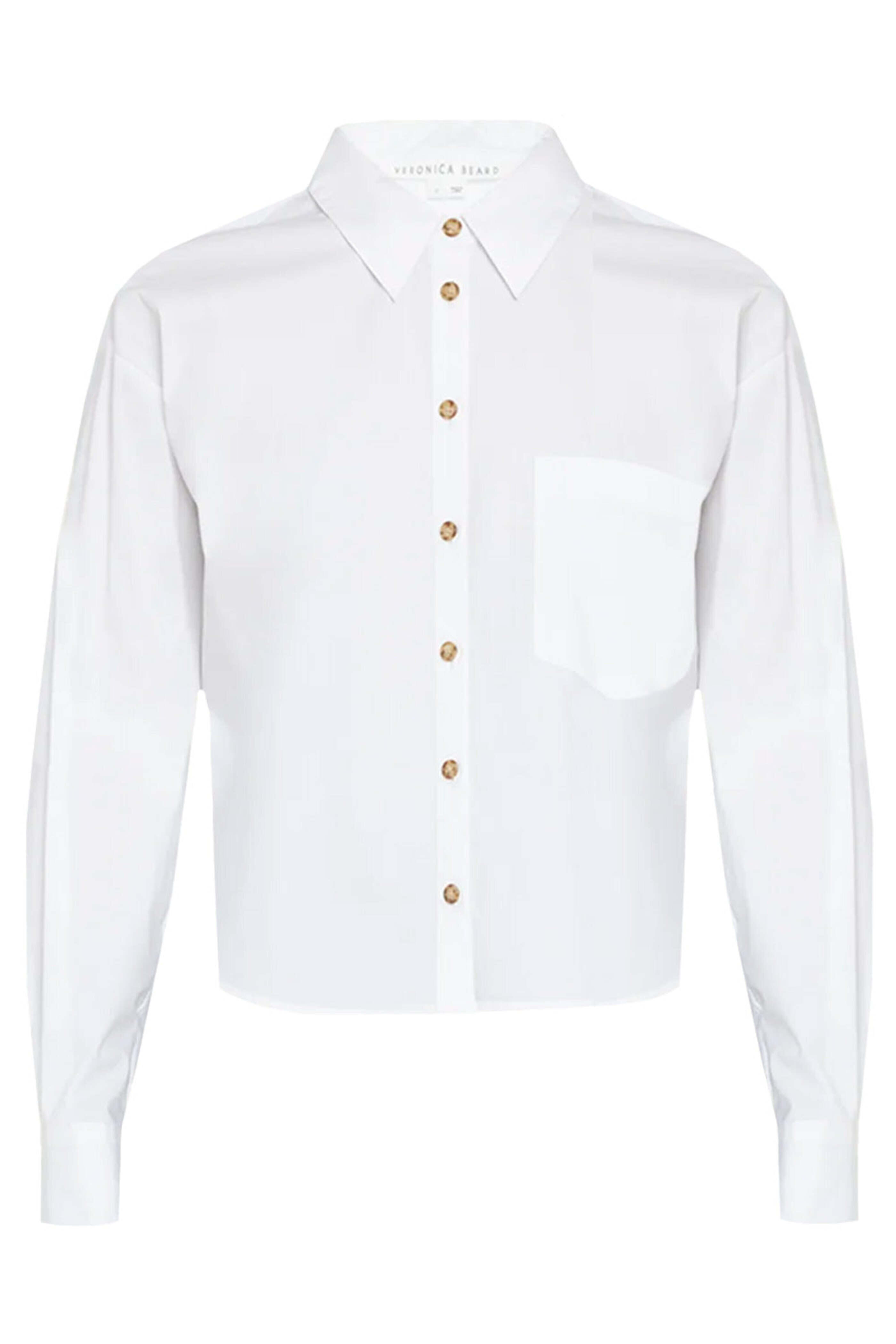 Veronica Beard White Aderes Shirt. Collar. Long sleeves; button cuffs. Button down front closure. Single chest patch pocket. Boxy fit. Cropped length. Cotton, nylon, polyamide, spandex.