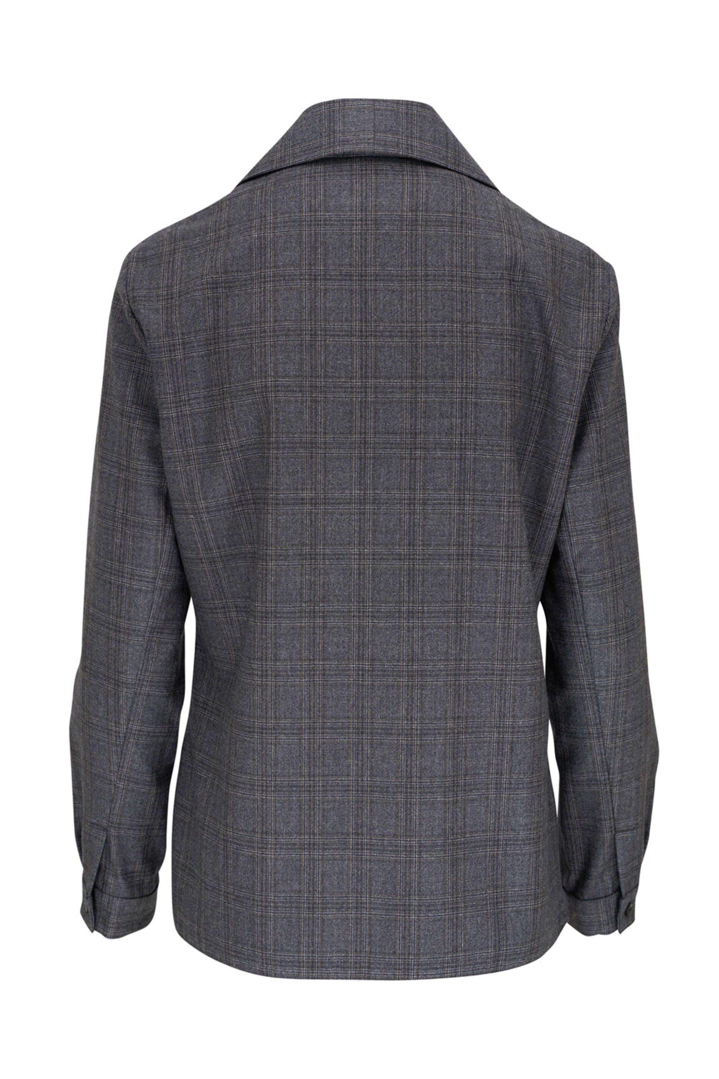 Peter Cohen Grey Glen Plaid Pert Blouse. Collar. V neck. Long sleeves; button cuffs. Button down front closure. Relaxed fit. Made in USA. 100% wool.