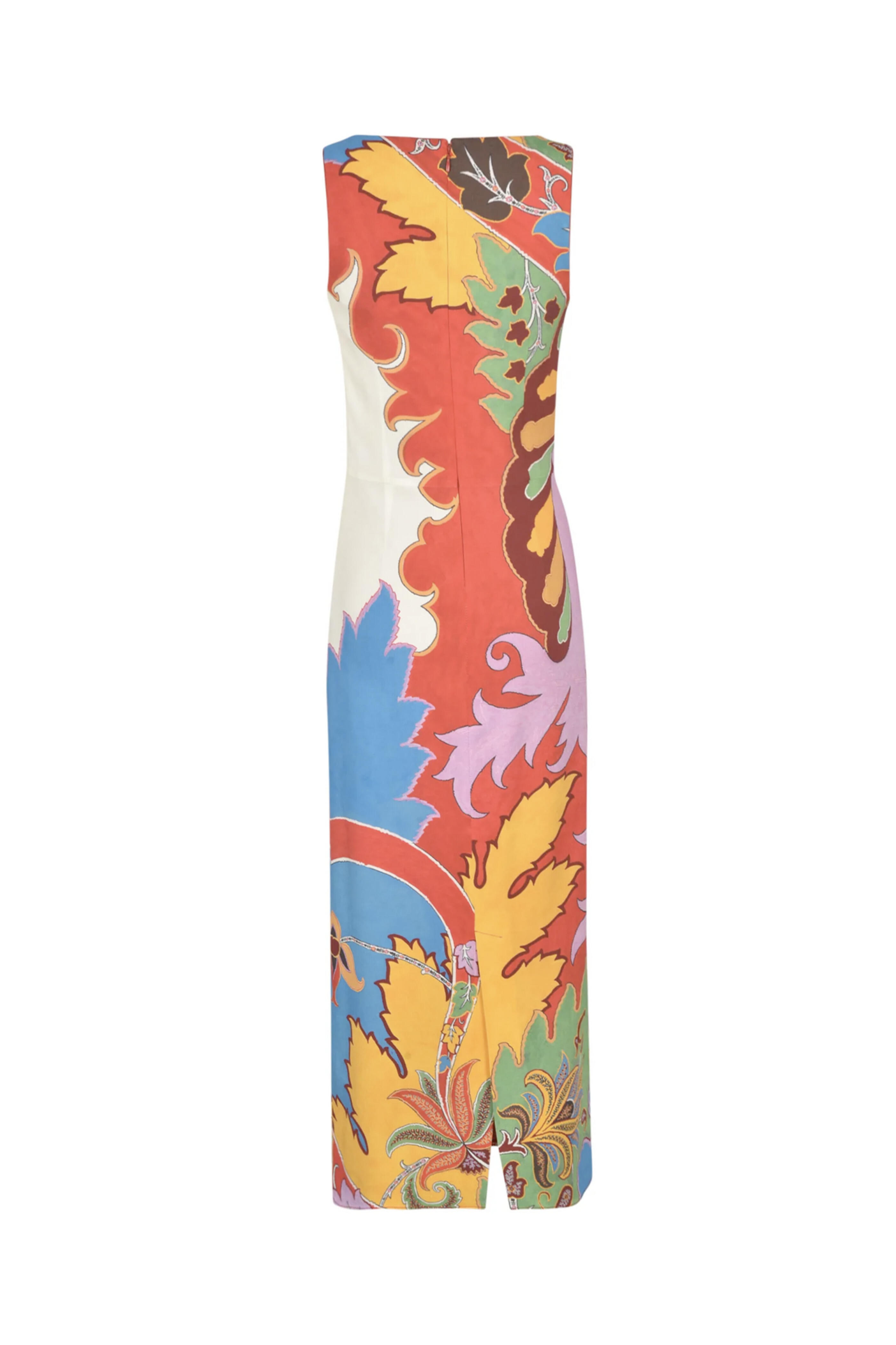 Etro Rosso Print Midi Tank Dress. Scoop neck. Sleeveless. Concealed back zip closure. Slim silhouette. Midi length. Back hem vent. Made in Italy. 97% cotton, 3% spandex.
