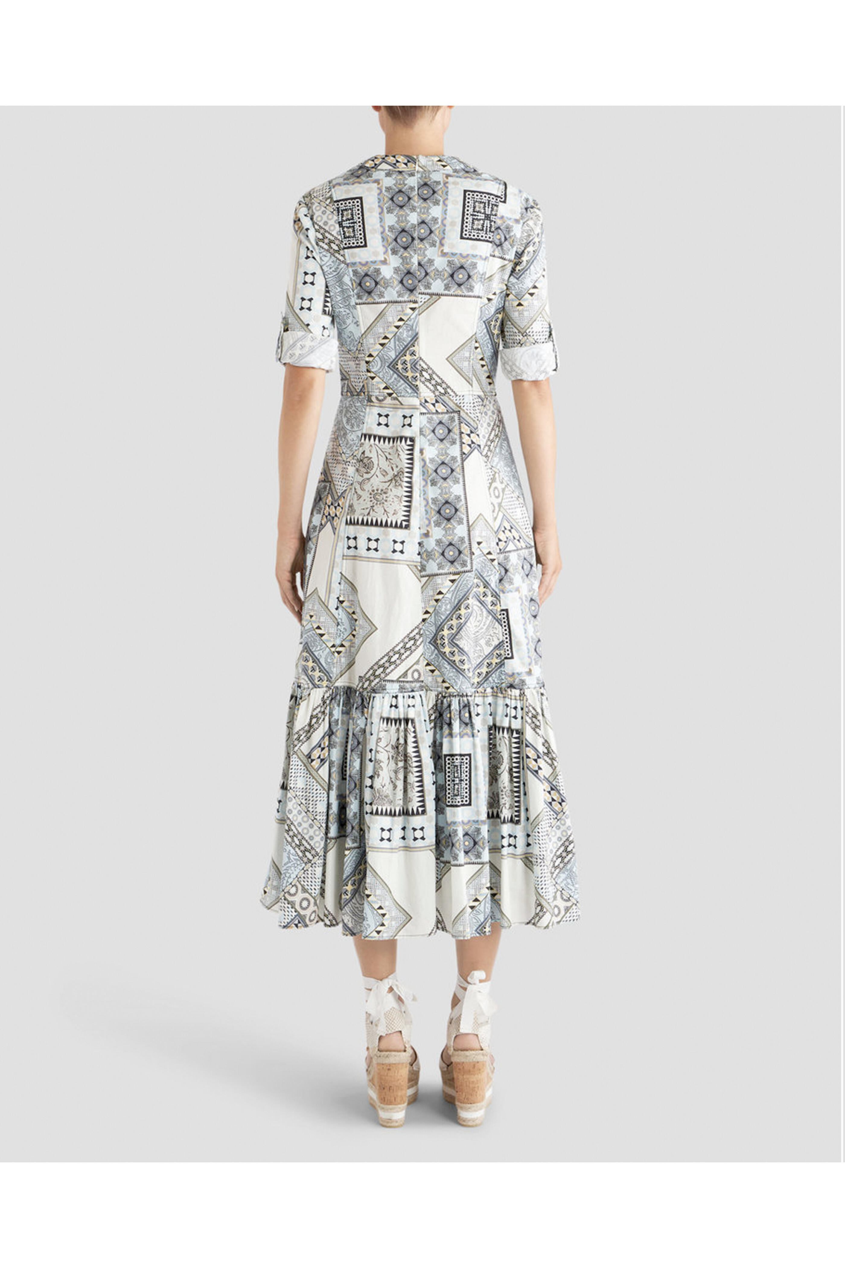 Etro Azzurro Print Patchwork Midi Dress. V neck. ¾ length sleeves. Concealed back zip closure. Tiered silhouette. Midi length. Lined. Made in Italy. 100% cotton outer, 100% viscose lining.
