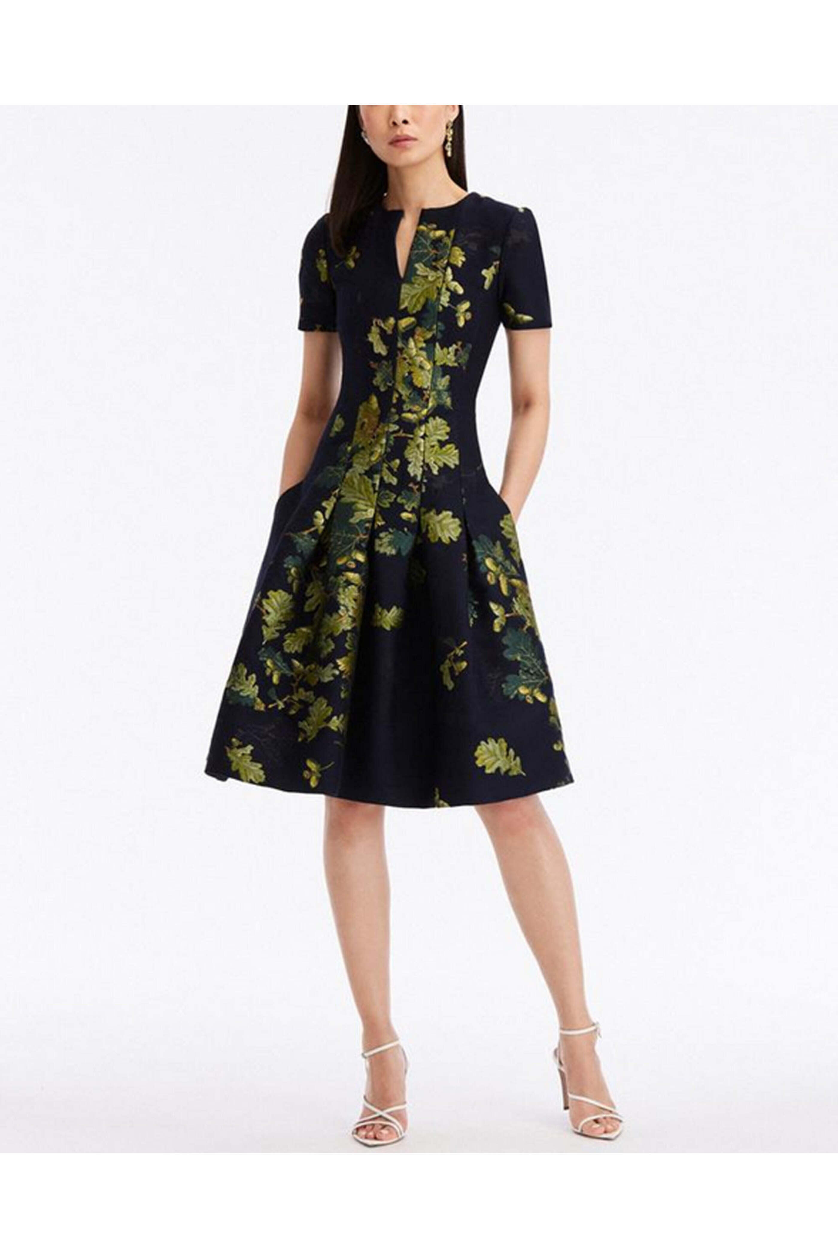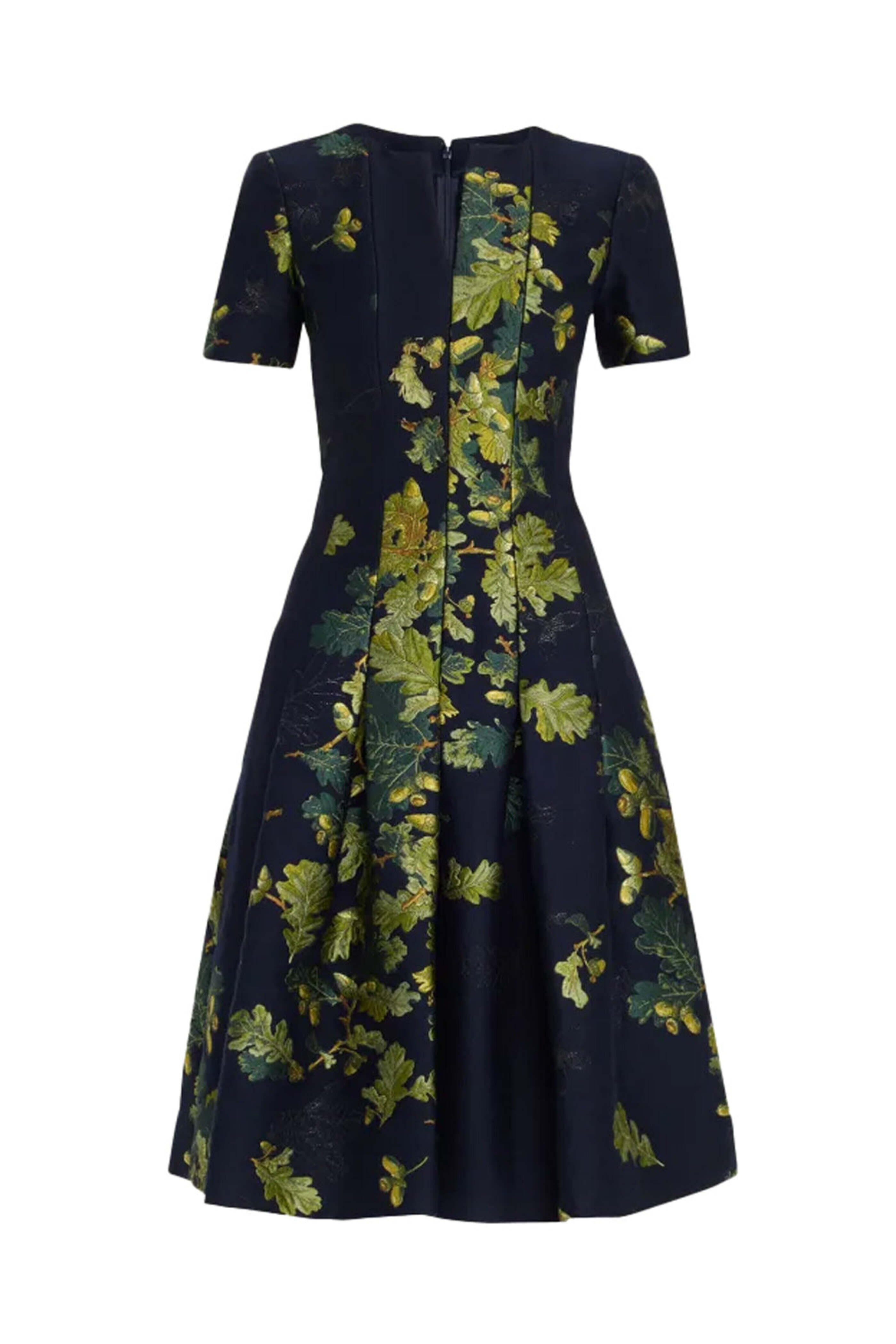 - Oscar de la Renta Green and Navy Acorn Jacquard Flare Dress