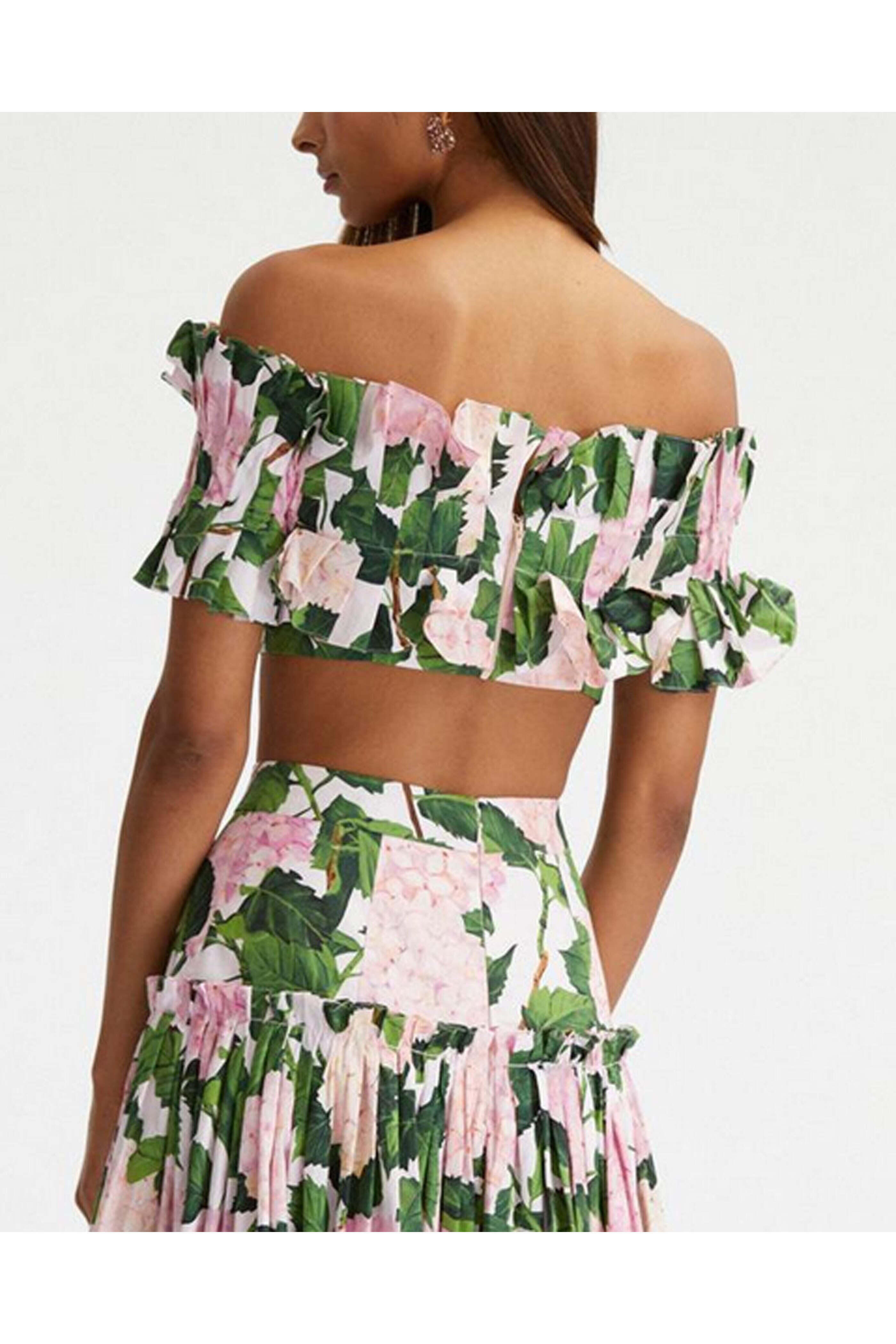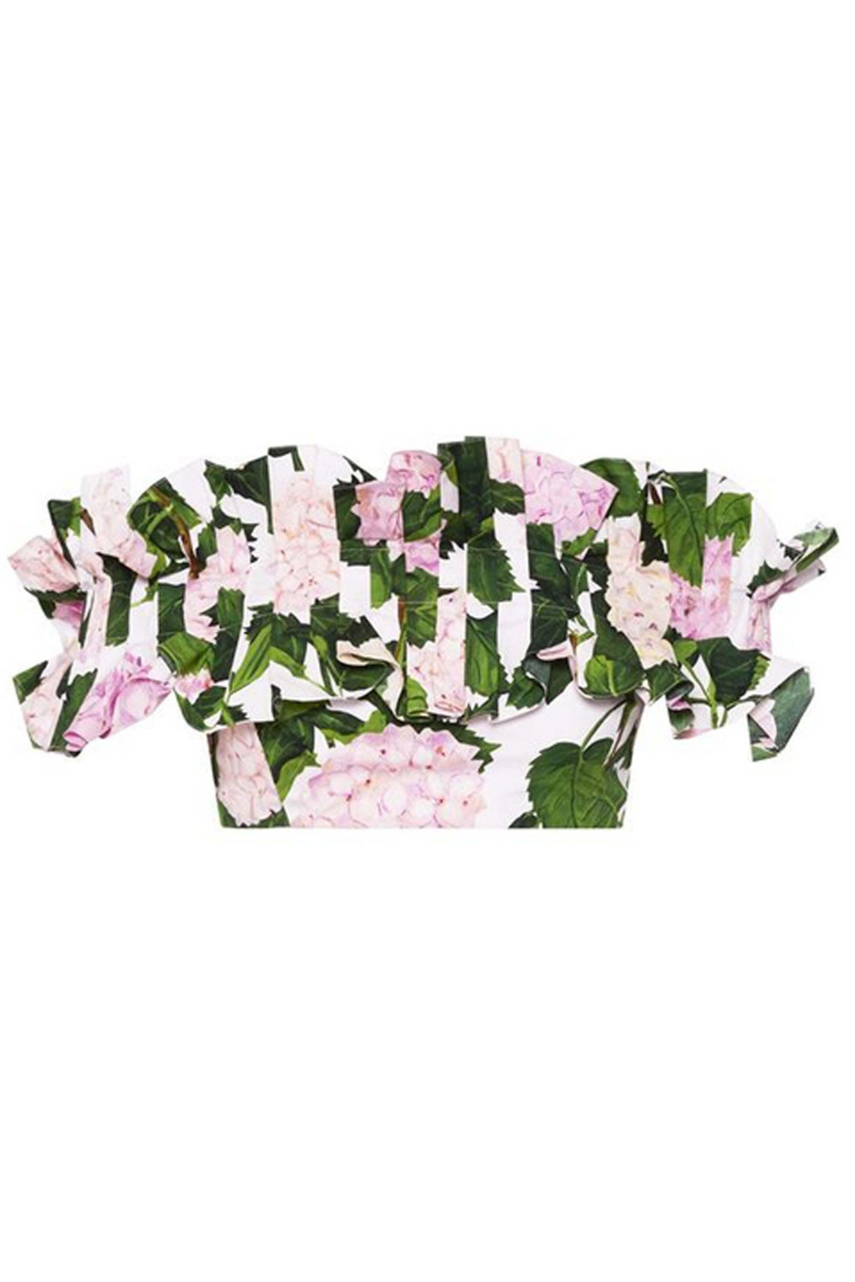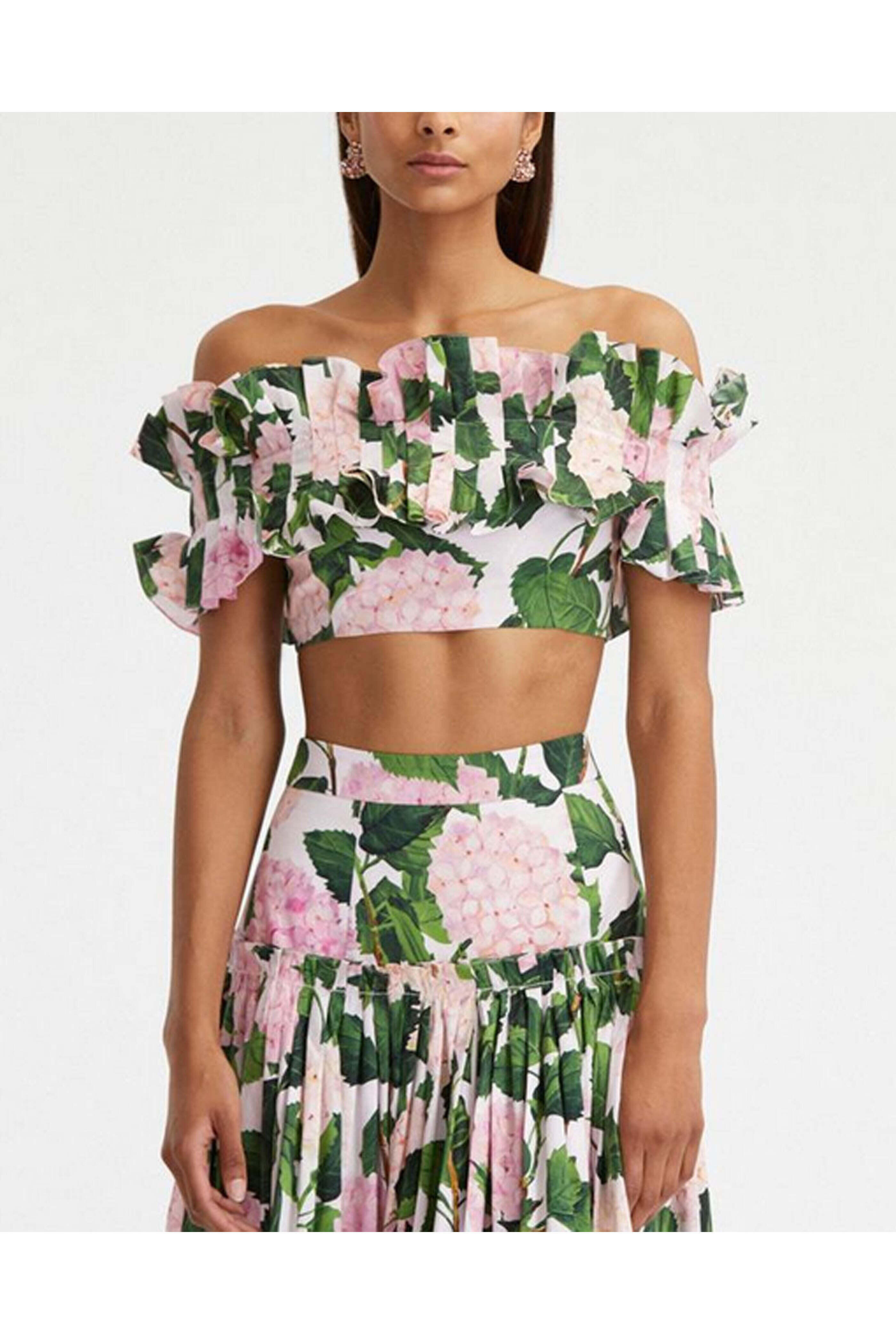 Oscar de la Renta Pink Hydrangea Ruffle Crop Blouse. Off the shoulder neckline. Short sleeves. Ruffle detail. Concealed back zip closure. Cropped length. Made in Italy. 97% cotton, 3% elastane.