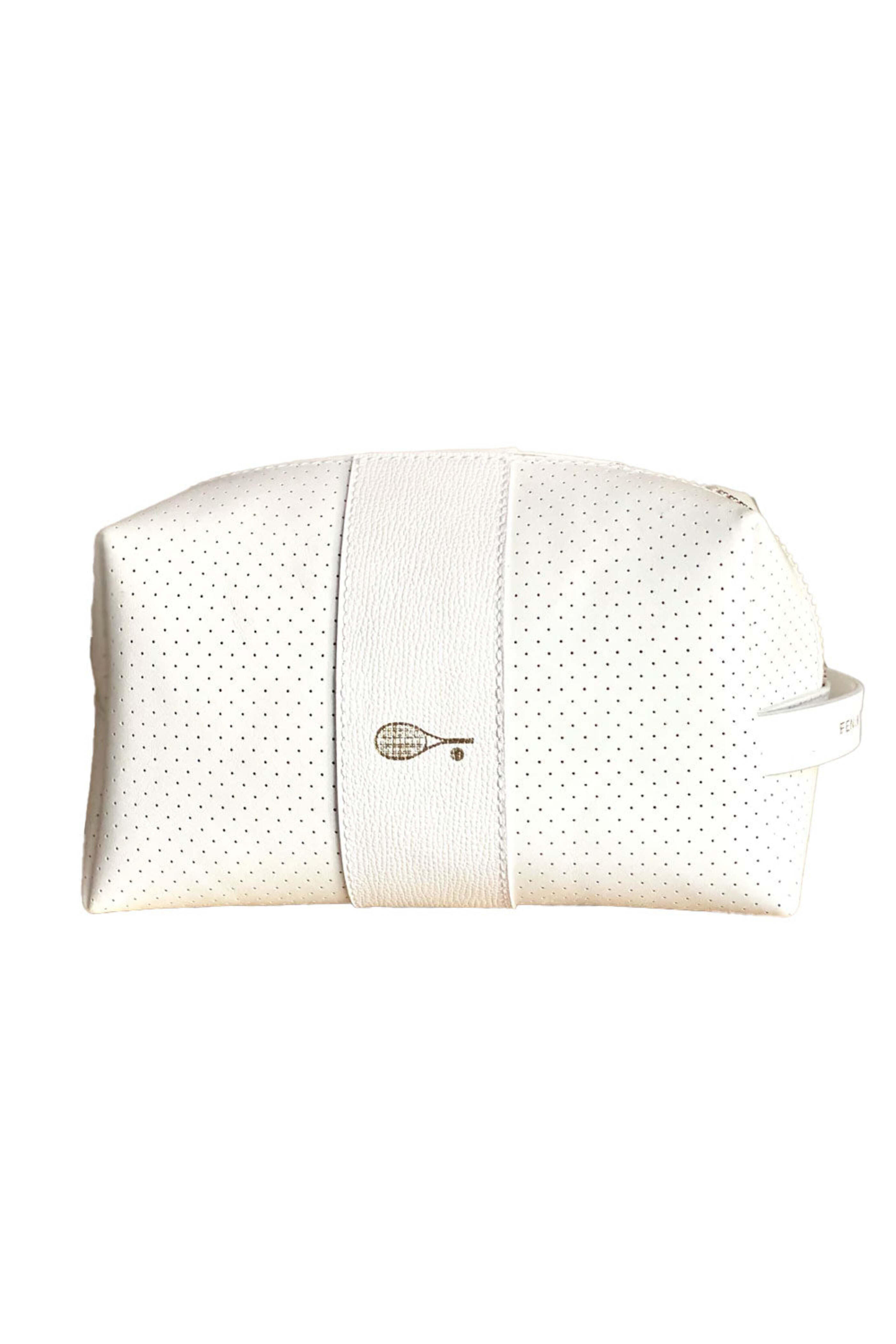 Fenix Sportier 24/7 Bag in White. Zip closure. Side handle. One main compartment. Cosmetic, gear, accessory, dopp, hold-it-all-bag. Tennis racket and ball icon stamped in gold at the front. Gold hardware. Signature perforated leather outer. Suede lining. Handcrafted in LA.