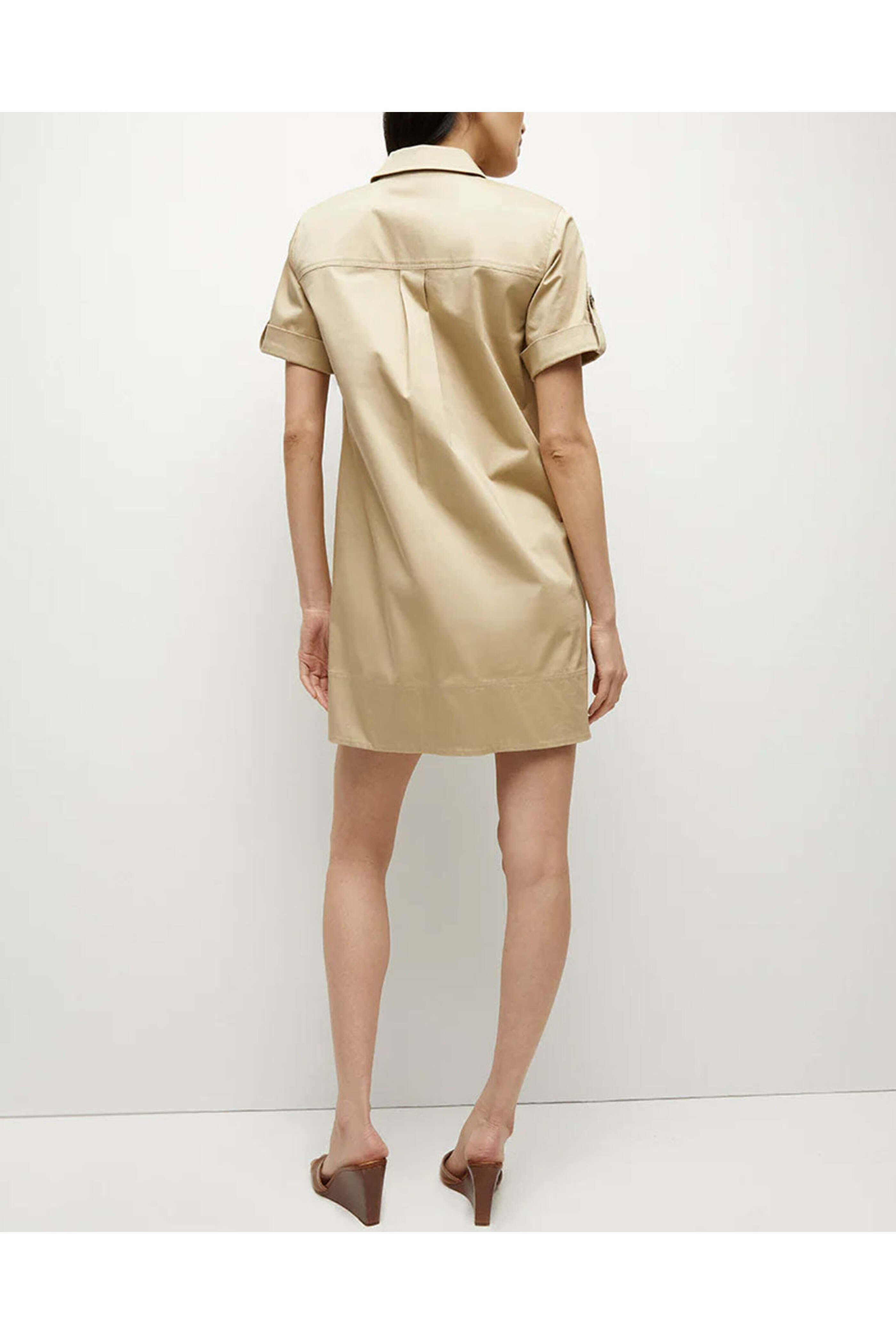 Veronica Beard Pebble Khaki Lucca Shirt Dress. Collar. Short sleeves. Roll sleeve tabs. Quarter button placket. Chest patch pockets. Hip flap pockets. Statement buttons. Relaxed fit. Mini length. Lined. 97% cotton, 3% elastane outer, 100% cotton lining.