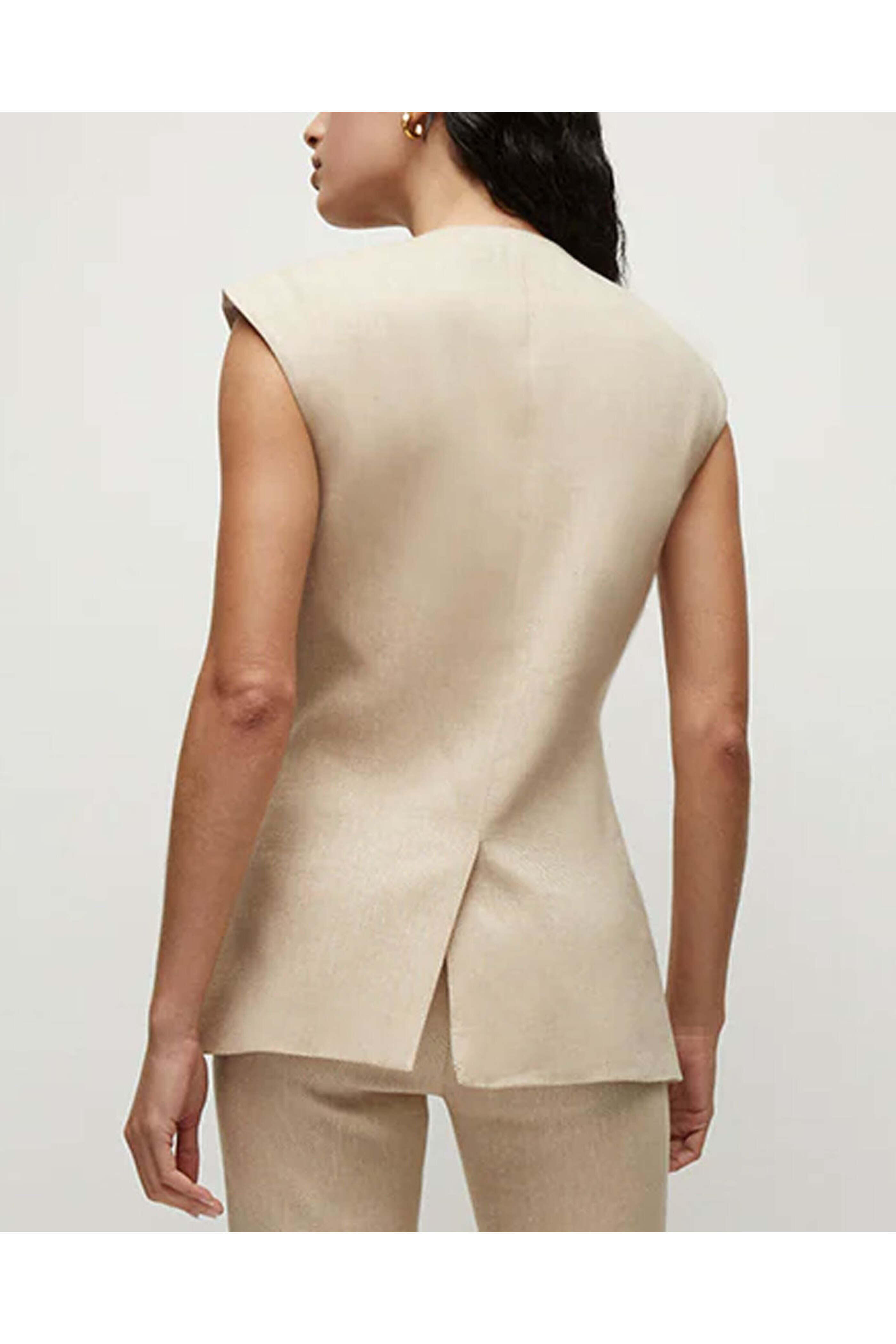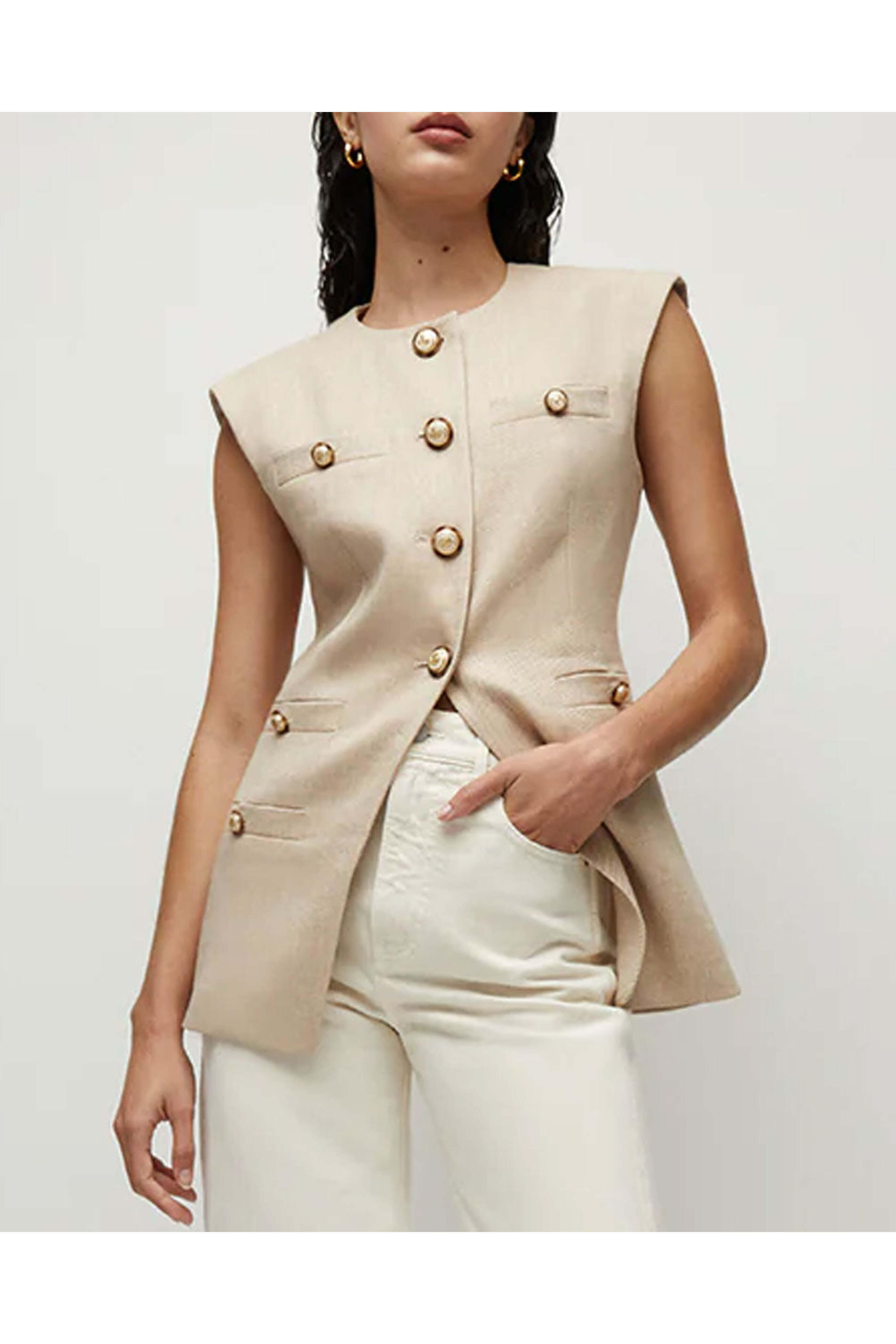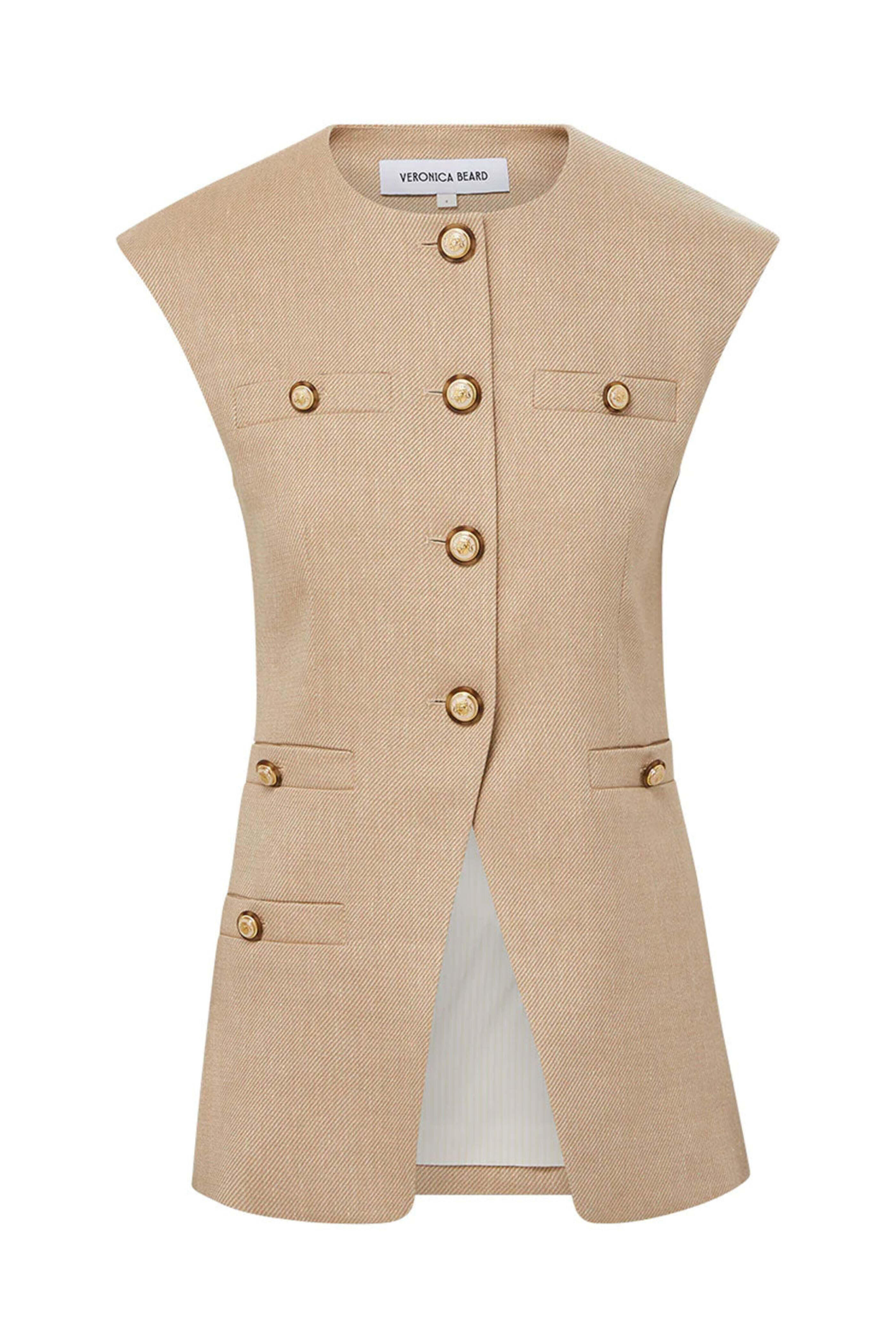 Veronica Beard Sandalwood Tamara Vest. Round neck. Structured shoulders. Sleeveless. Front button down front closure. Chest welt pockets. Hip welt pockets; double pockets at right side. Statement buttons throughout. Tailored fit. Linen fabrication. Lined. 53% linen, 29% polyester, 16% viscose, 2% elastane outer, 96% polyester, 4% elastane lining.