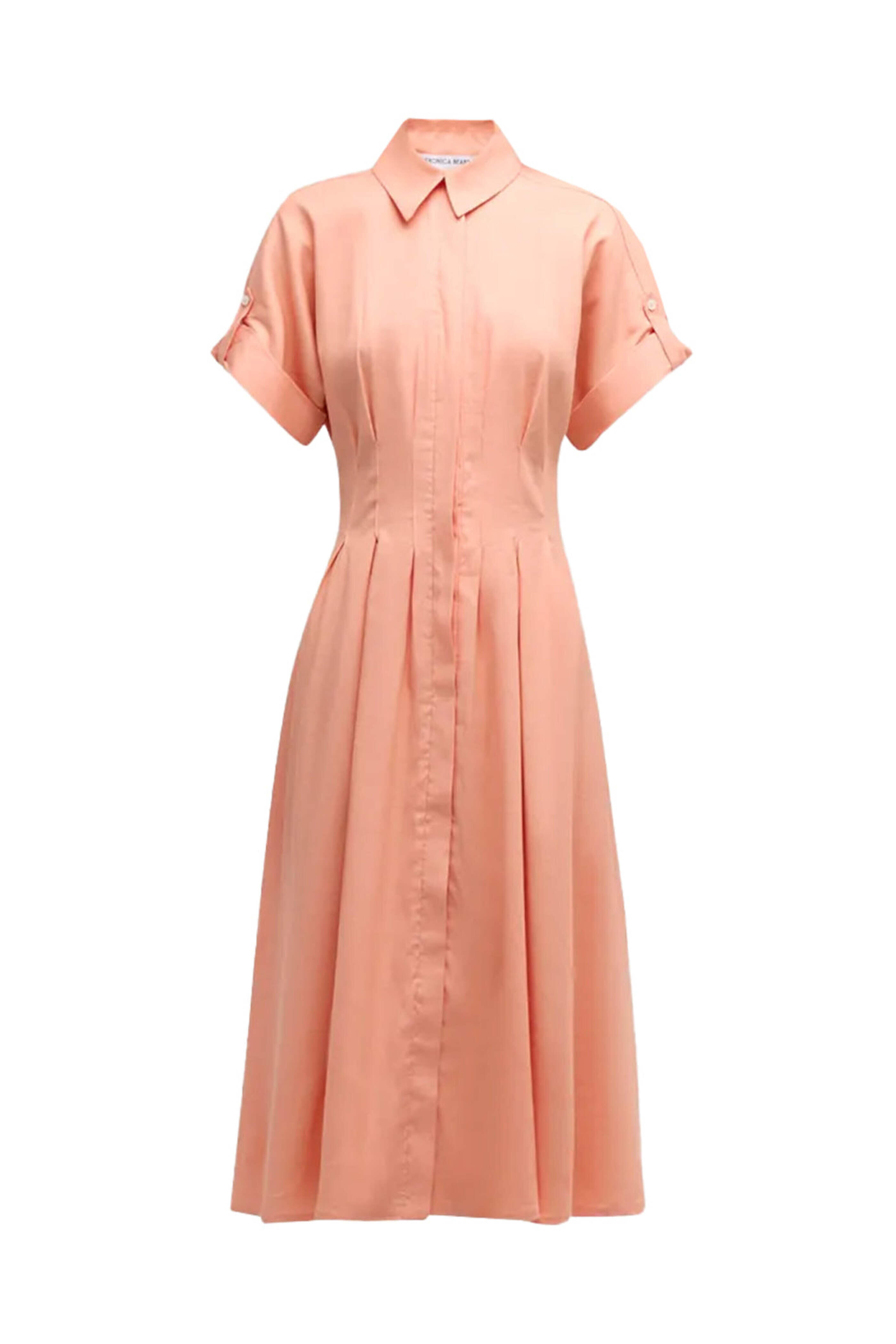 Veronica Beard Coral Adavi Dress. Collar. Short sleeves; folded cuffs. Concealed button down front closure. Pintuck detail. Slim through waist. Midi length. 100% polyester.