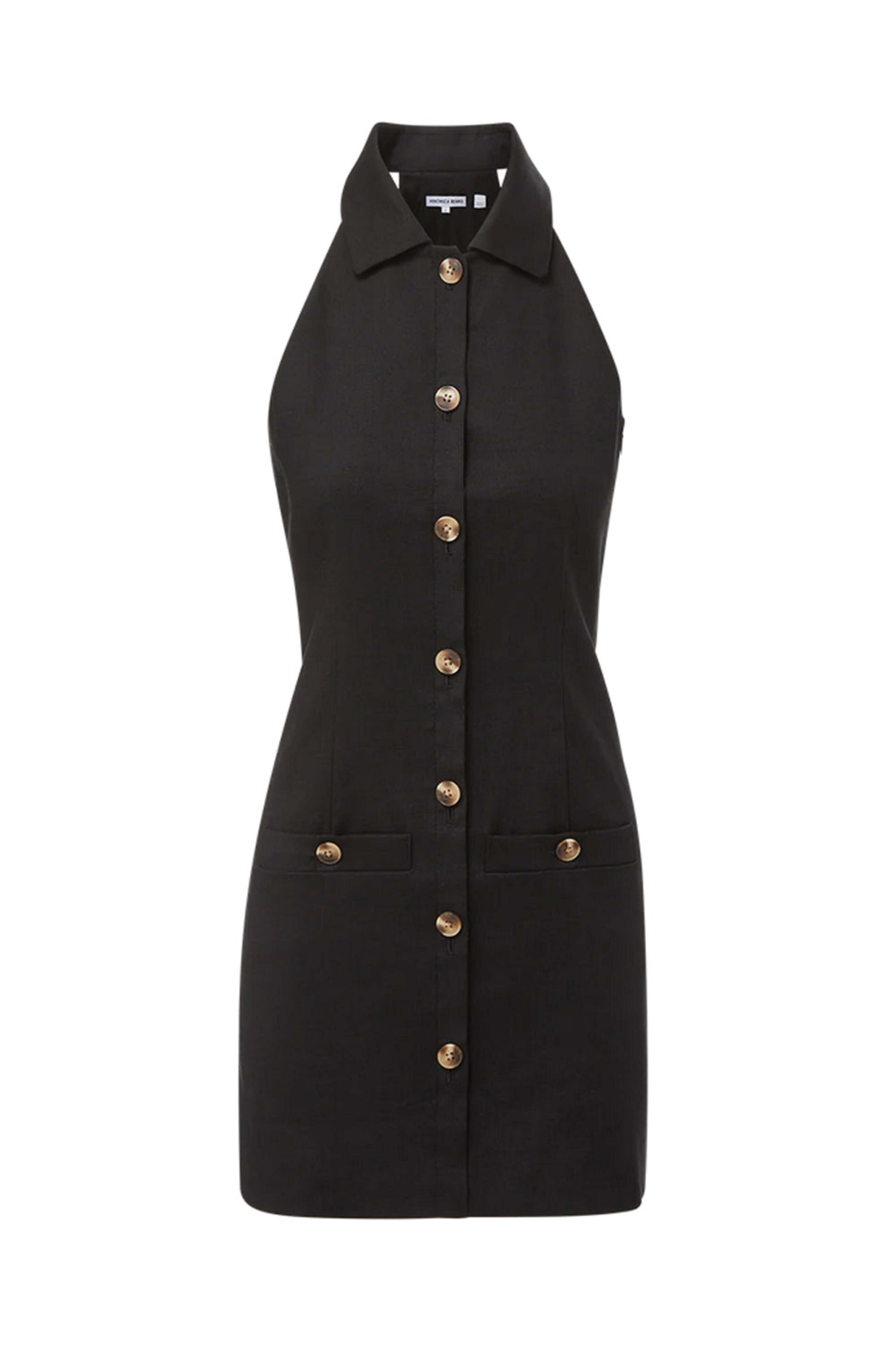 Veronica Beard Black Roxanne Dress. Collar. Sleeveless. Button down front closure. Hip welt pockets. Gold tone statement button detail. Slim silhouette. Mini length. Linen fabrication. Lined. 55% Linen, 43% viscose, 2% elastane outer, 100% polyester lining.