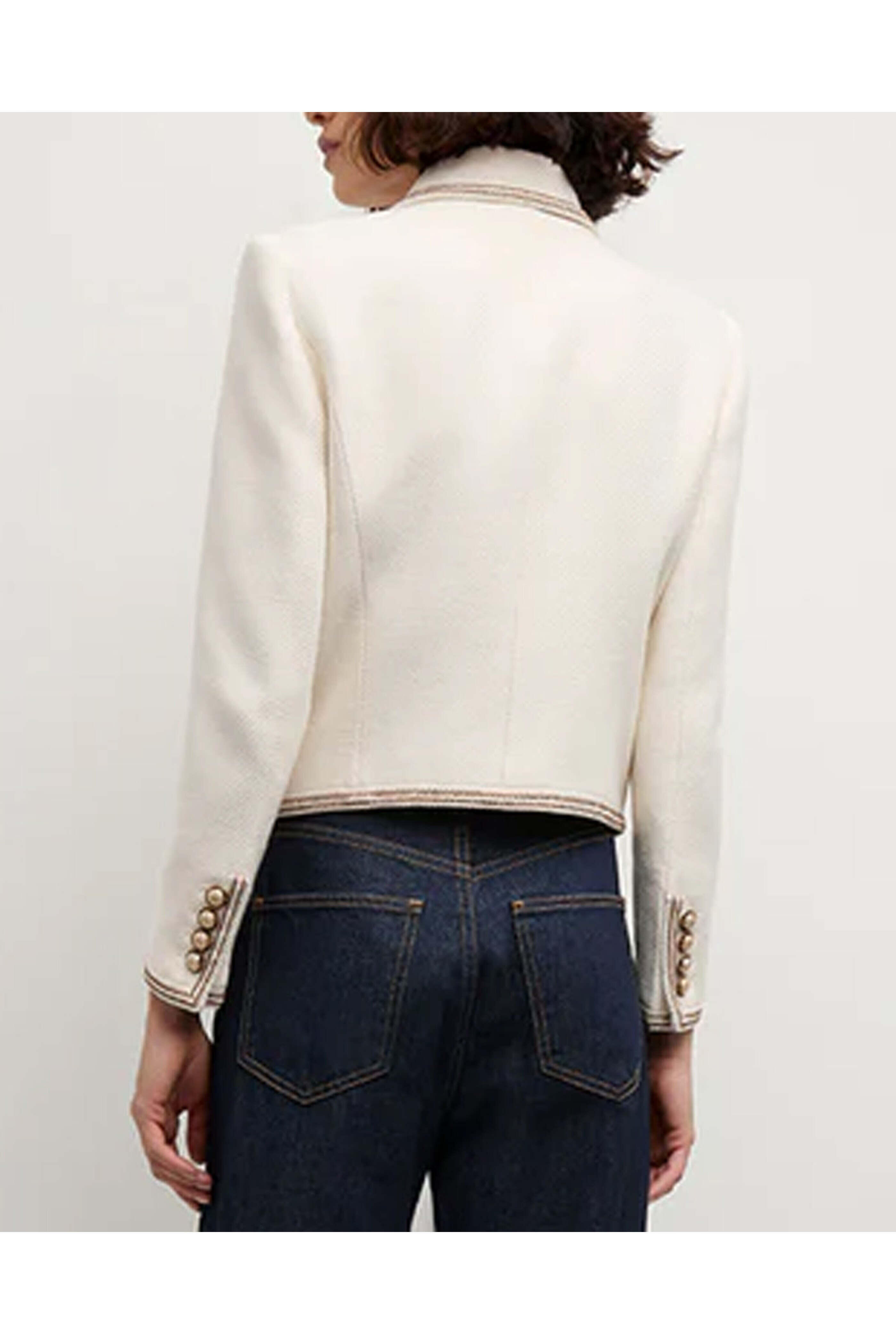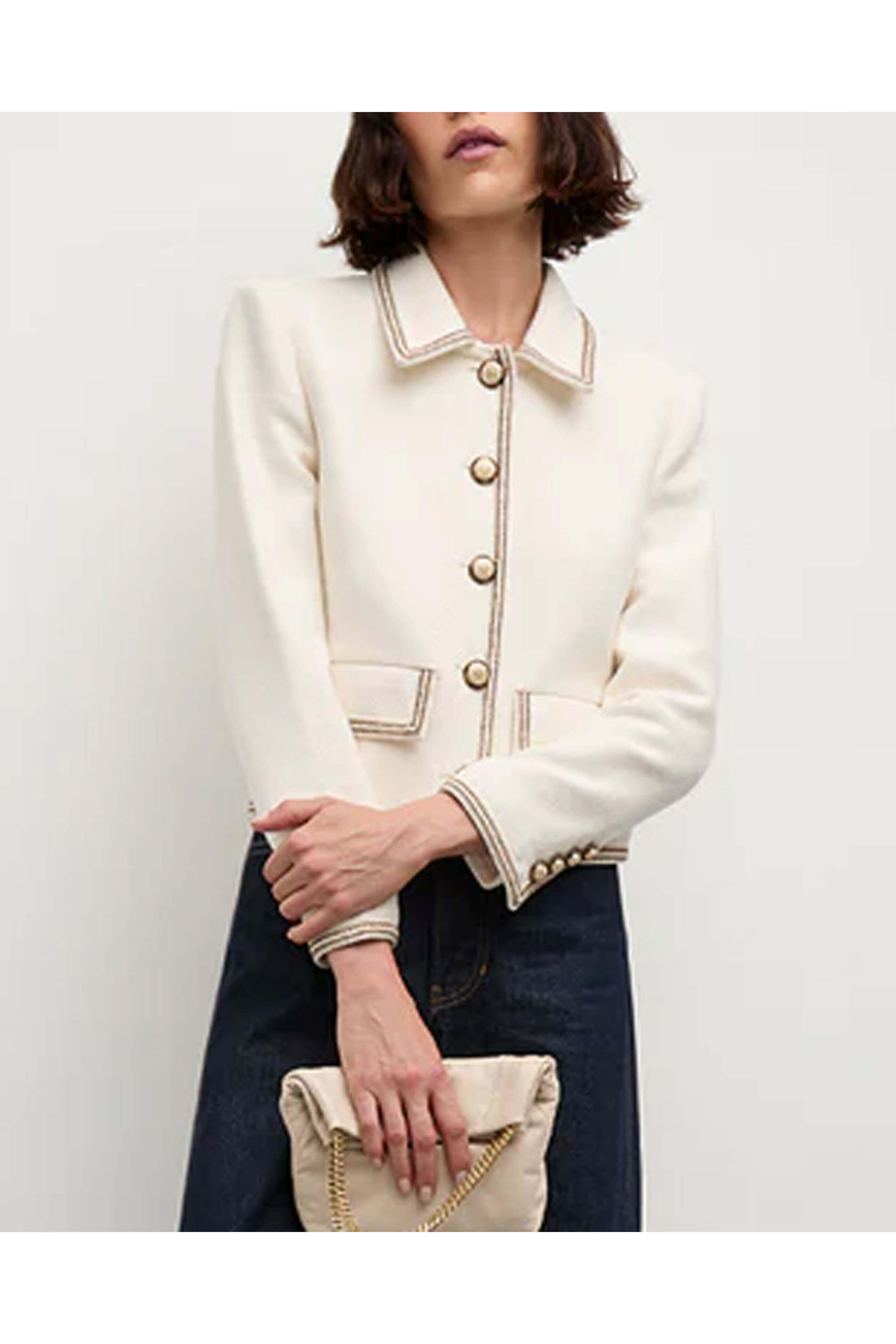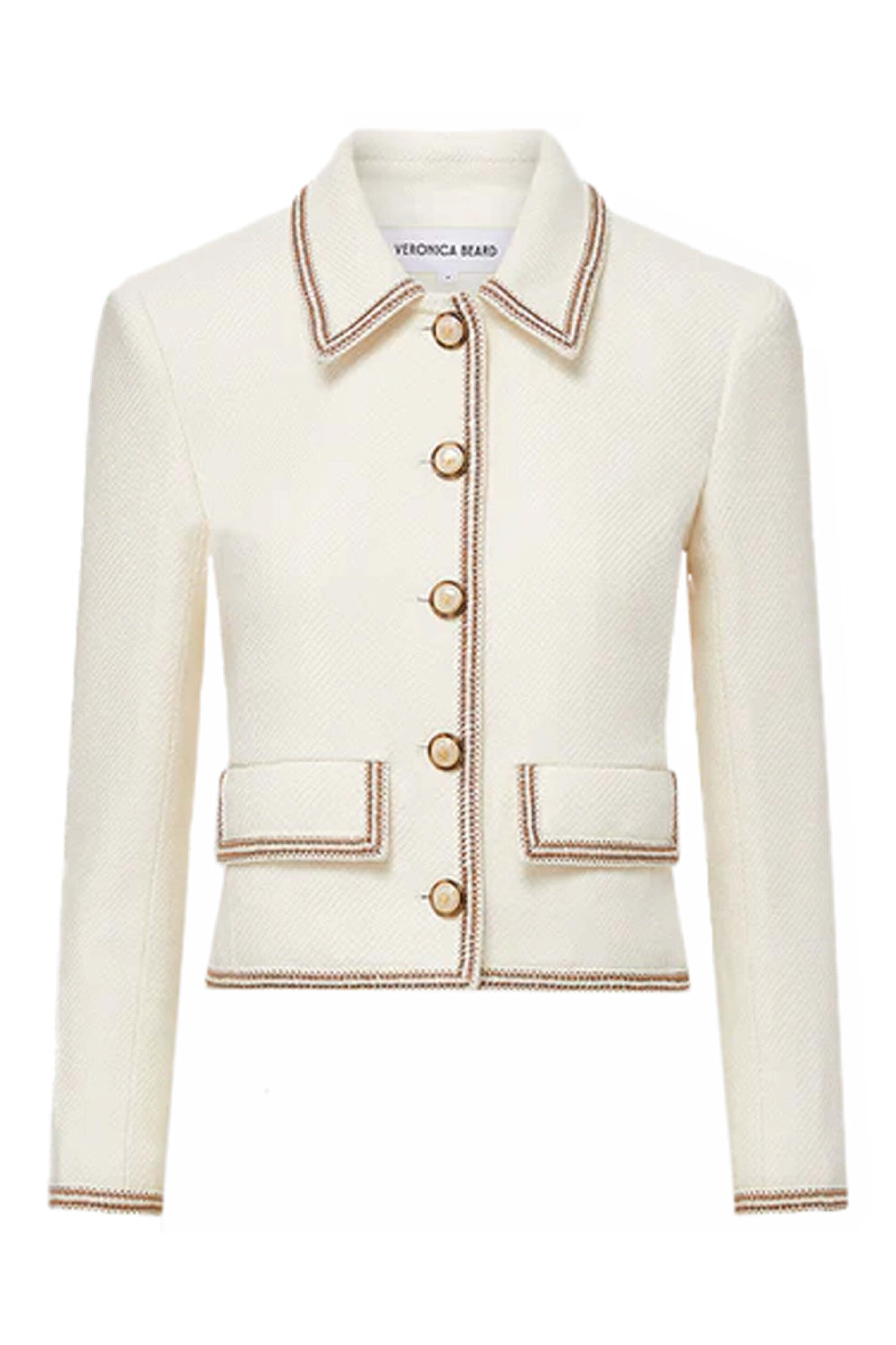 Veronica Beard Ivory Makayla Jacket. Collar. Bracelet length sleeves; button cuffs. Button down front closure. Hip flap pockets. Boxy fit. Lined. 53% cotton, 47% acrylic outer, 100% polyester lining.