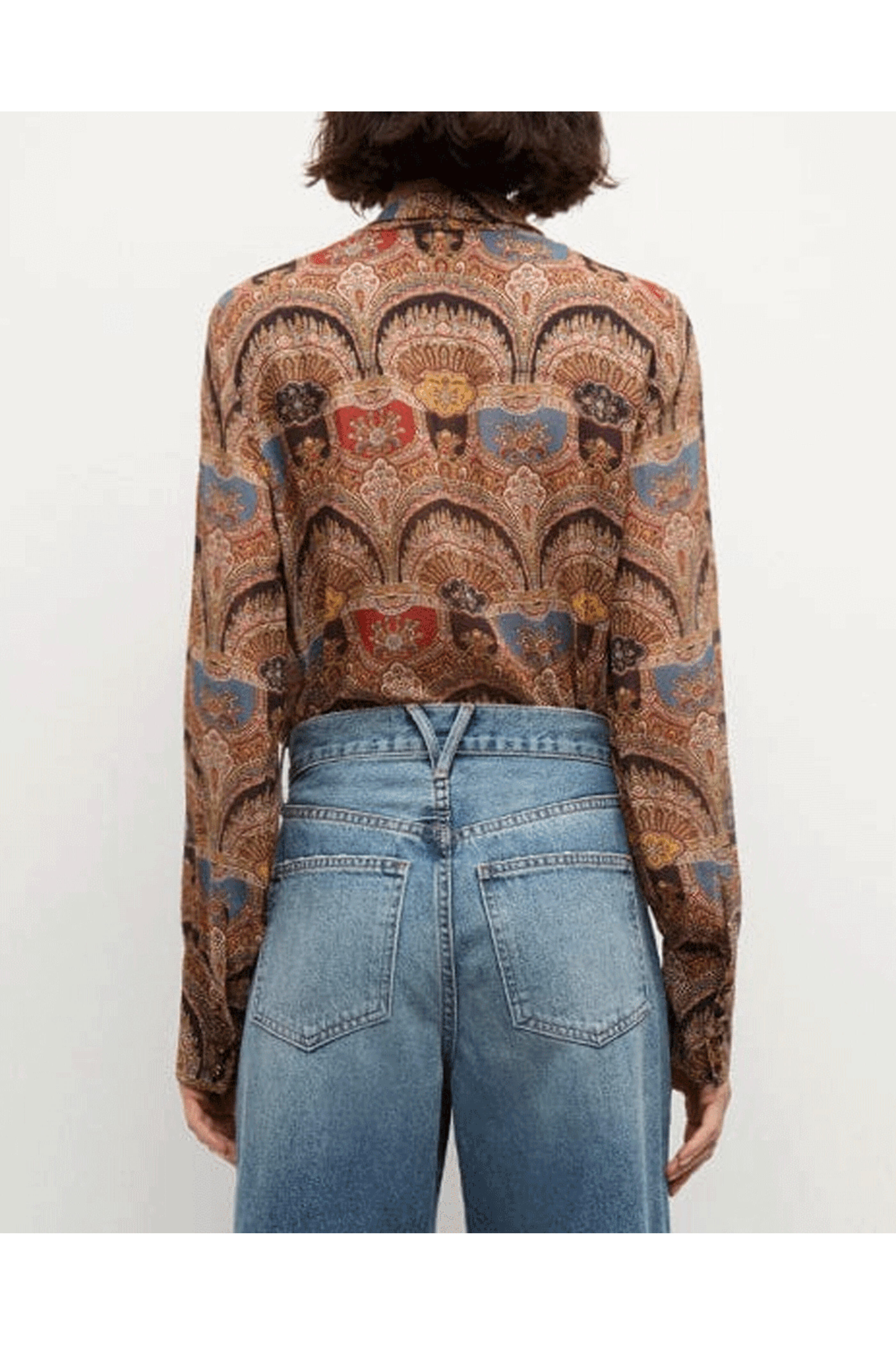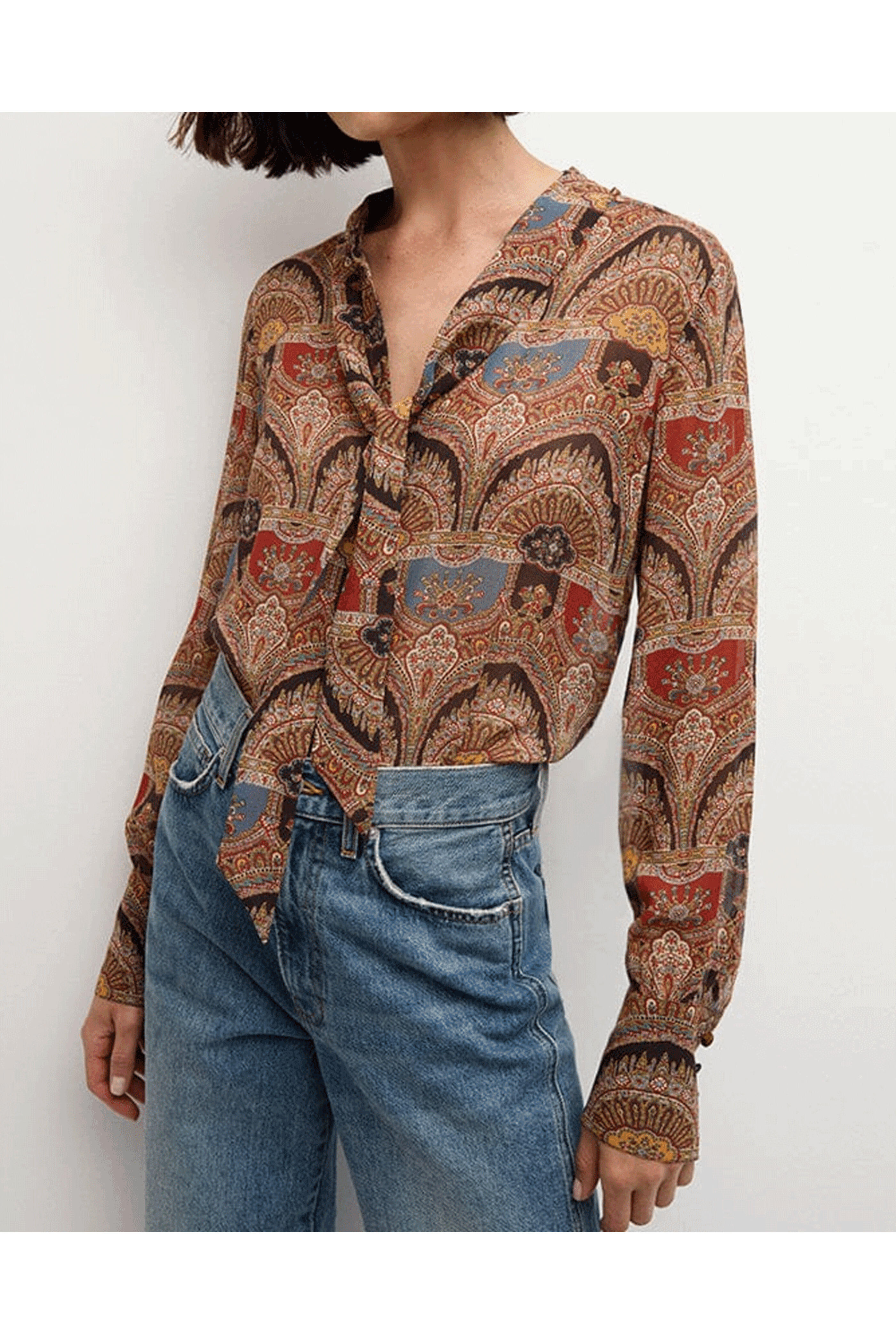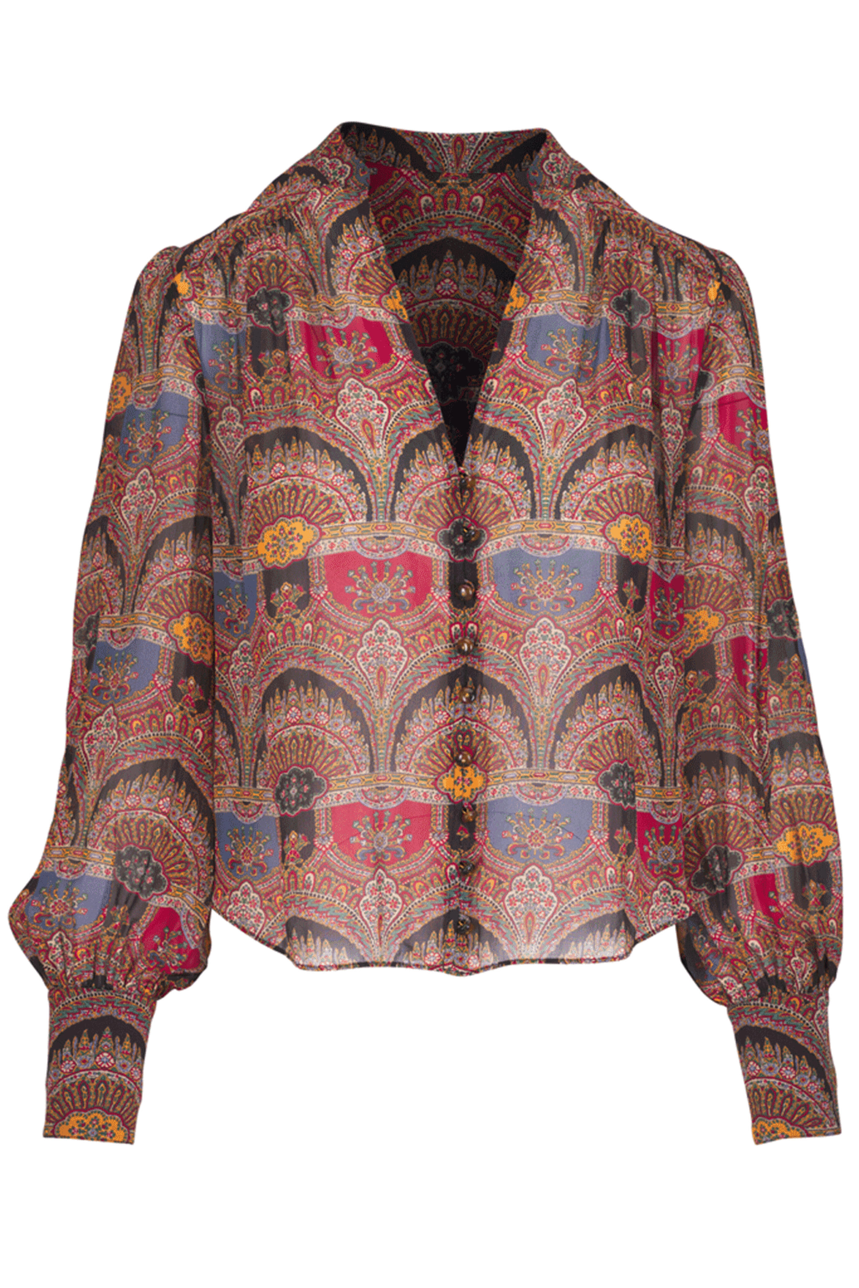 Veronica Beard Dark Chocolate Multicolor Esmeralda Top. V neckline. Long sleeves with button cuffs. Classic fit. Rounded hem. Button-front. 100% silk.