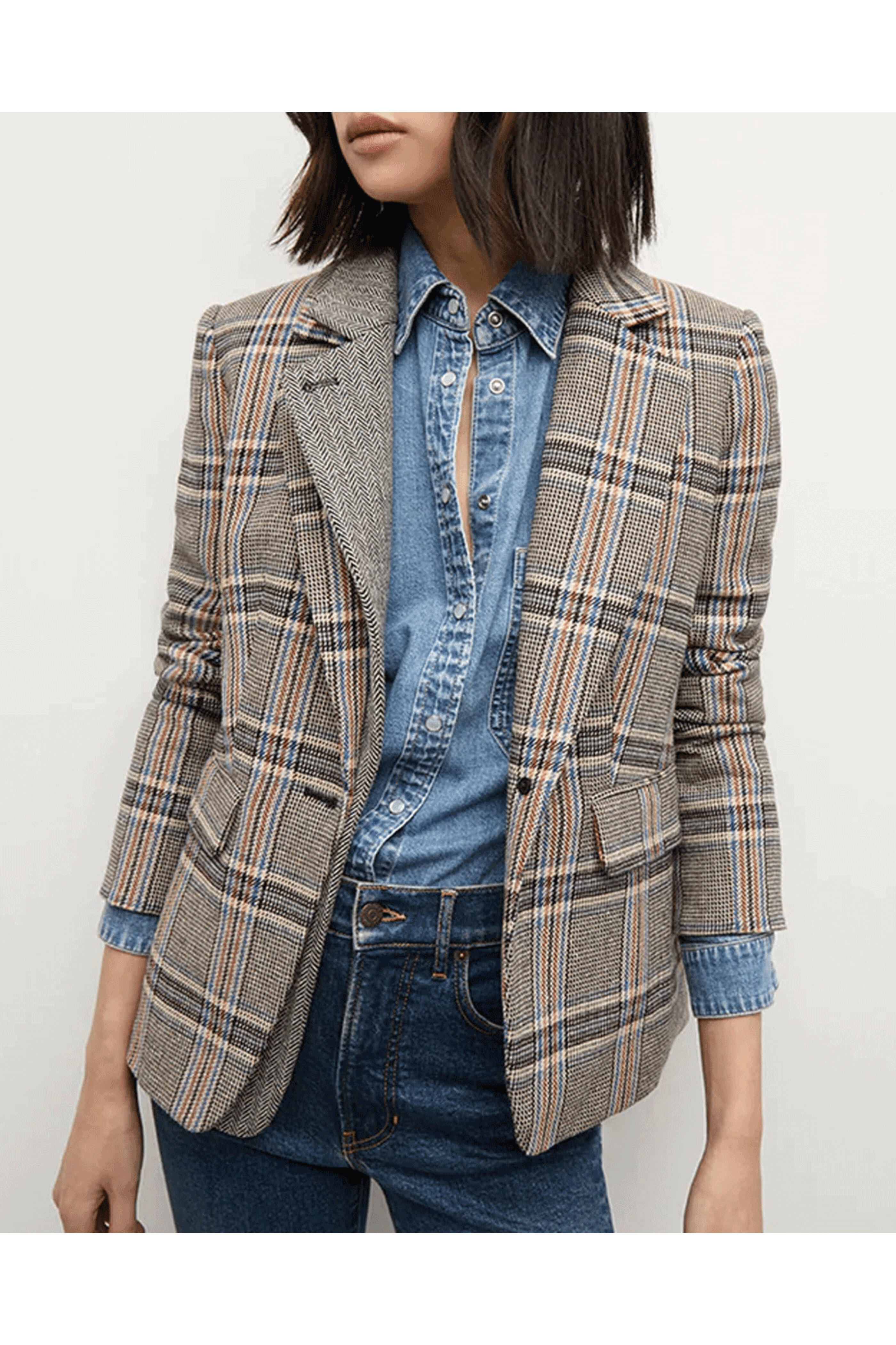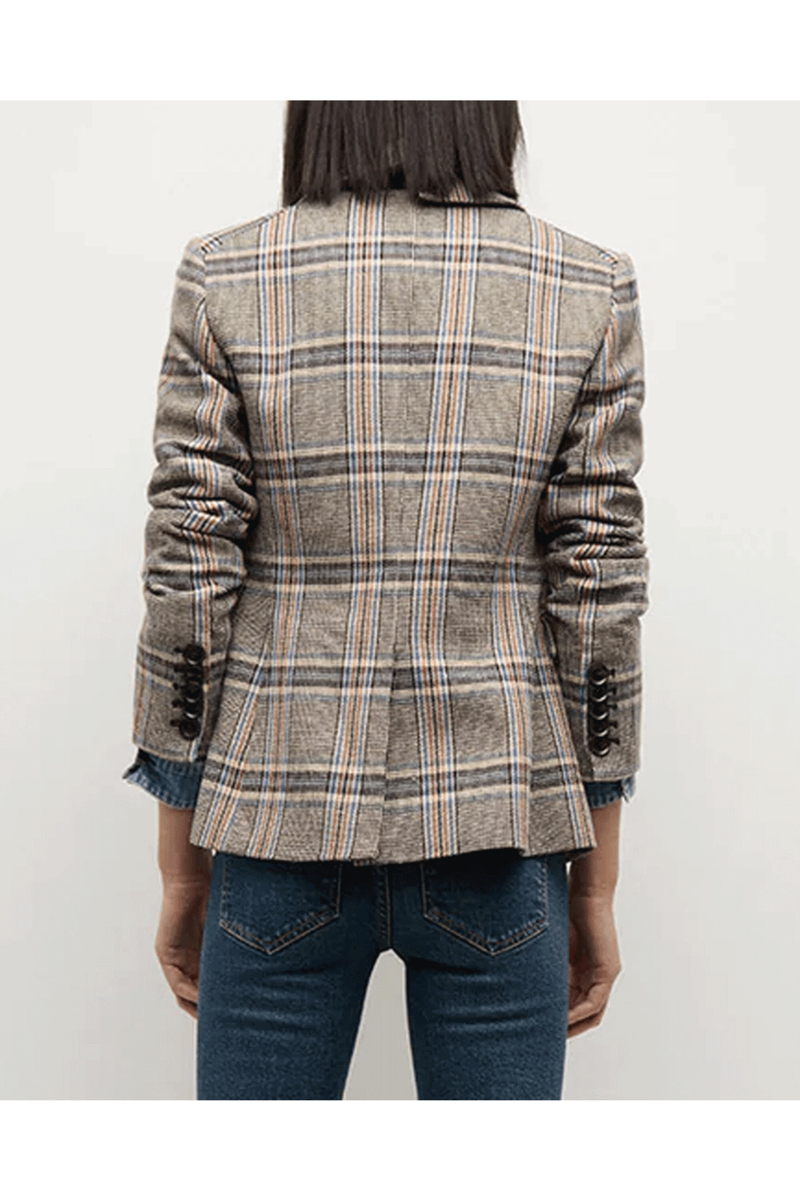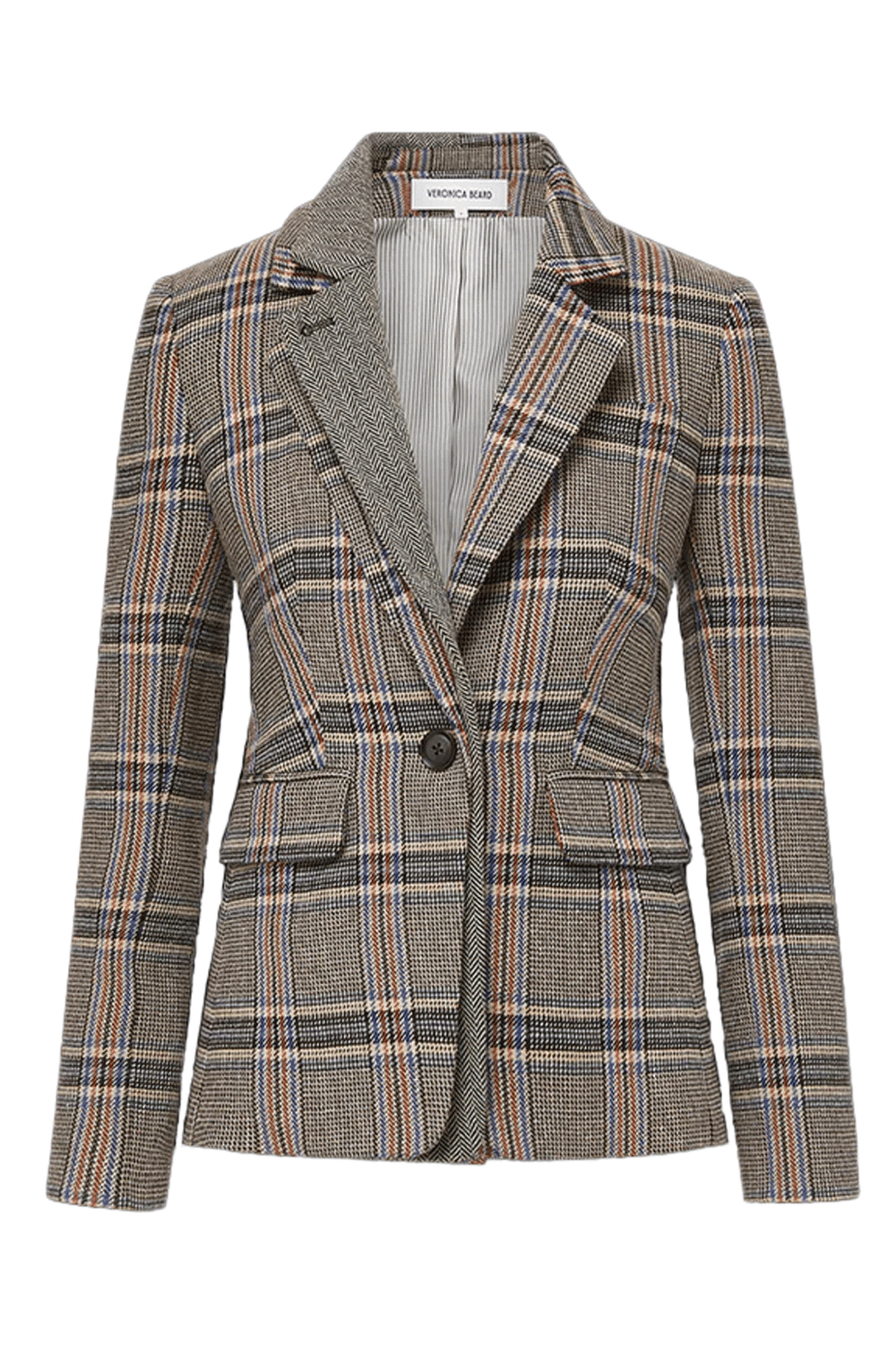 Veronica Beard Black Multi Blythe Jacket. Notch collar. Long sleeves, five-button cuffs. Front one-button closure. Two front flap pockets. Allover plaid design. Center back vent. 40% Acrylic, 33% cotton, 13% polyester, 10% wool, 4% other fibers.