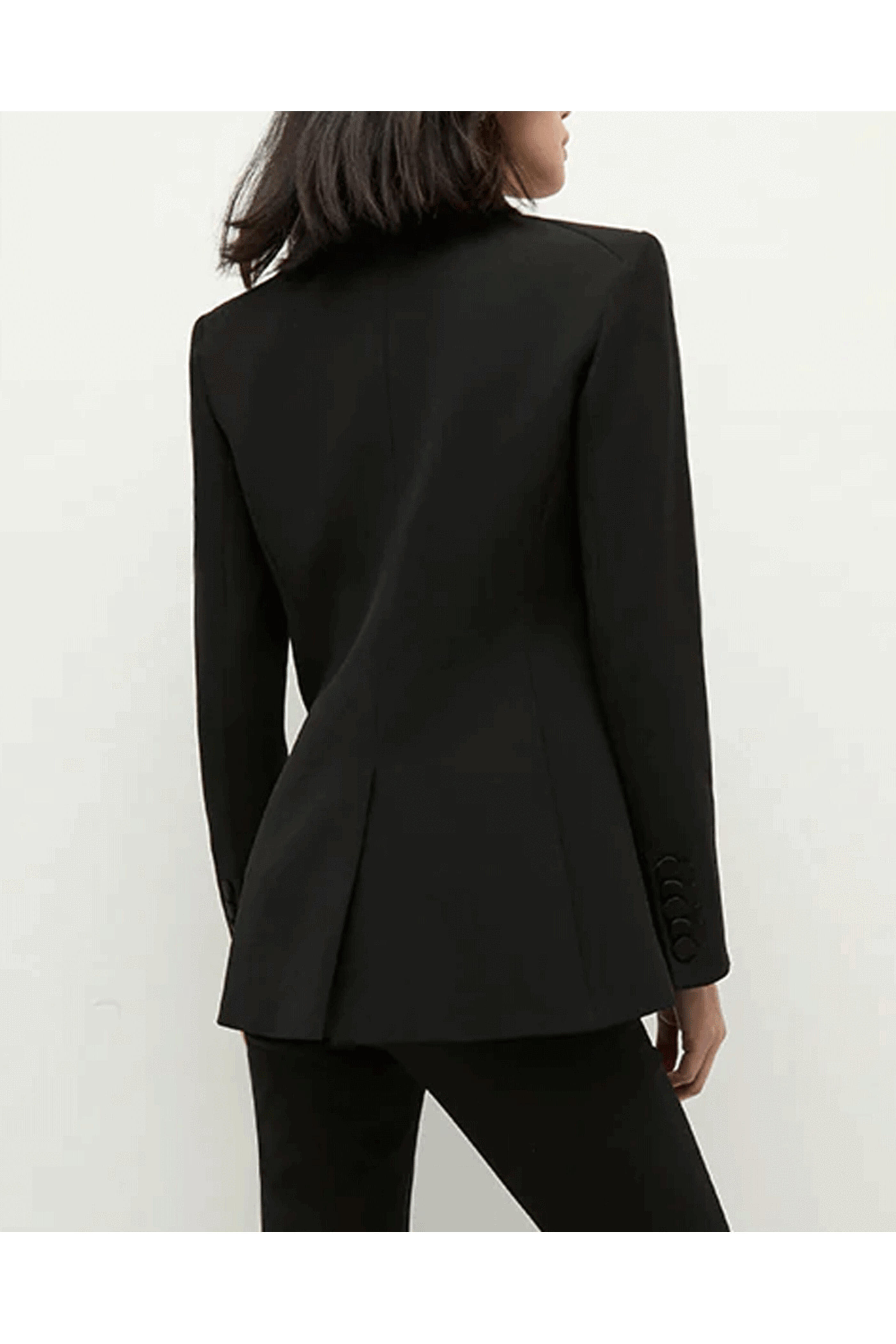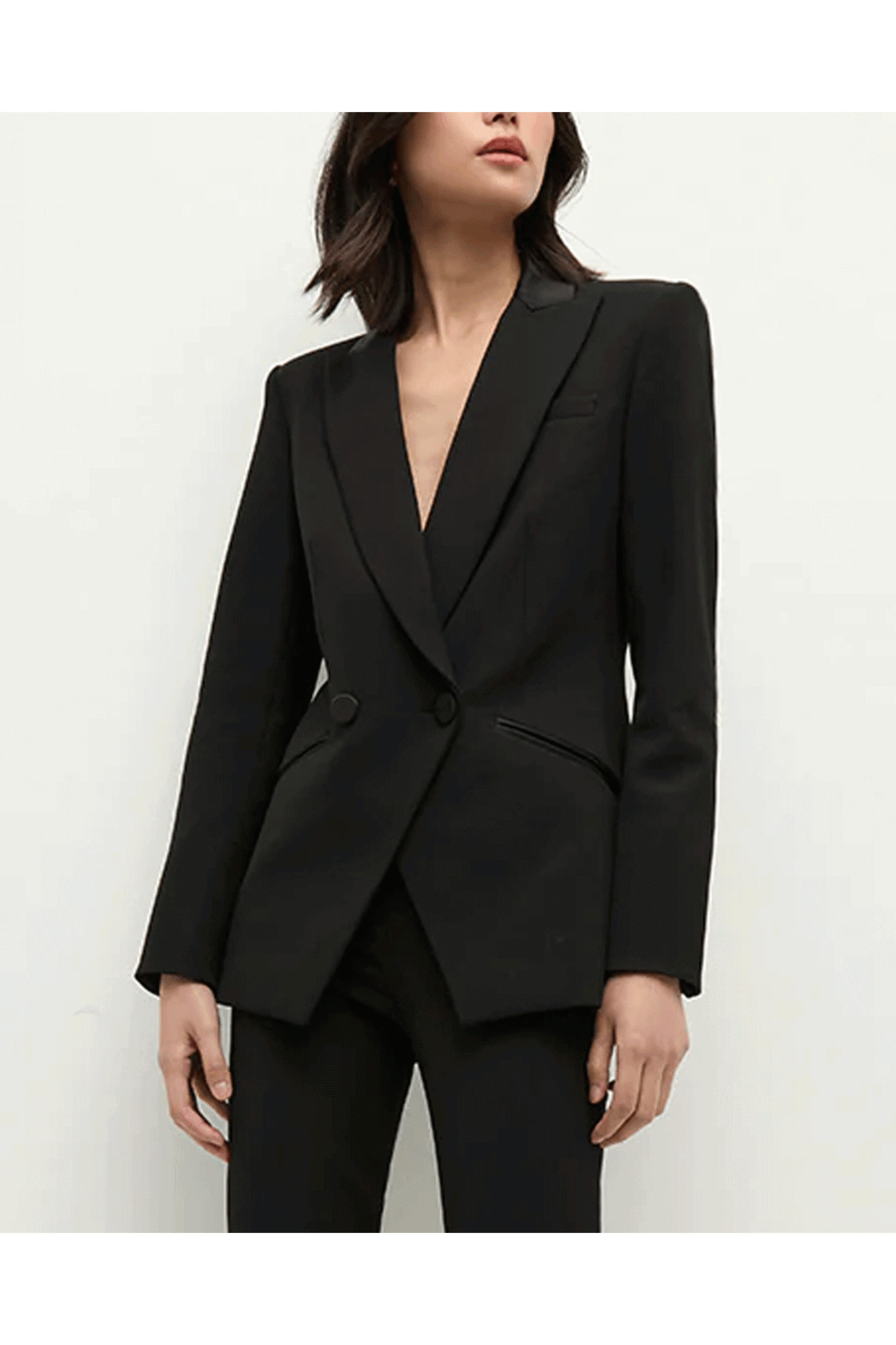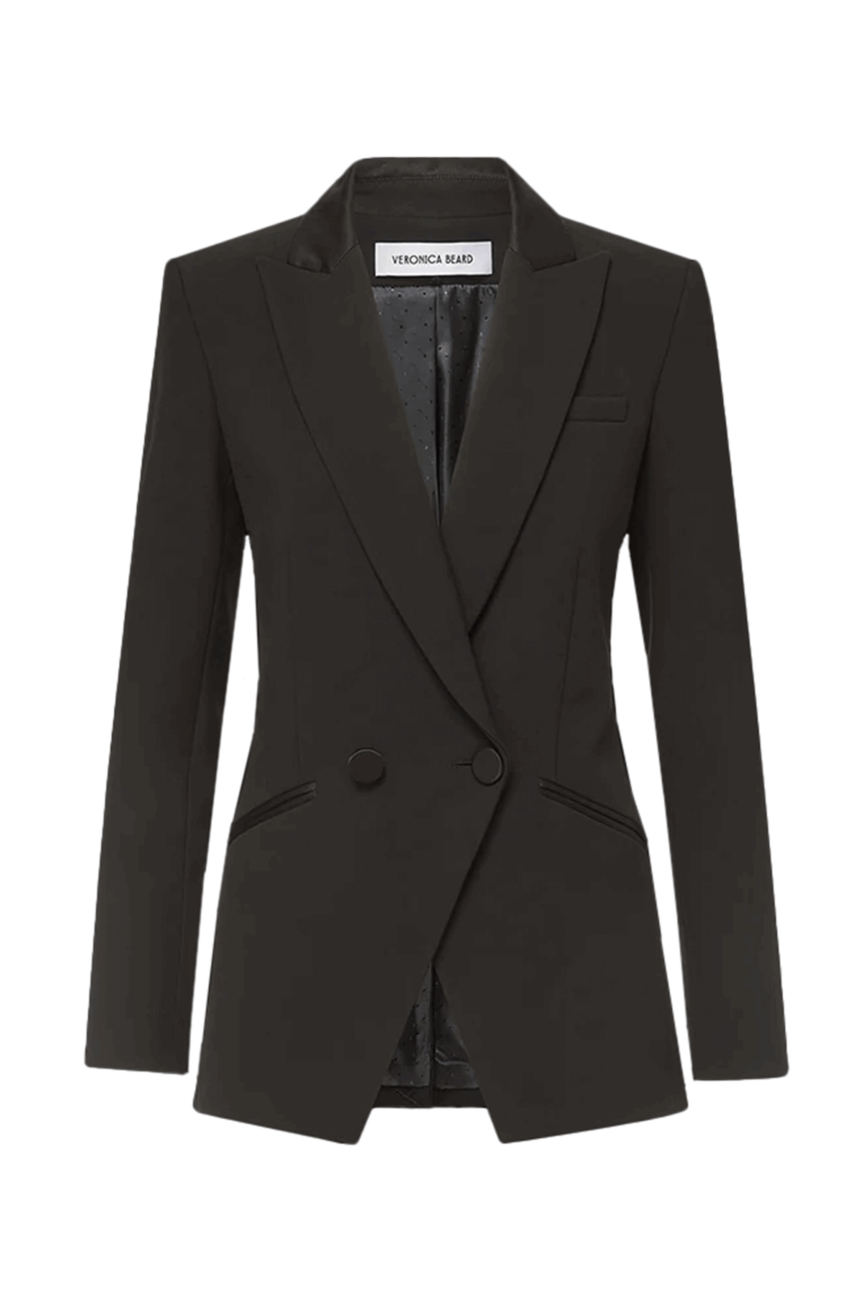 Veronica Beard Black Rickie Dickey Jacket. Peak lapels. Double-breasted front. Long sleeves with button cuffs. Chest and hip welt pockets. Tailored fit. Vented back. Cut-away hem. Button-front. 63% Polyester, 27% Viscose, 7% Cotton, 3% Elastane. Lining: 100% Polyester.