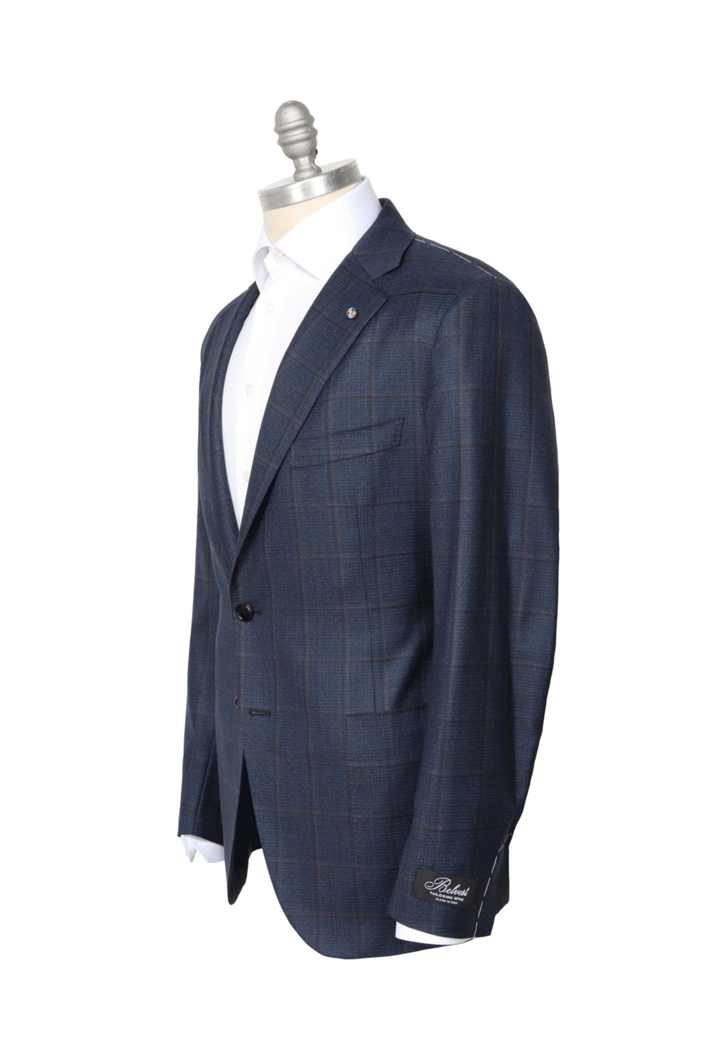 Belvest Navy and Tan Windowpane Sportcoat. Notch lapels . Left lapel buttonhole. Front left welt chest pocket . Button front closure. Waist patch pockets . Unfinished buttonholes . Double back vents . Drop 7 . Fully-lined . Cupro lining. SK exclusive. Made in Italy . 100% wool.