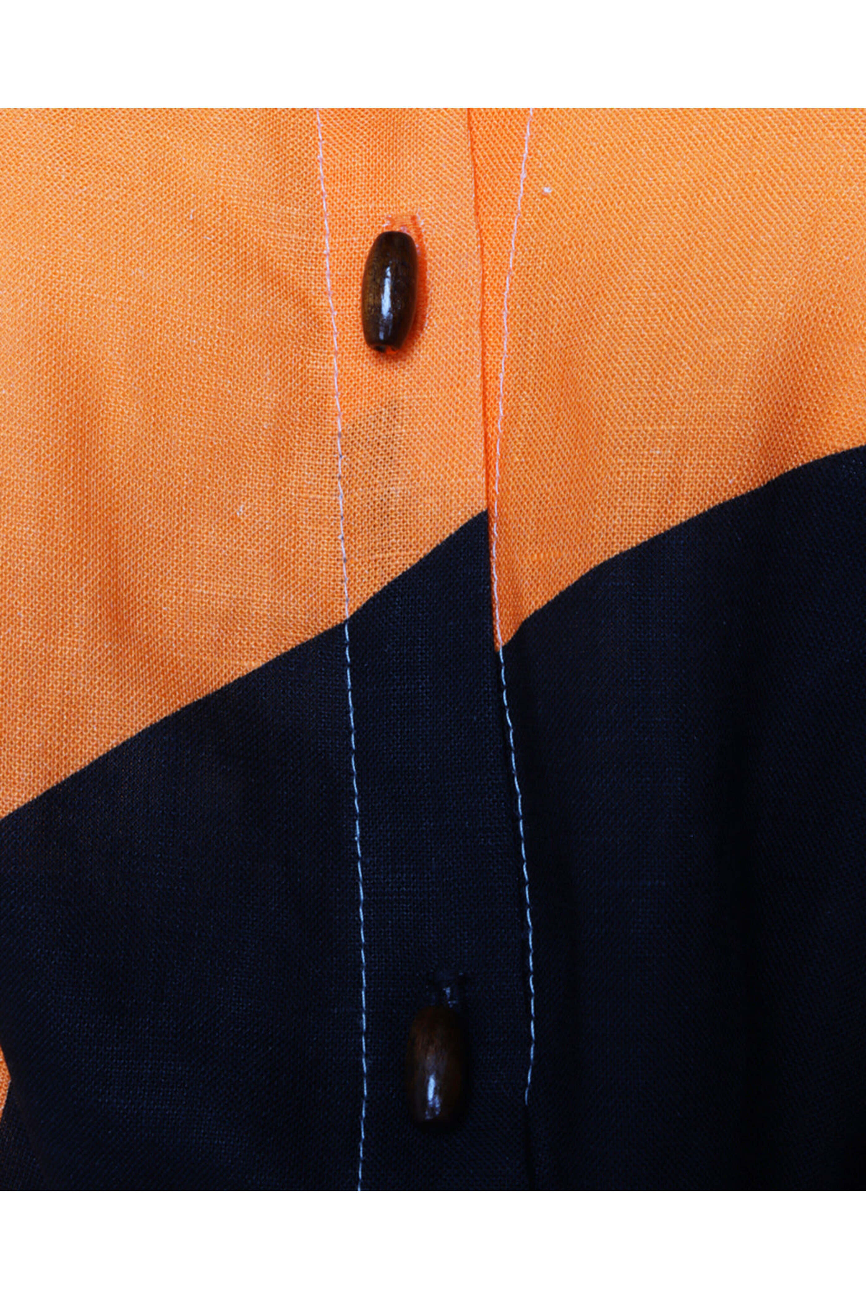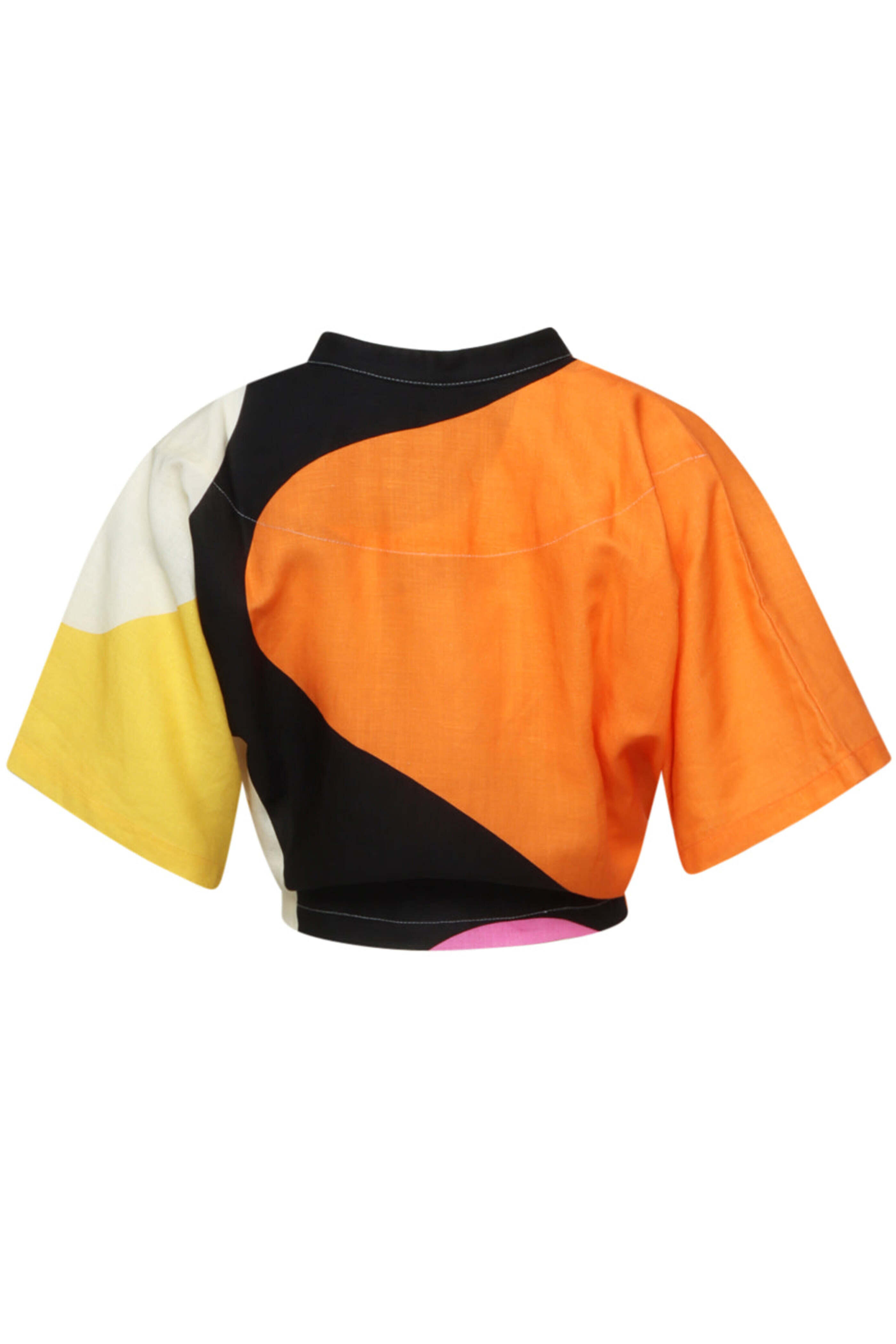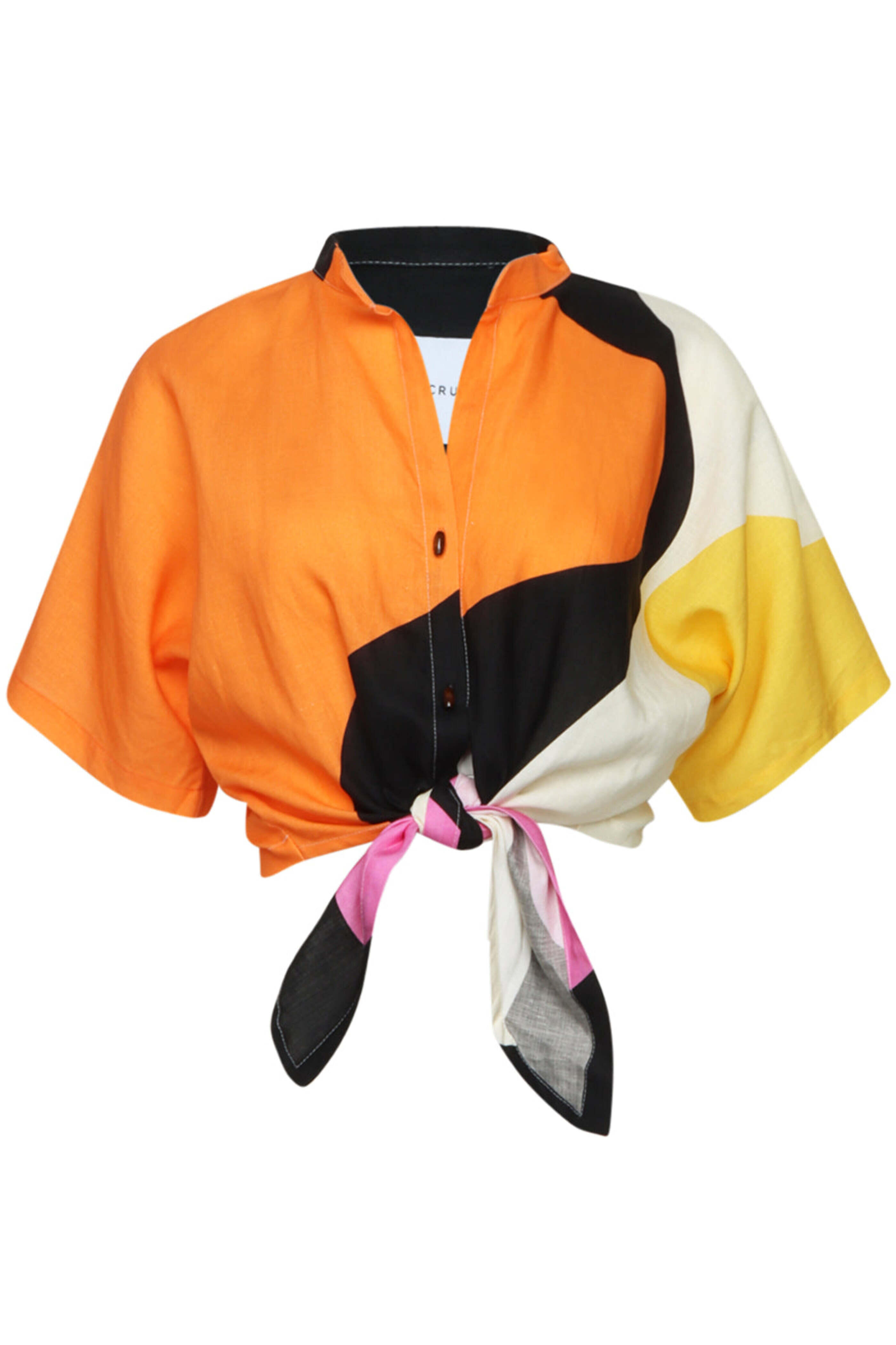 Cala de la Cruz Lavanaran Leroy Top. Banded collar. V neck. Short dolman sleeves. Button front closure. Self-tie hem. Cropped length. Lined. Made in Colombia. *Print placement may vary. 100% linen.
