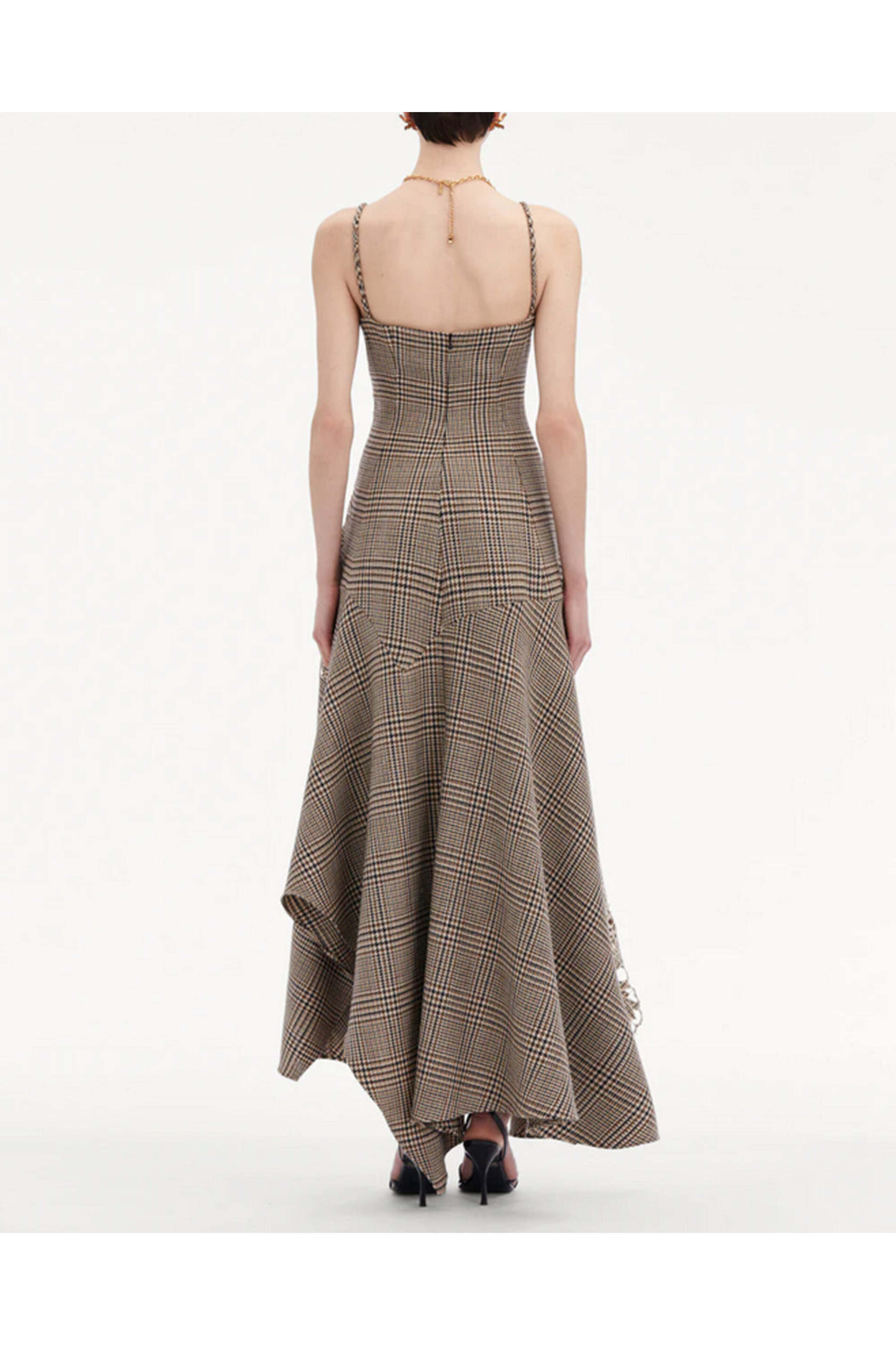 Oscar de la Renta Cocoa Check Peony Guipure Lace Applique Midi Dress. V neck. Square back. Sleeveless. Concealed back zip closure. Slim silhouette. Aline skirt. Handkercheif hem. Midi to maxi length. Guipure lace applique detail. 100% virgin wool outer 1, 100% silk outer 2.