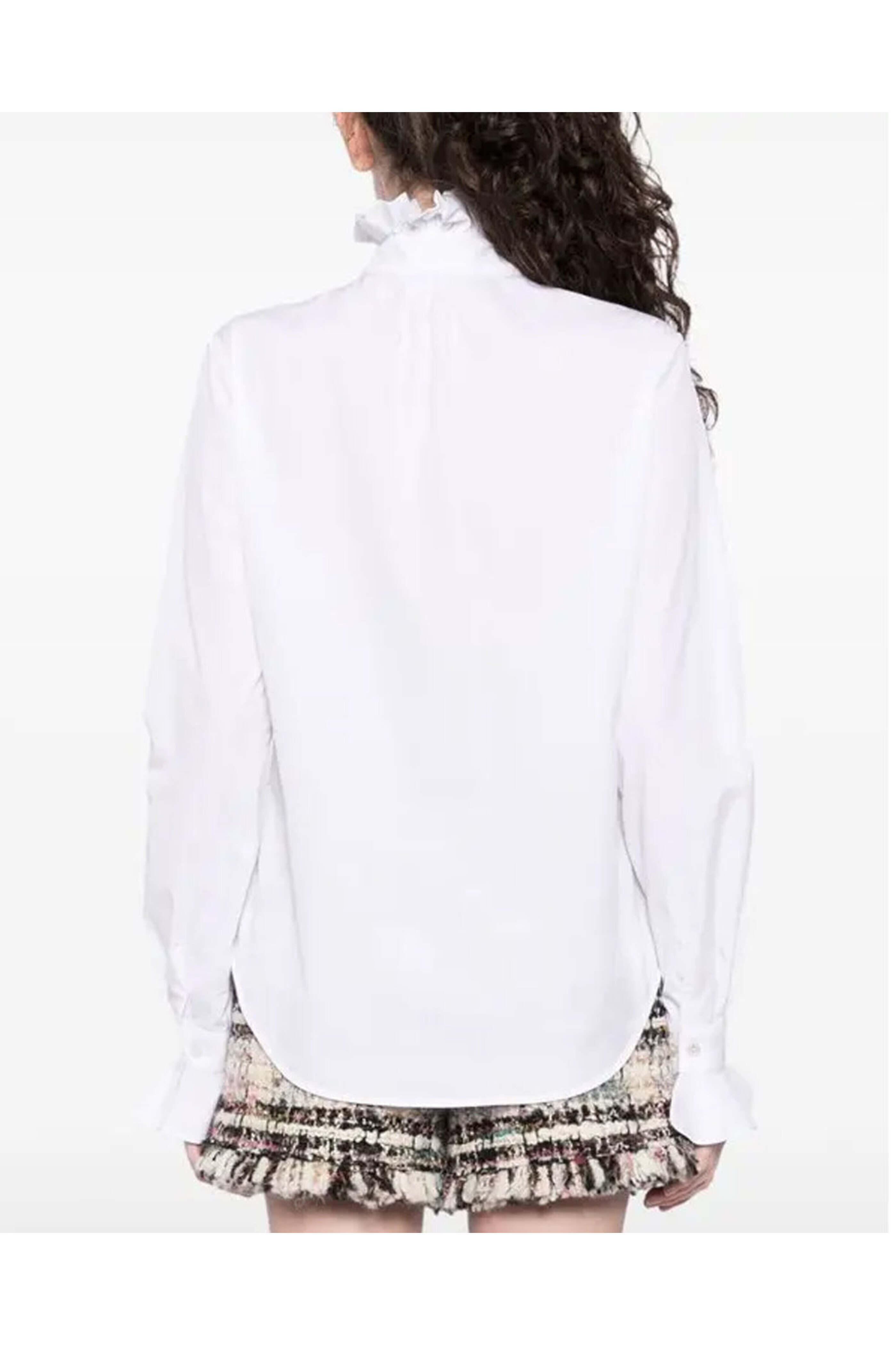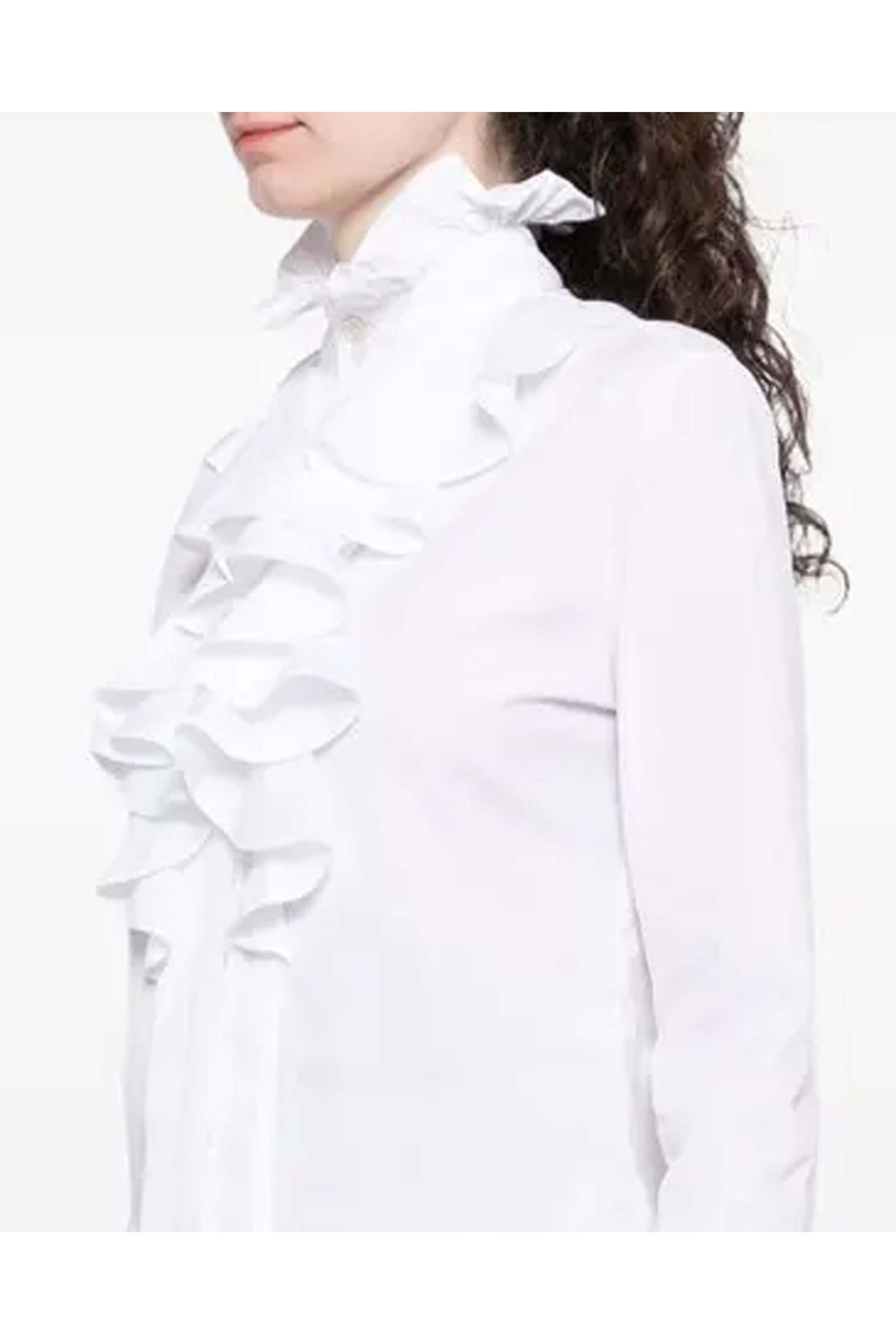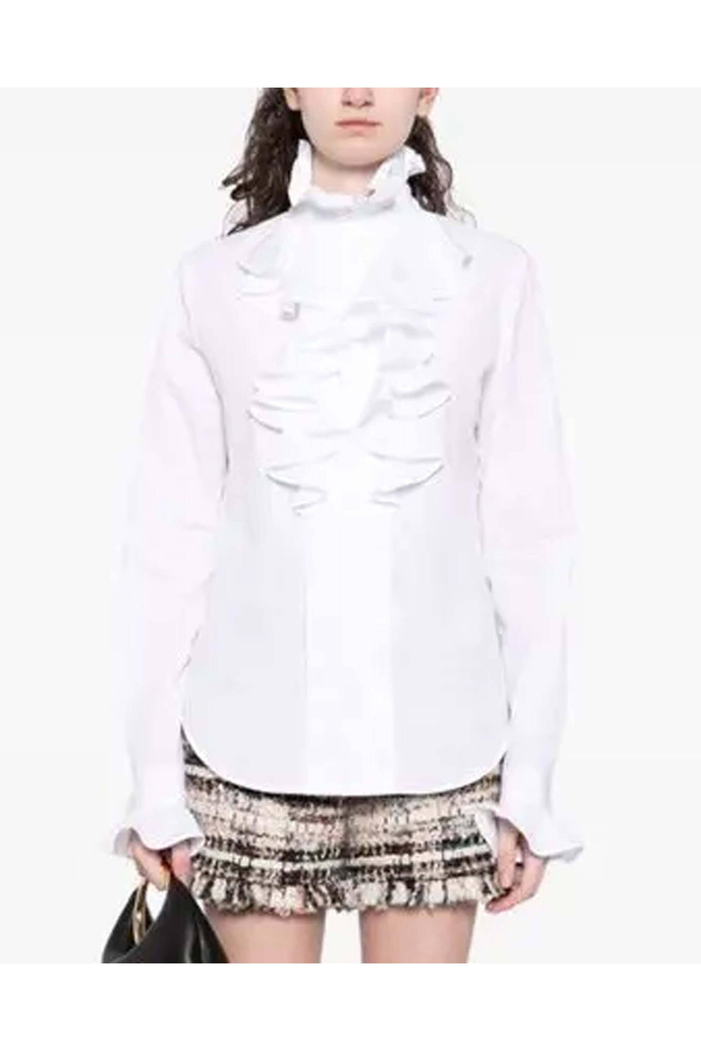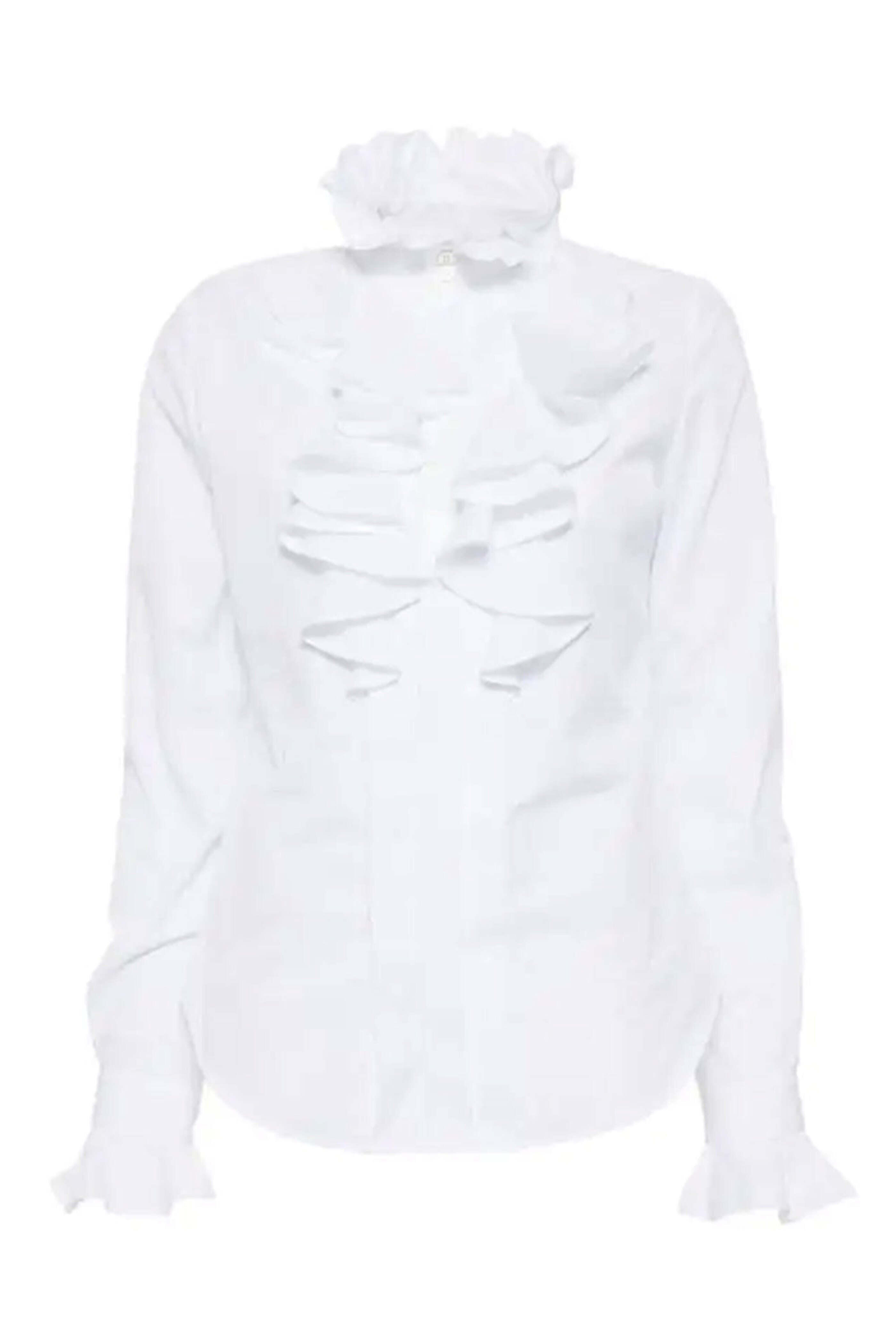 Giambattista Valli Optical White Ruffle Blouse. High ruffle collar. Long sleeves; ruffle button cuffs. Concealed button down front closure. Ruffle placket detail. Relaxed fit. Rounded hem. Made in Italy.