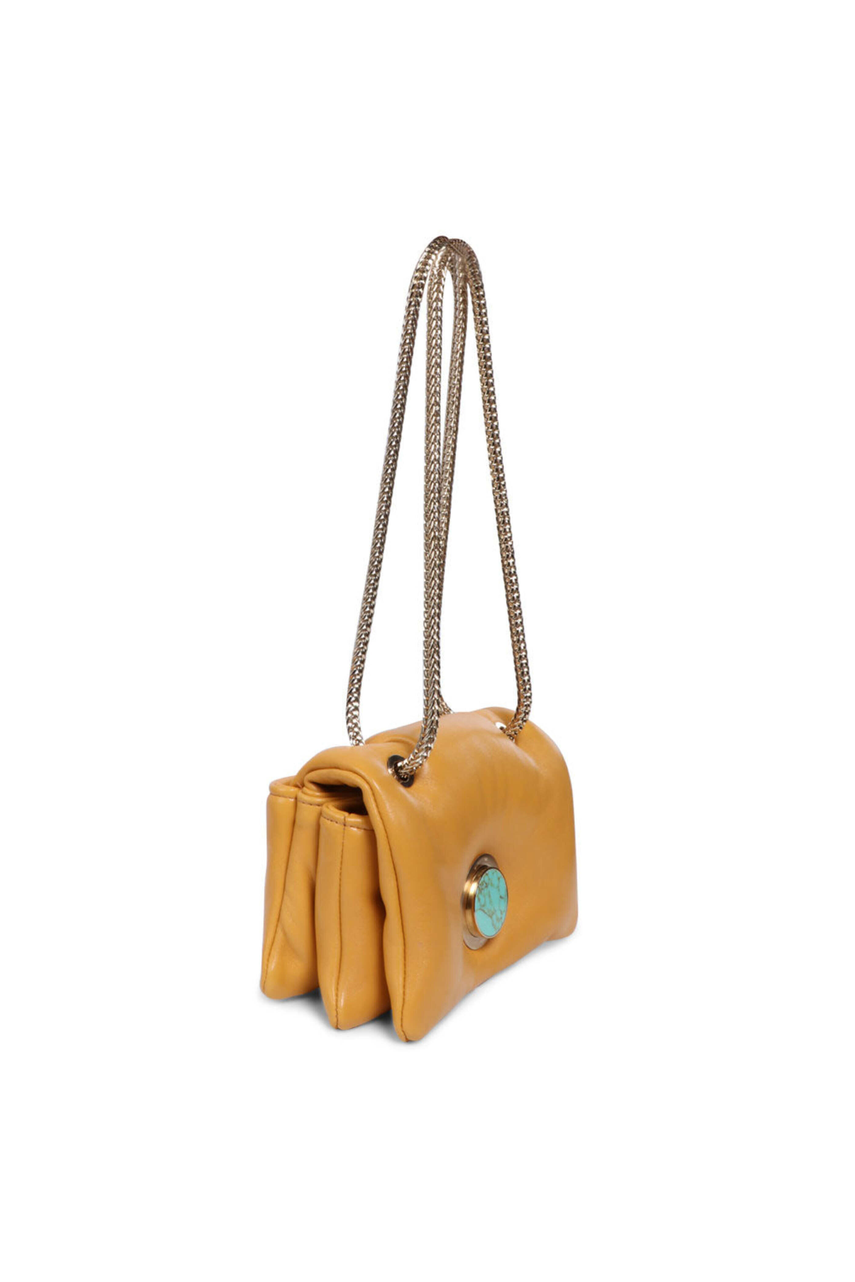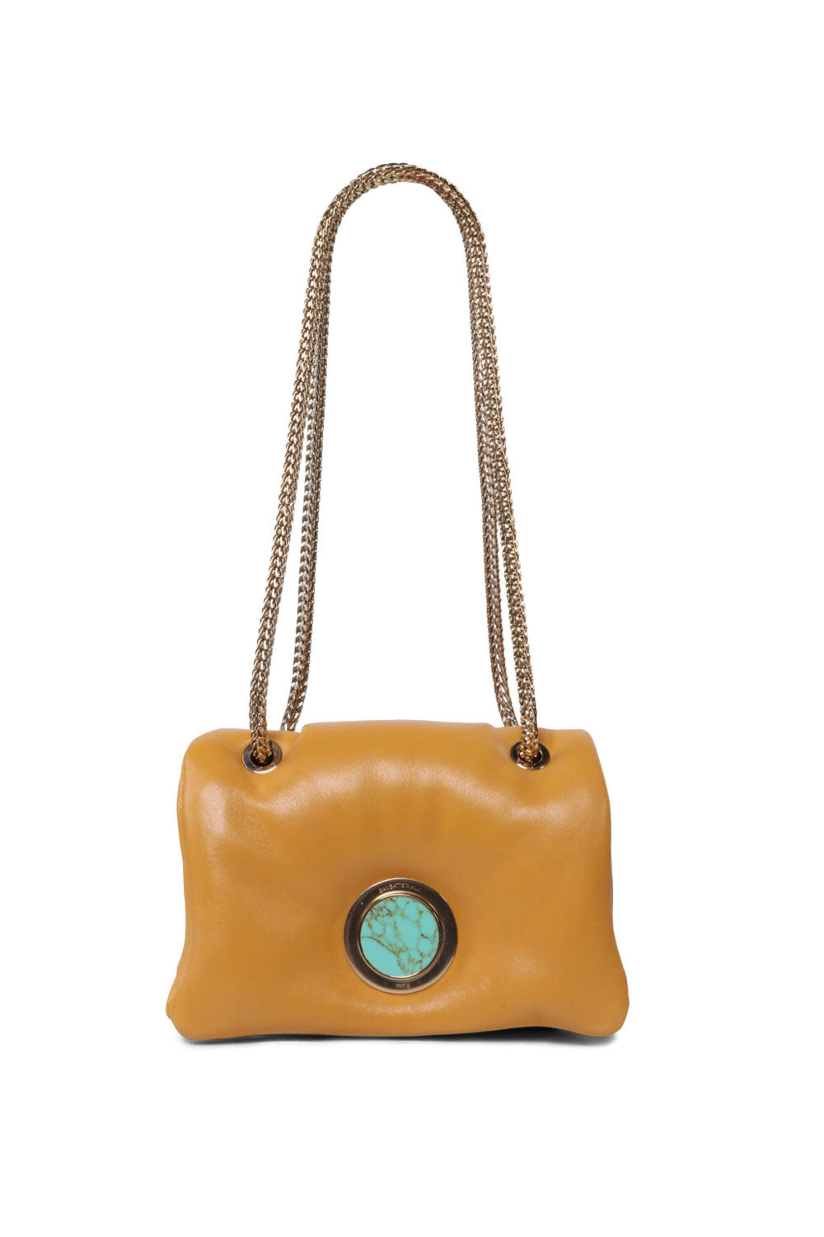 Giambattista Valli Mini Airbag Cushion Bag in Cinnamon. Flat Top with snap closure. Front button open/close closure. Turquoise stone. Metal chain. Double interior pockets. Back exterior pocket. 7.48 x 6.29 x 3.54. Made in Italy.