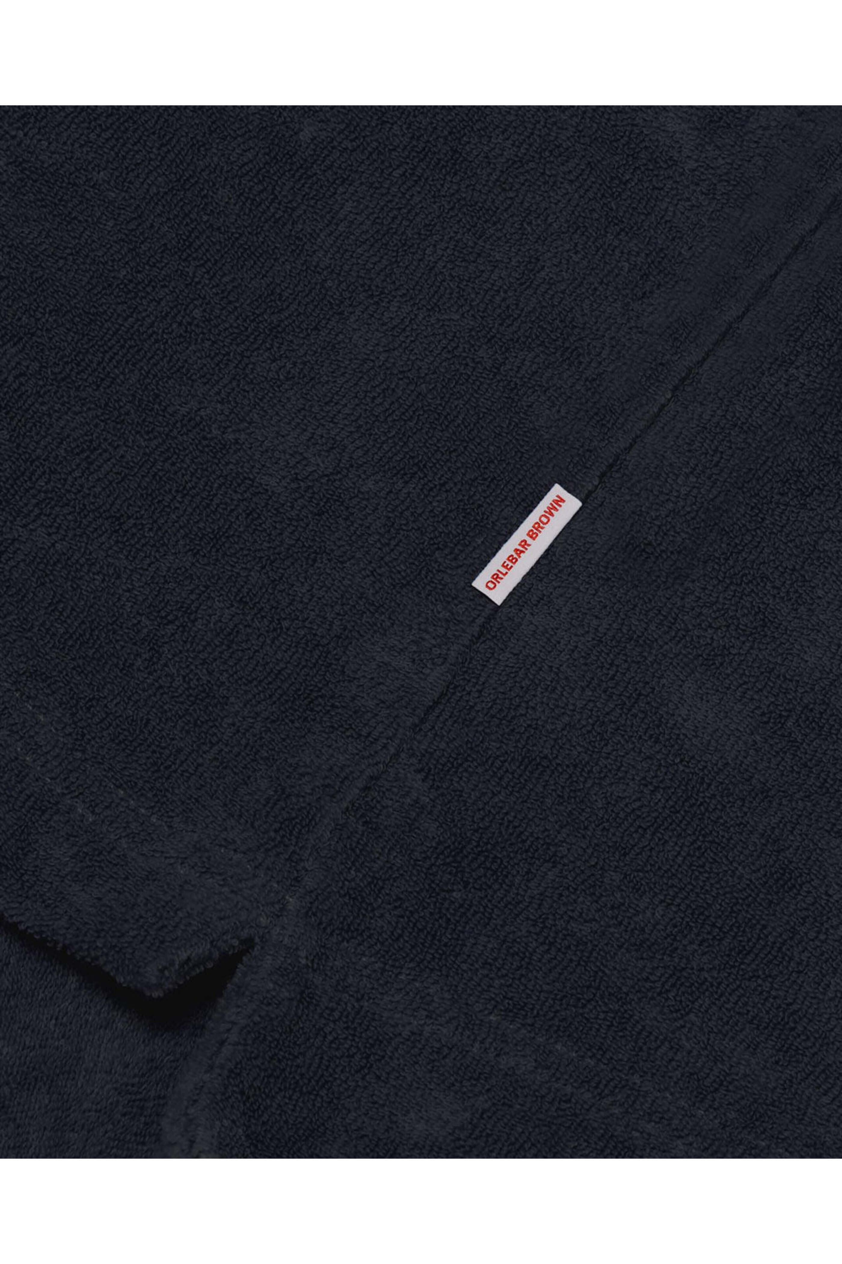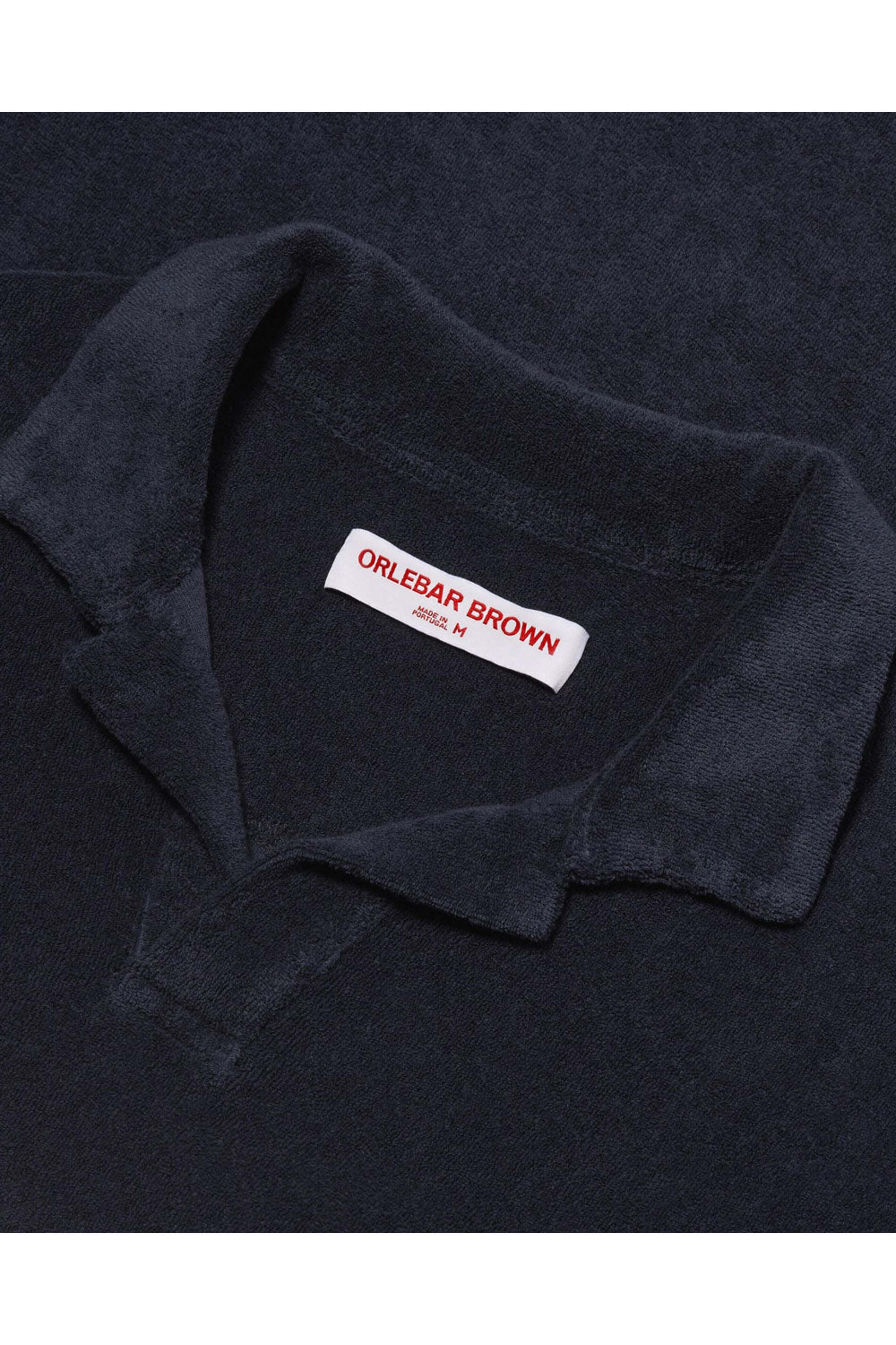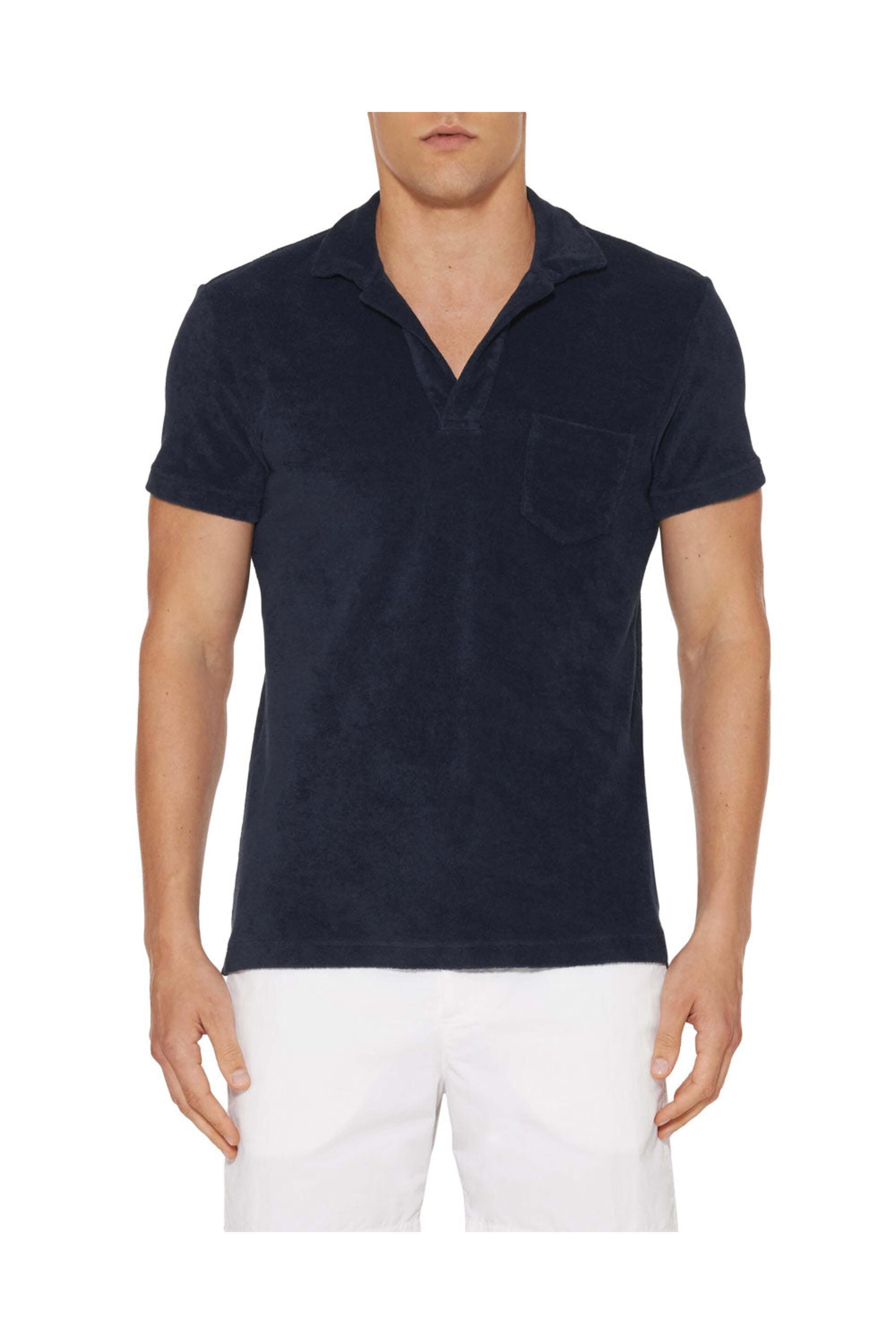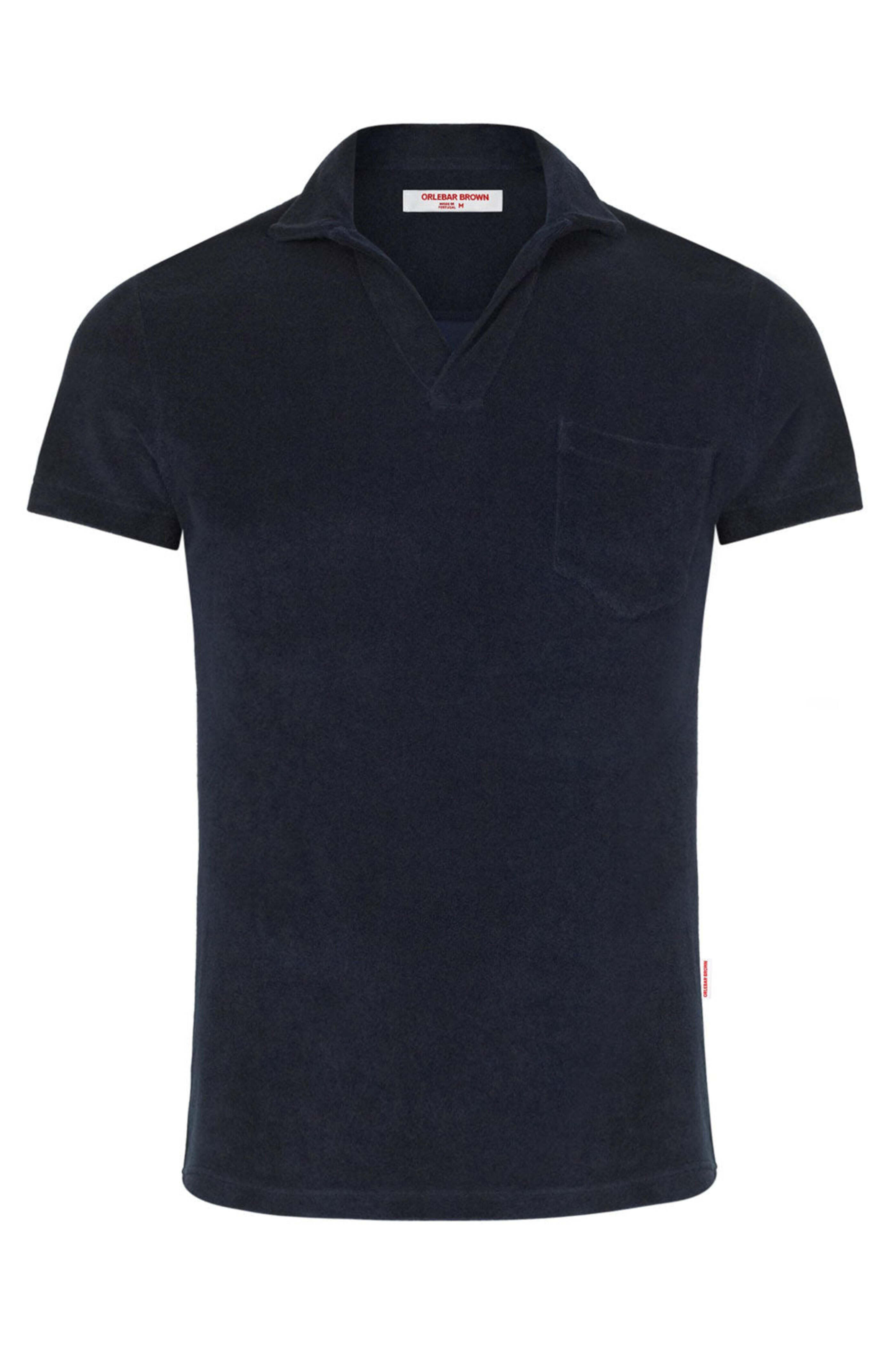 - Orlebar Brown Terry Towelling Resort Polo Shirt in Navy Tailored fit Straight-cut silhouette Extended back hem Mid-weight Notch placket Short sleeves Front left patch chest pocket 100% terry towelling cotton