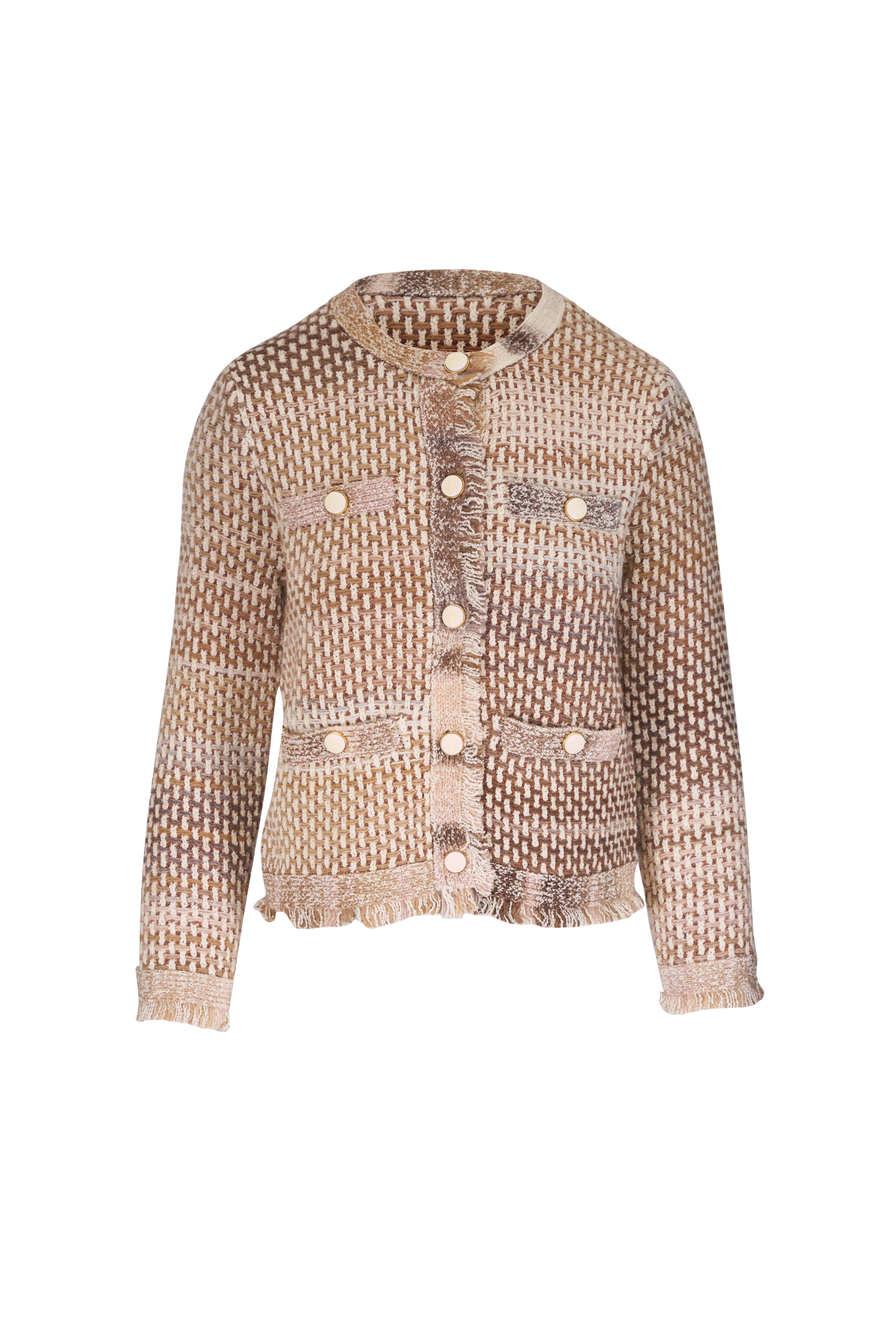 Crew neckline. Front button placket. Lower buttoned welt pockets; faux chest pockets. Fringe trim. Shoulder pads. Imported. Approximately 21" shoulder to hem (measurements taken from size XS). 69% cotton, 11% wool, 11% acrylic, 9% polyamide. Dry clean.