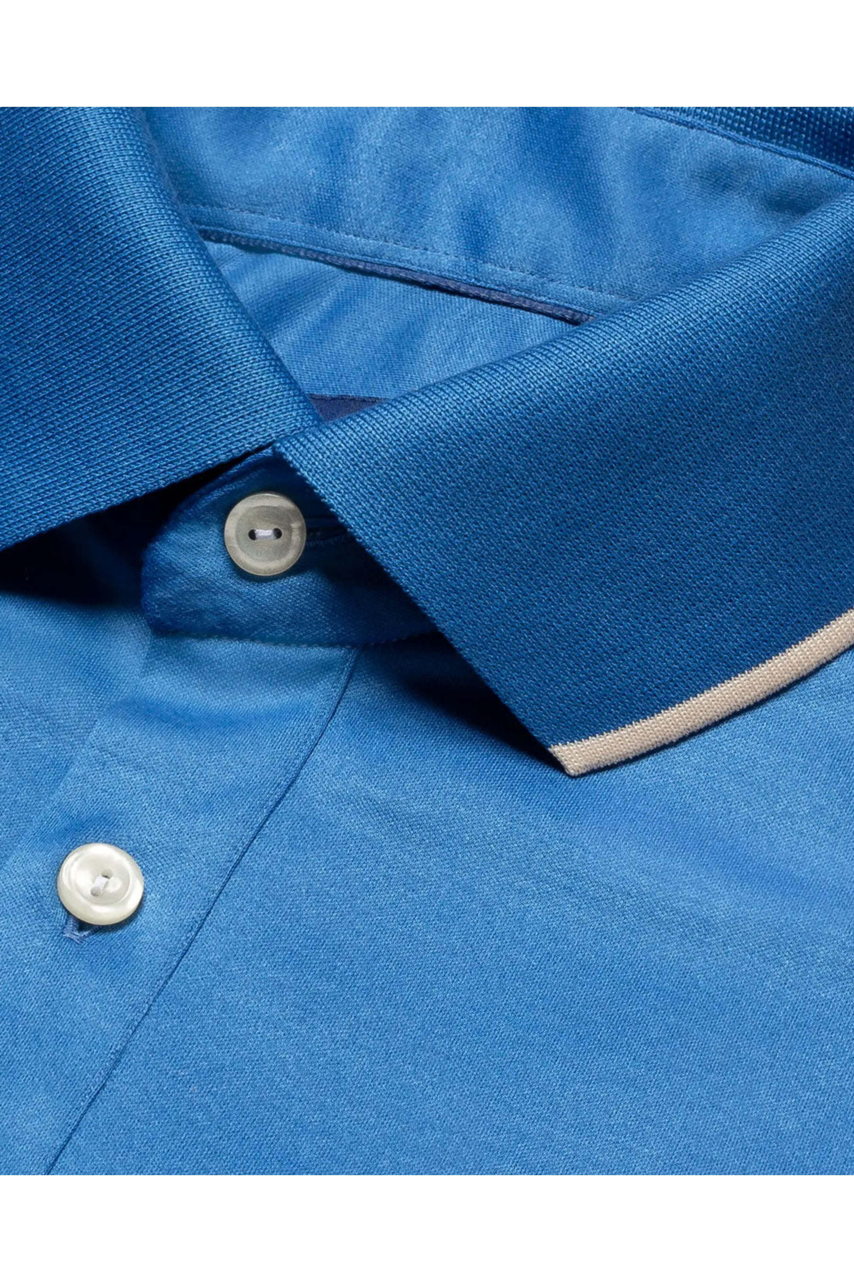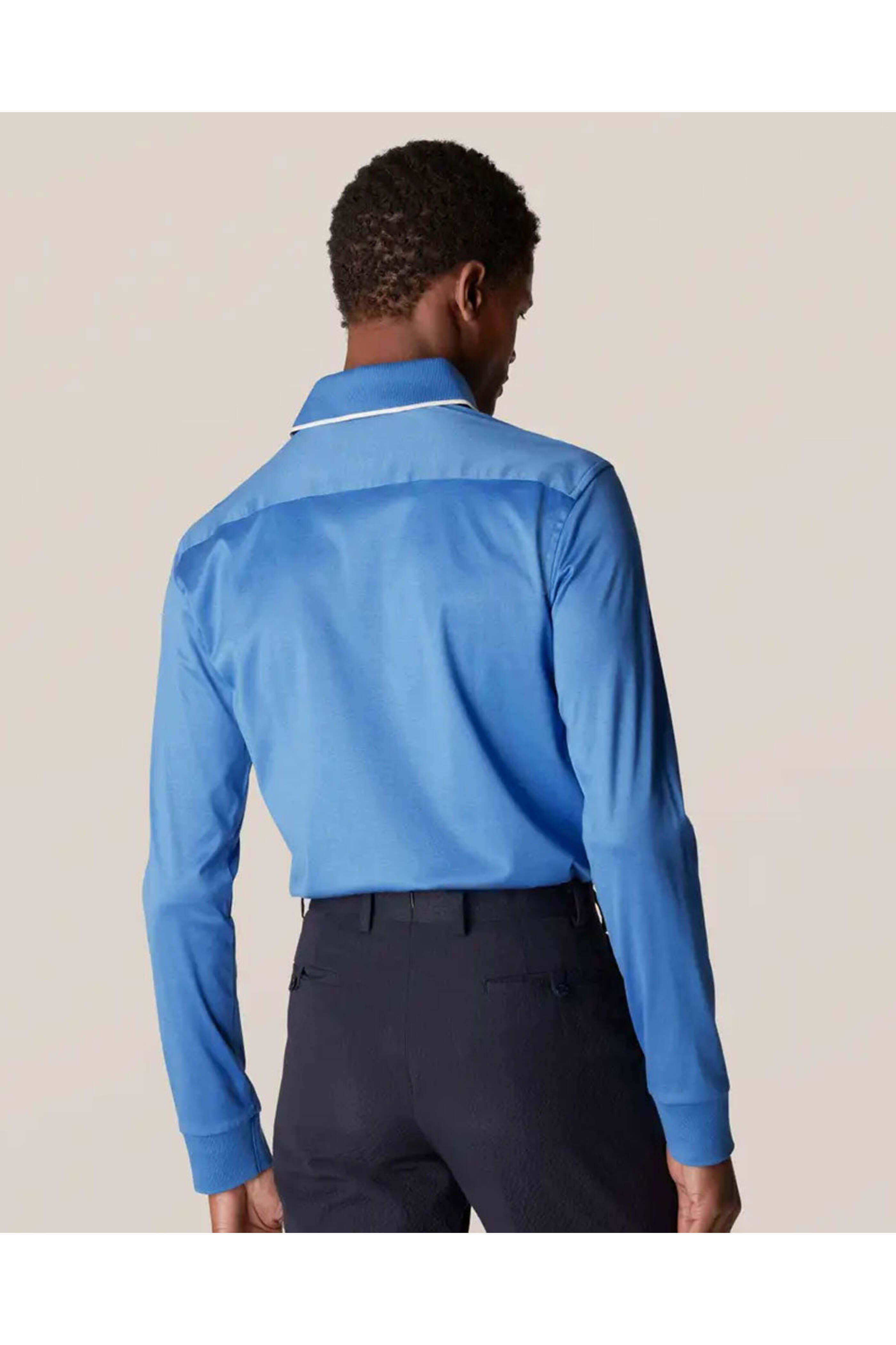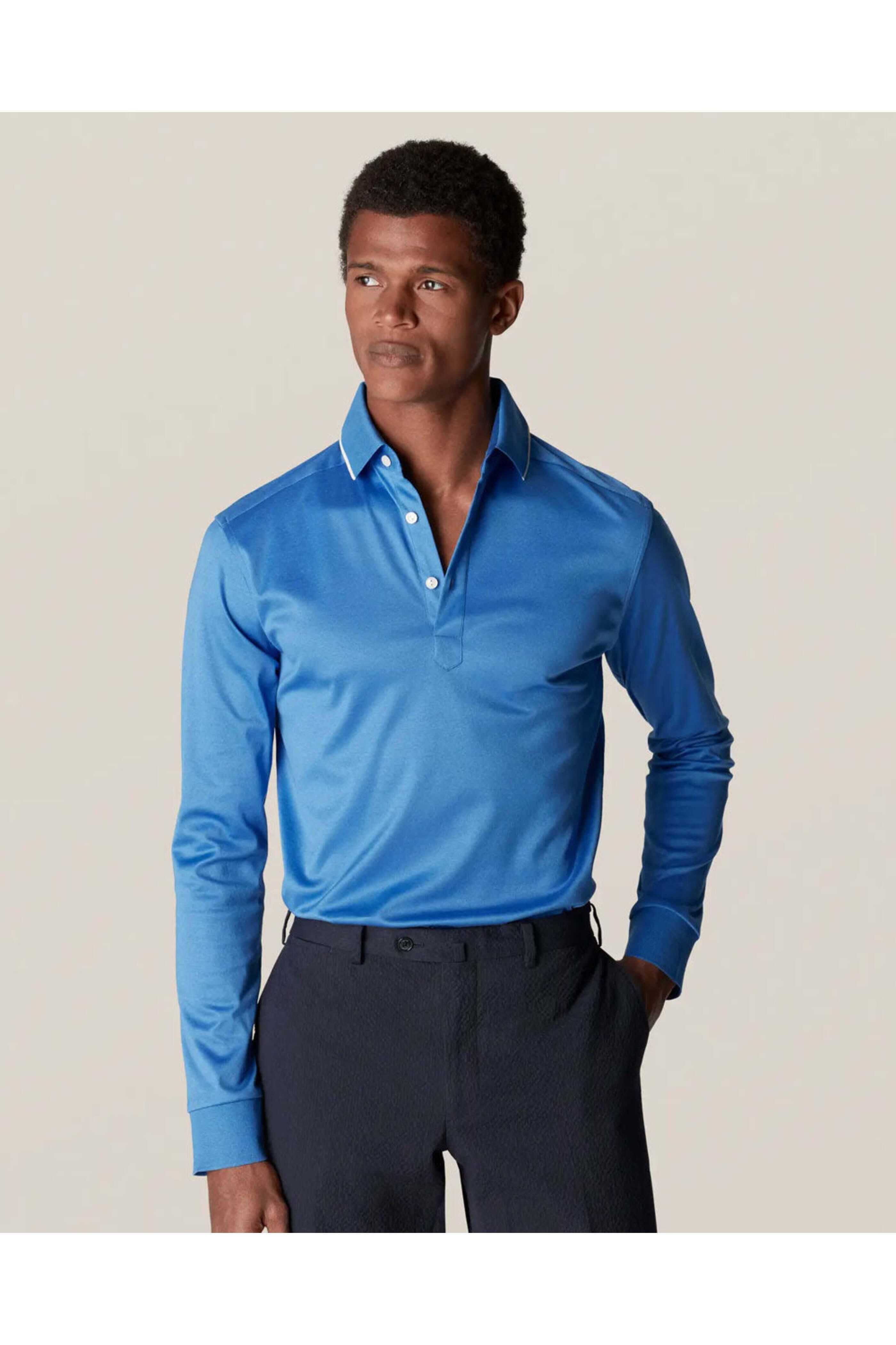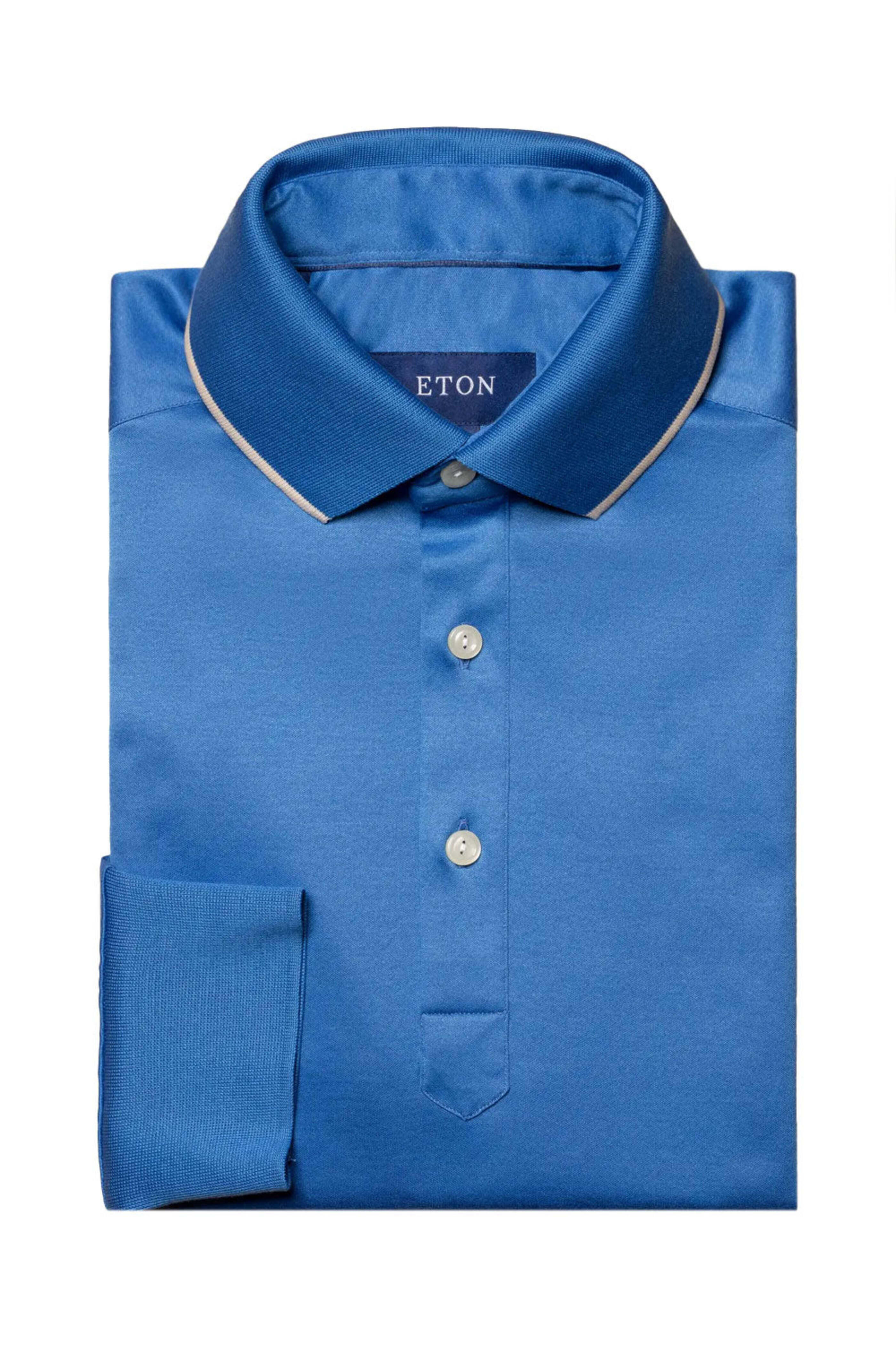 Eton Blue Filo di Scozia Popover Shirt. Knit collar. Long sleeve. Button placket. Knit cuff. Contemporary fit. Rich knit Filo di Scozia fabric. 100% cotton.